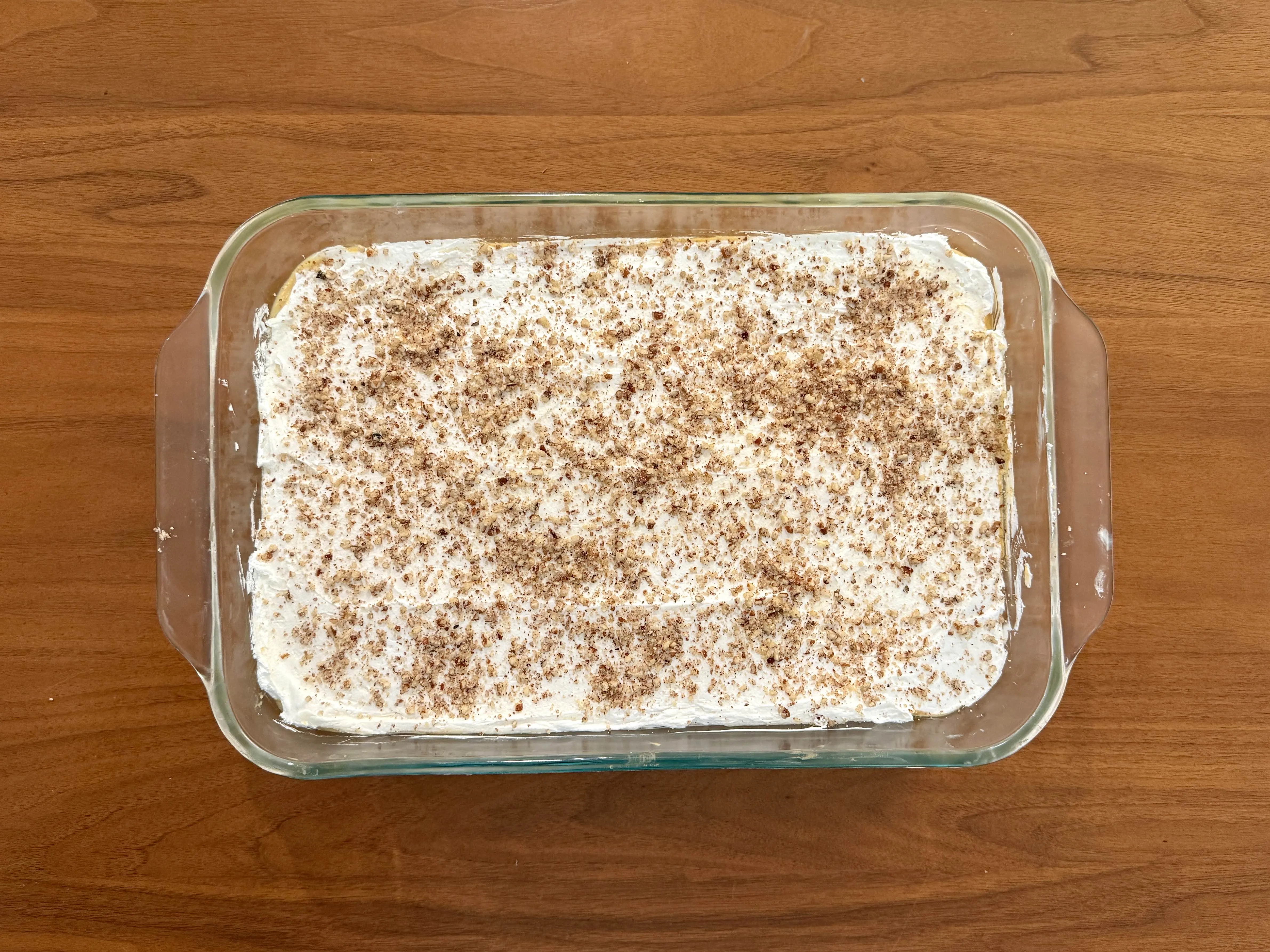 A glass baking dish full of an icebox-style dessert with whipped cream on top and cocoa and cinnamon scattered like dust.
