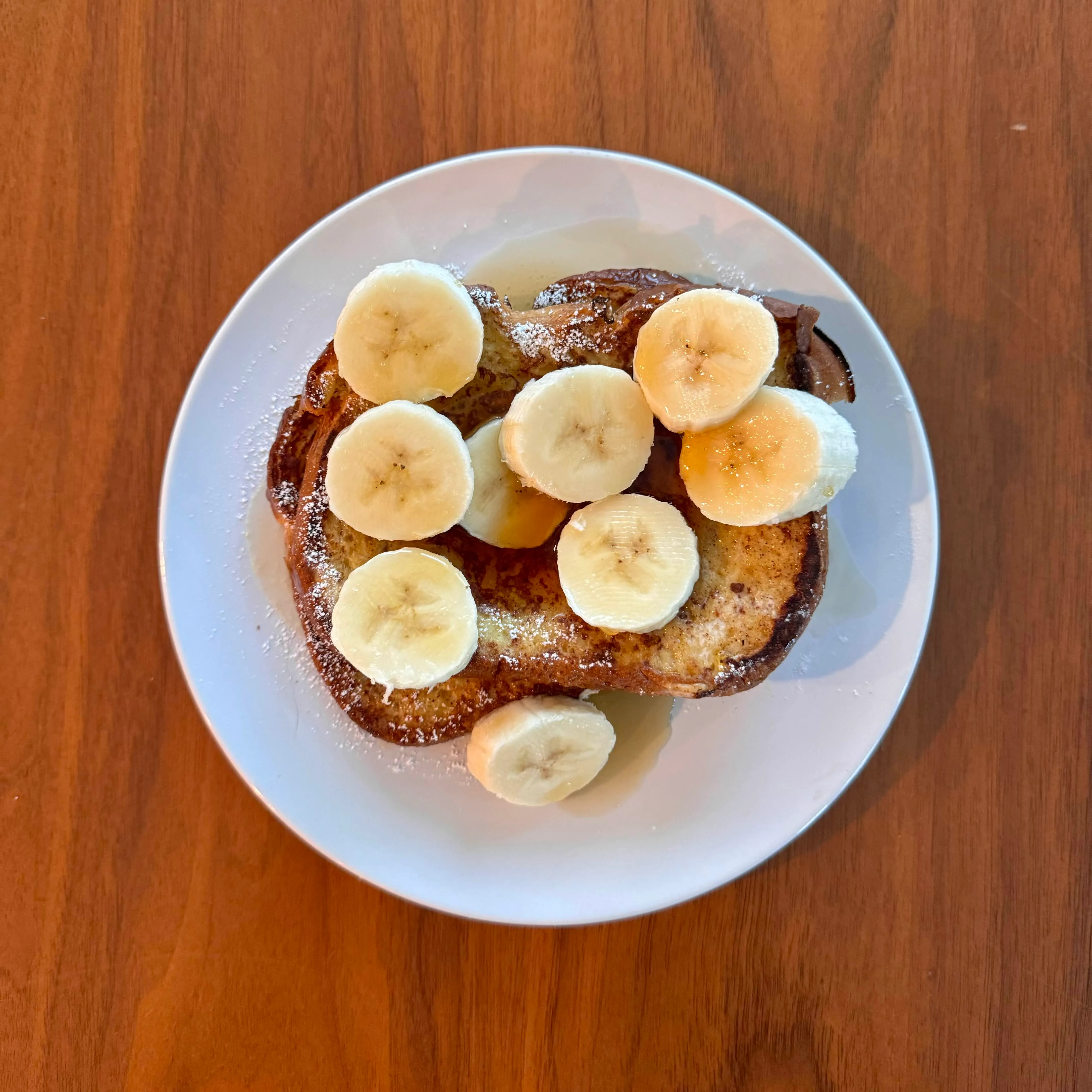 A thick slice of french toast piled with banana coins, powdered sugar, and syrup - a Thursday breakfast that felt like a Saturday.