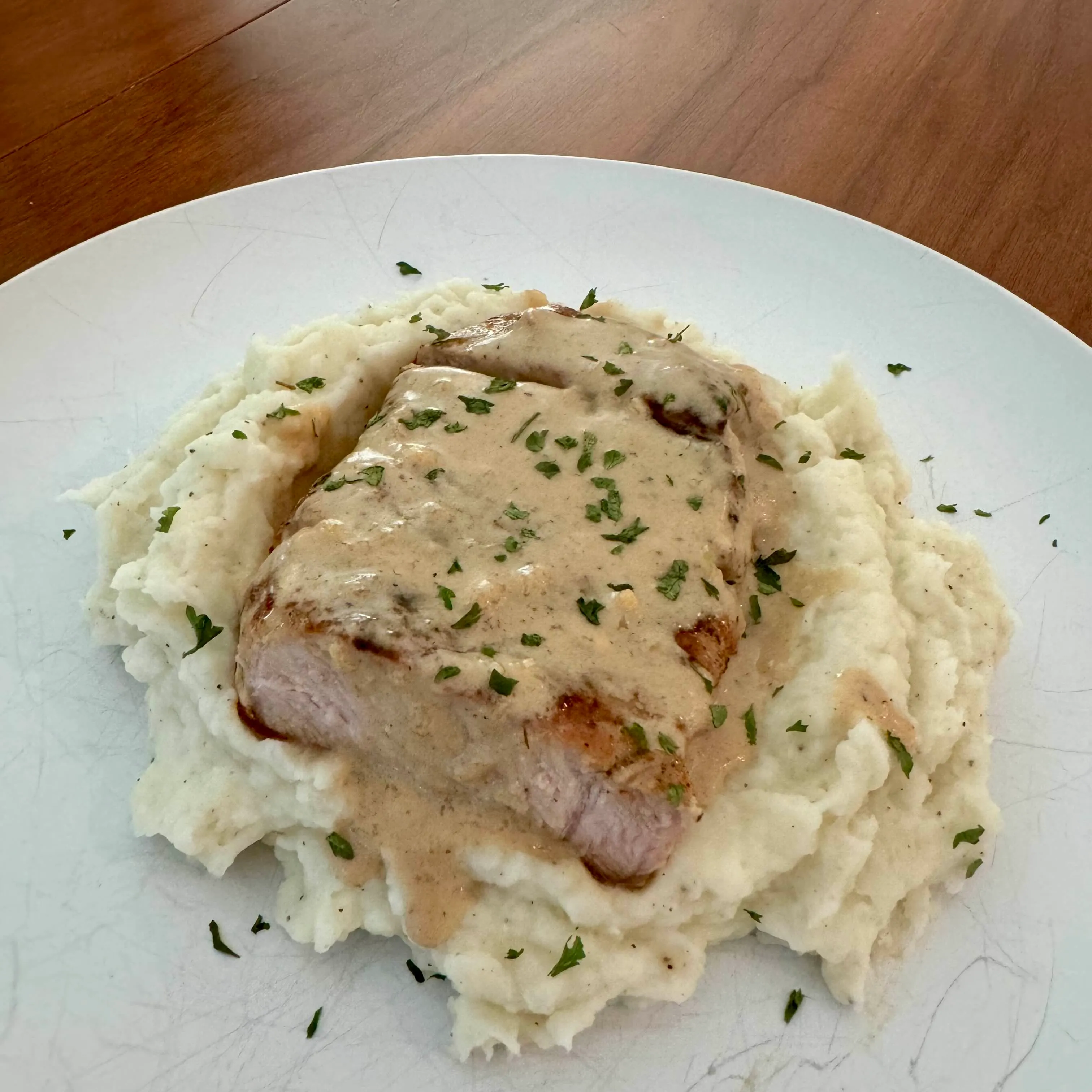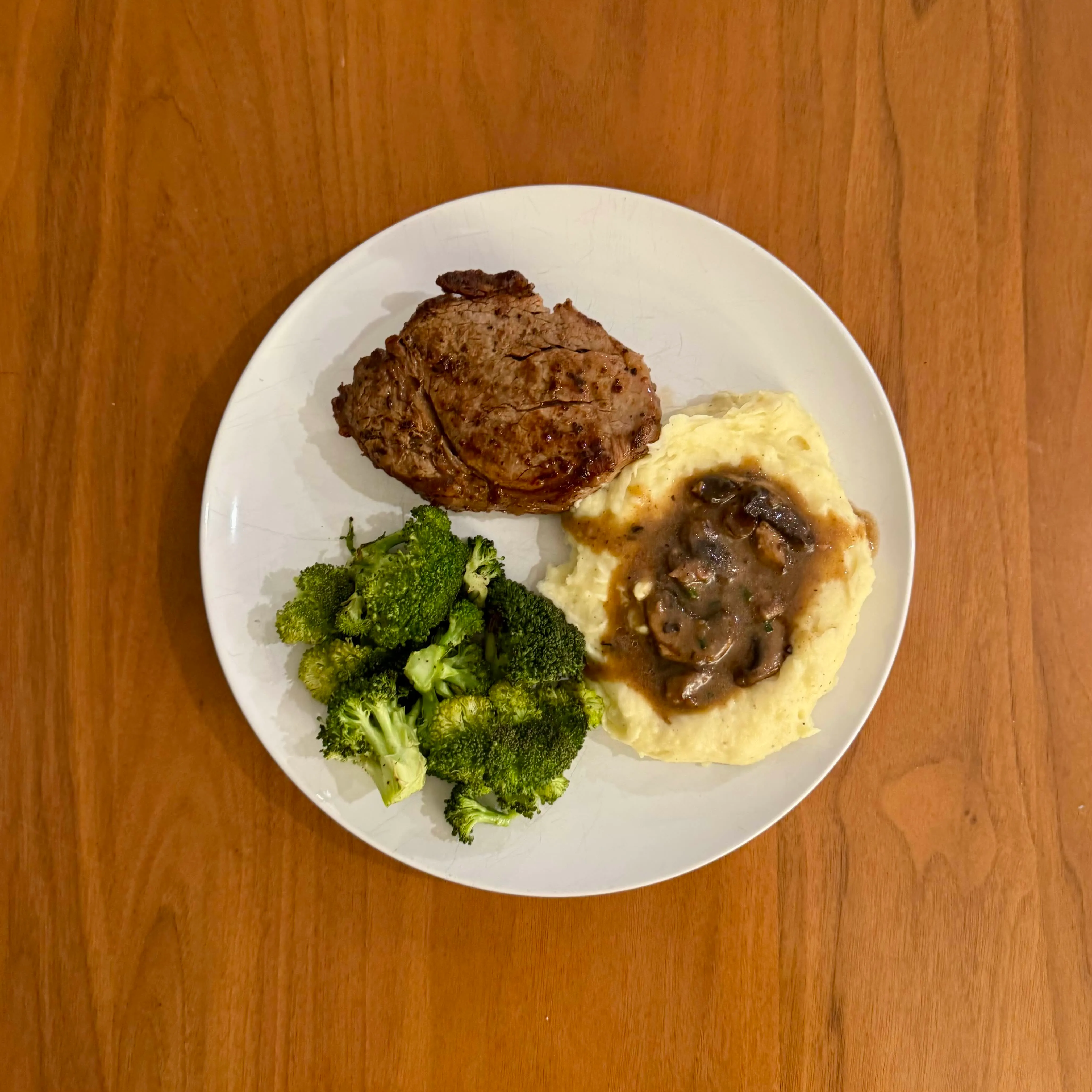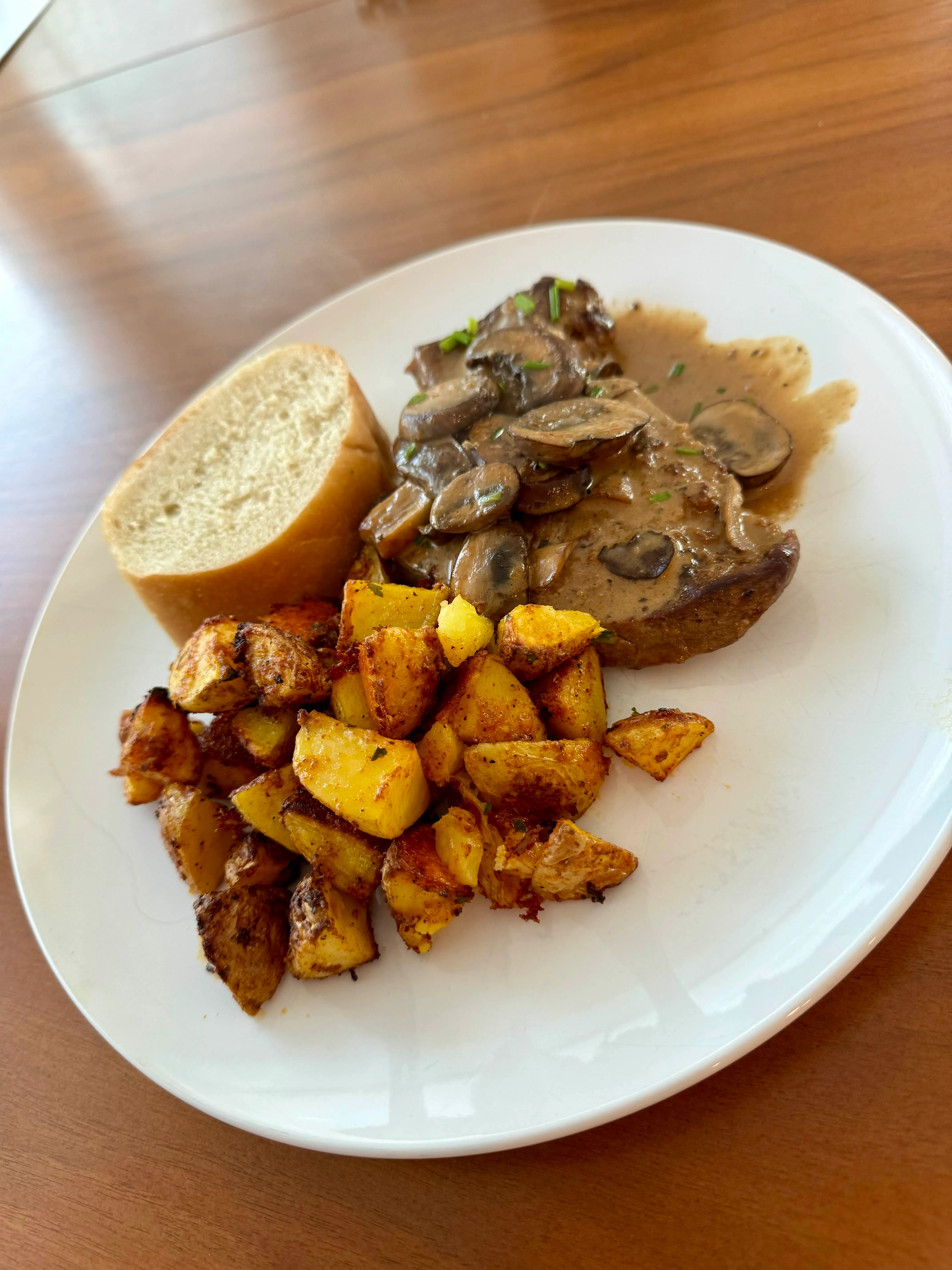 A pan-seared steak under a mushroom cream sauce, a heap of crispy roasted potatoes, and a torn piece of baguette to swipe through all of it.
