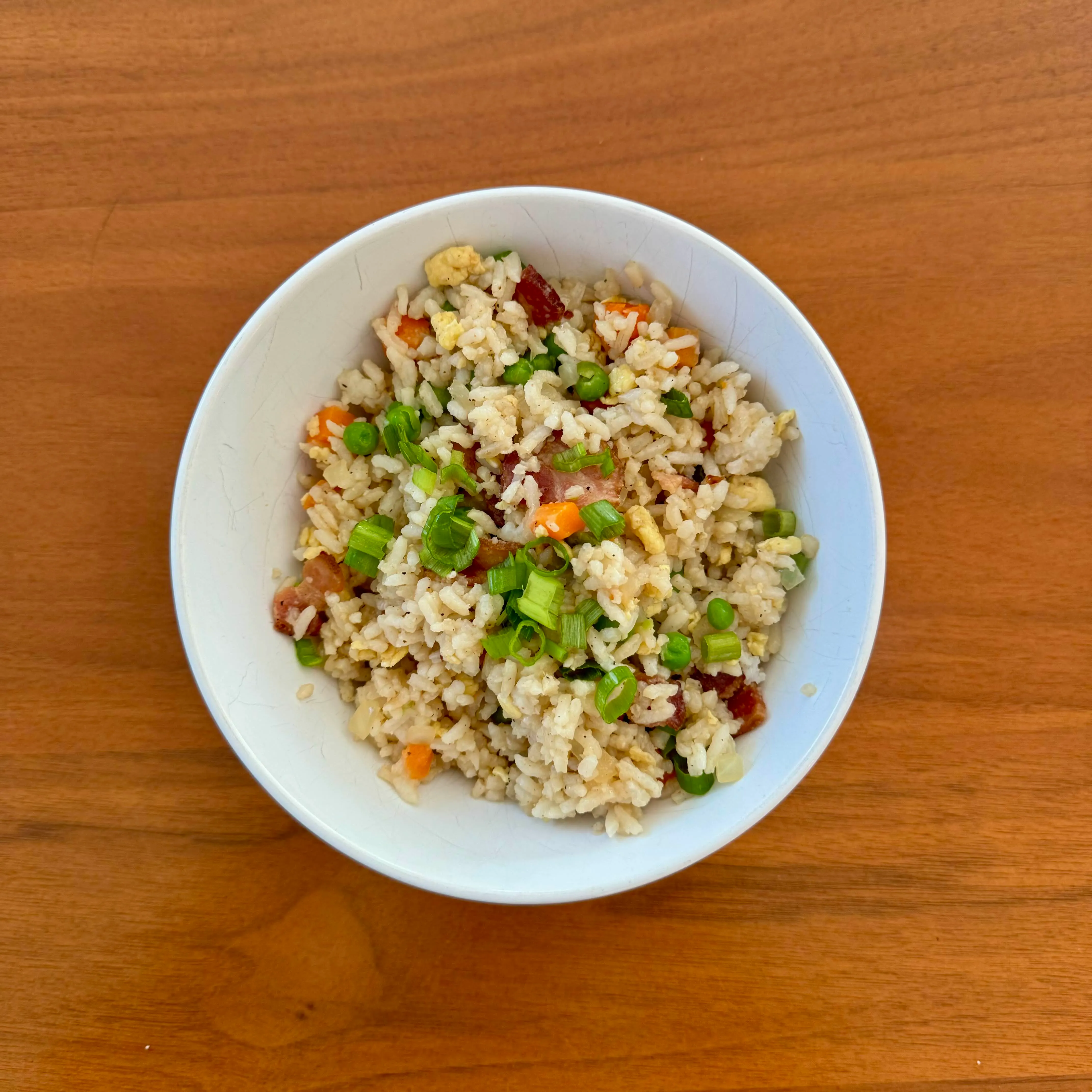 A small bowl of fried rice with bits of sausage, peas, carrots, egg, and a lot of scallions - lunch cleared out of a weeknight's leftovers.
