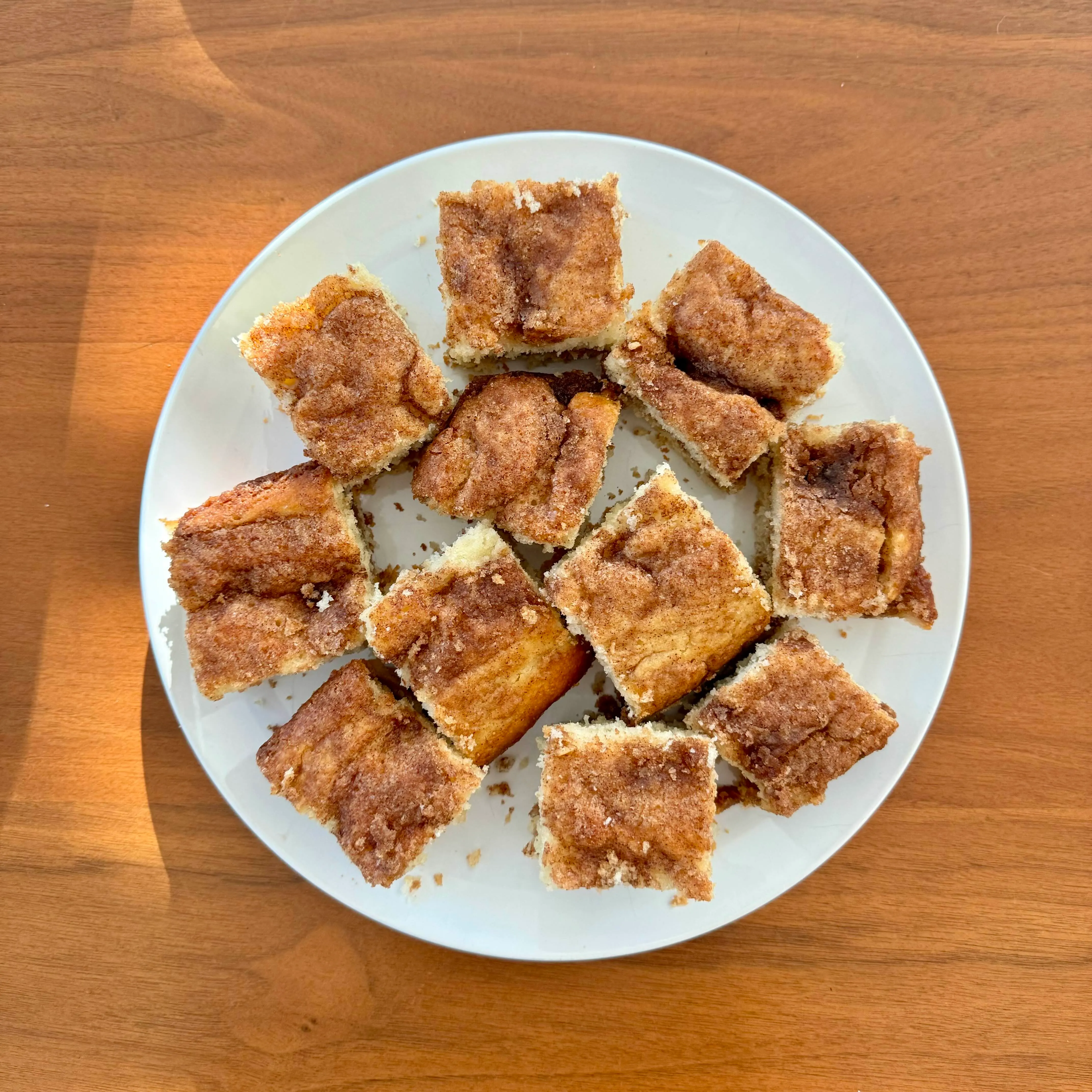 A plate of coffee-cake squares with a thick crumbly cinnamon top, cut small so you can eat three and call it one.