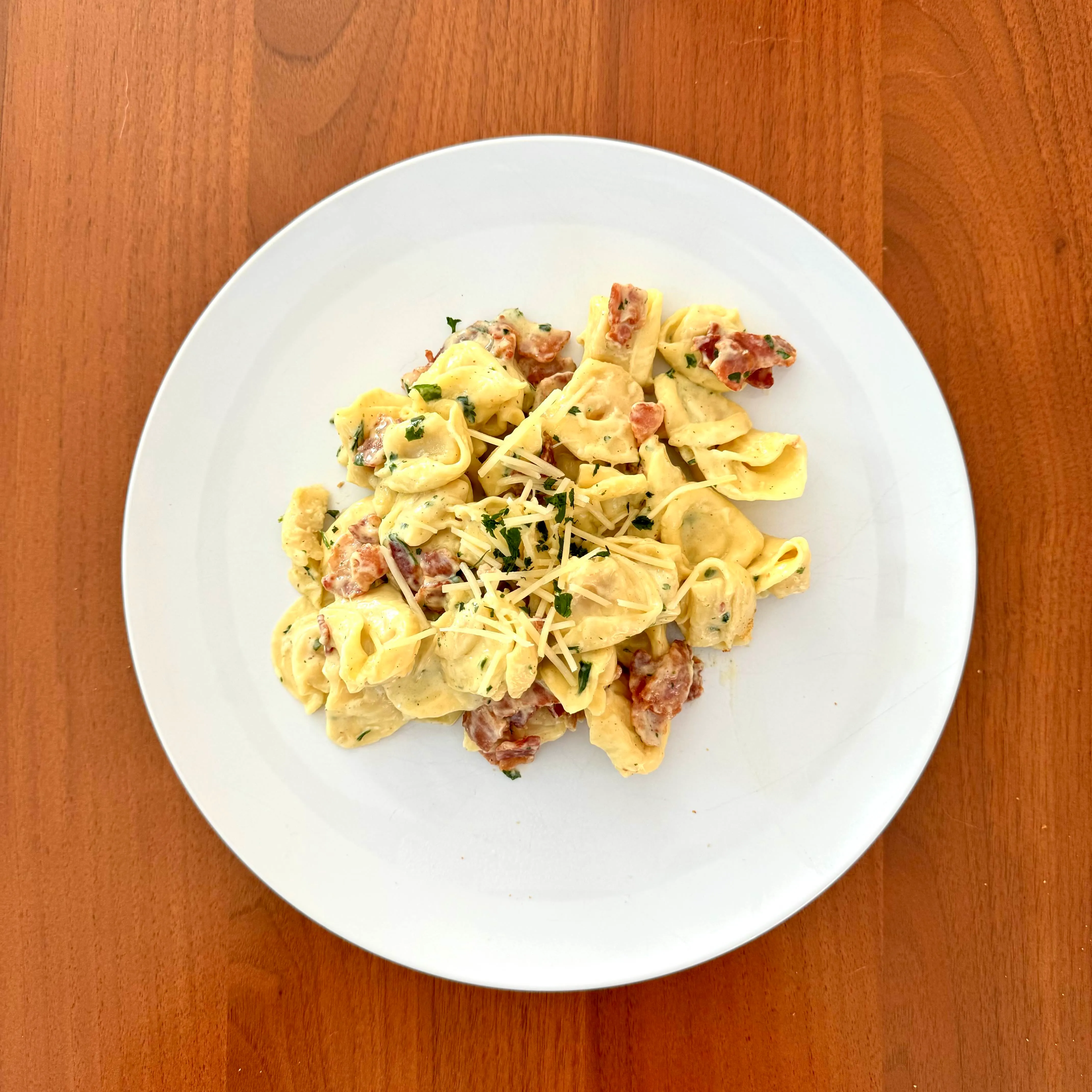 A plate of cheese tortellini in a pancetta-cream sauce with parmesan and parsley - a Sunday dinner that took fifteen minutes on purpose.