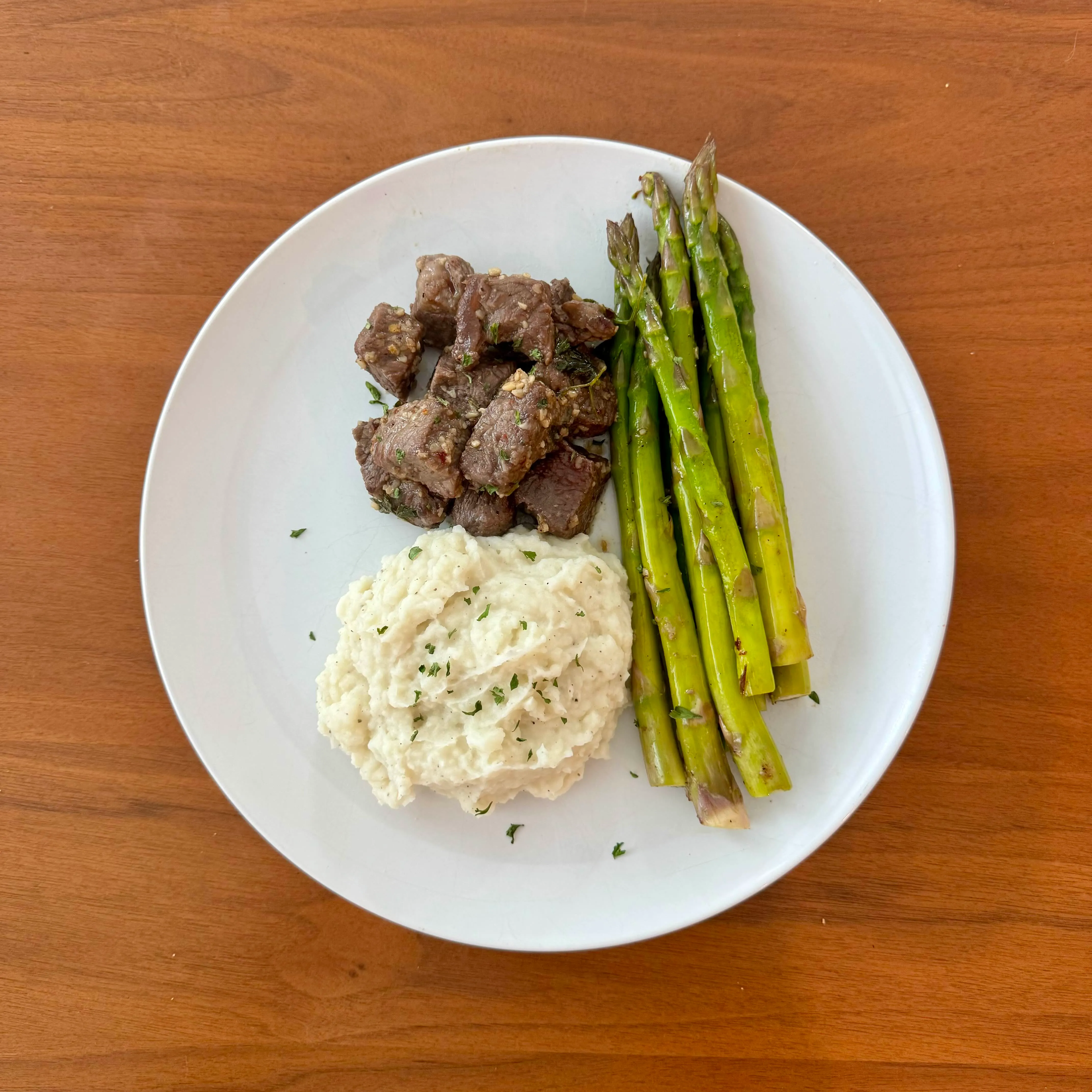 A weeknight plate of herby steak bites, a mound of mashed potatoes with a flake of parsley, and four fat asparagus spears.