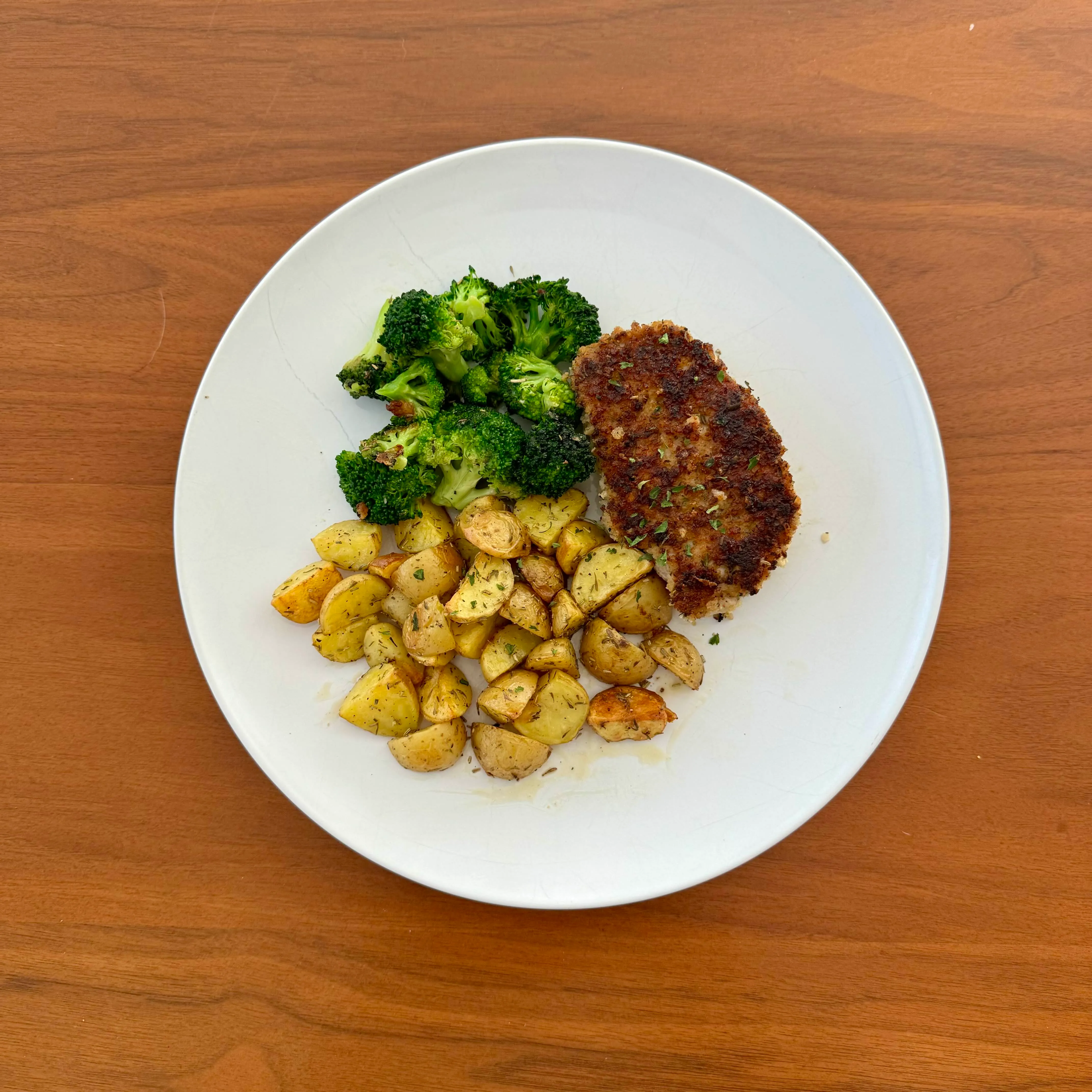 A breaded chicken cutlet with herbed potato cubes and a pile of broccoli, a Thursday plate that didn't try to be more than that.