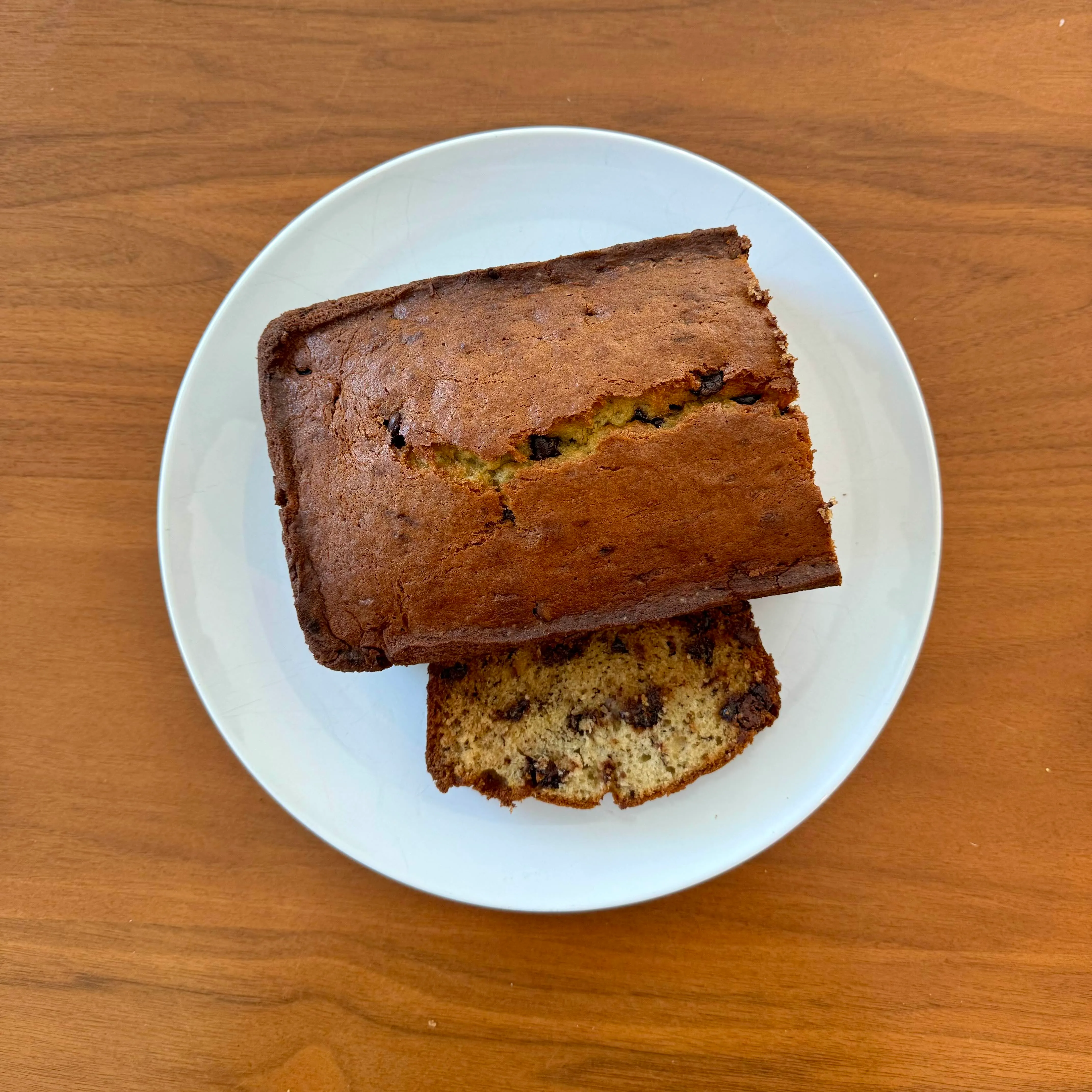 A dark-topped loaf of chocolate-chip banana bread with one slice cut and tilted on the plate, made for no reason at all.