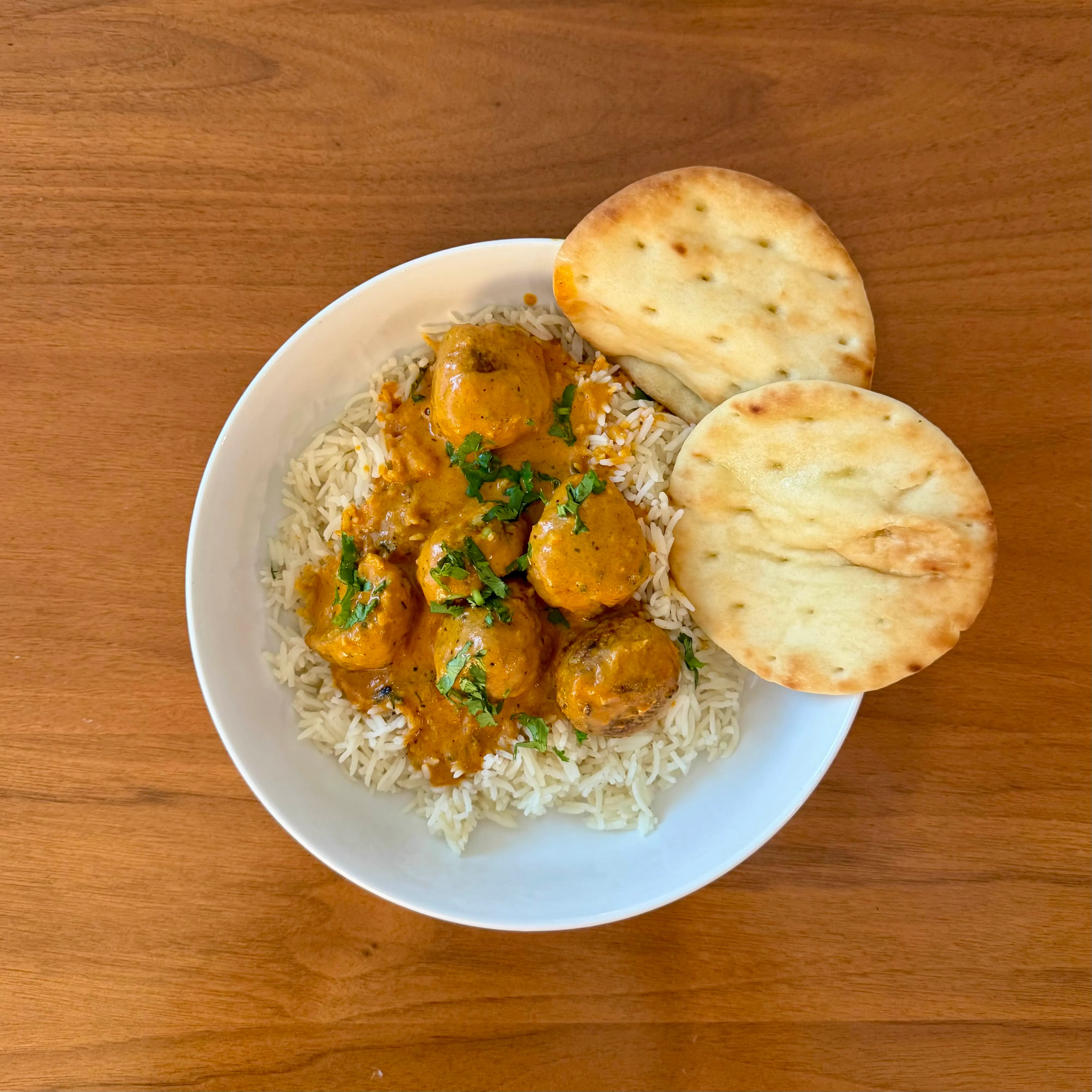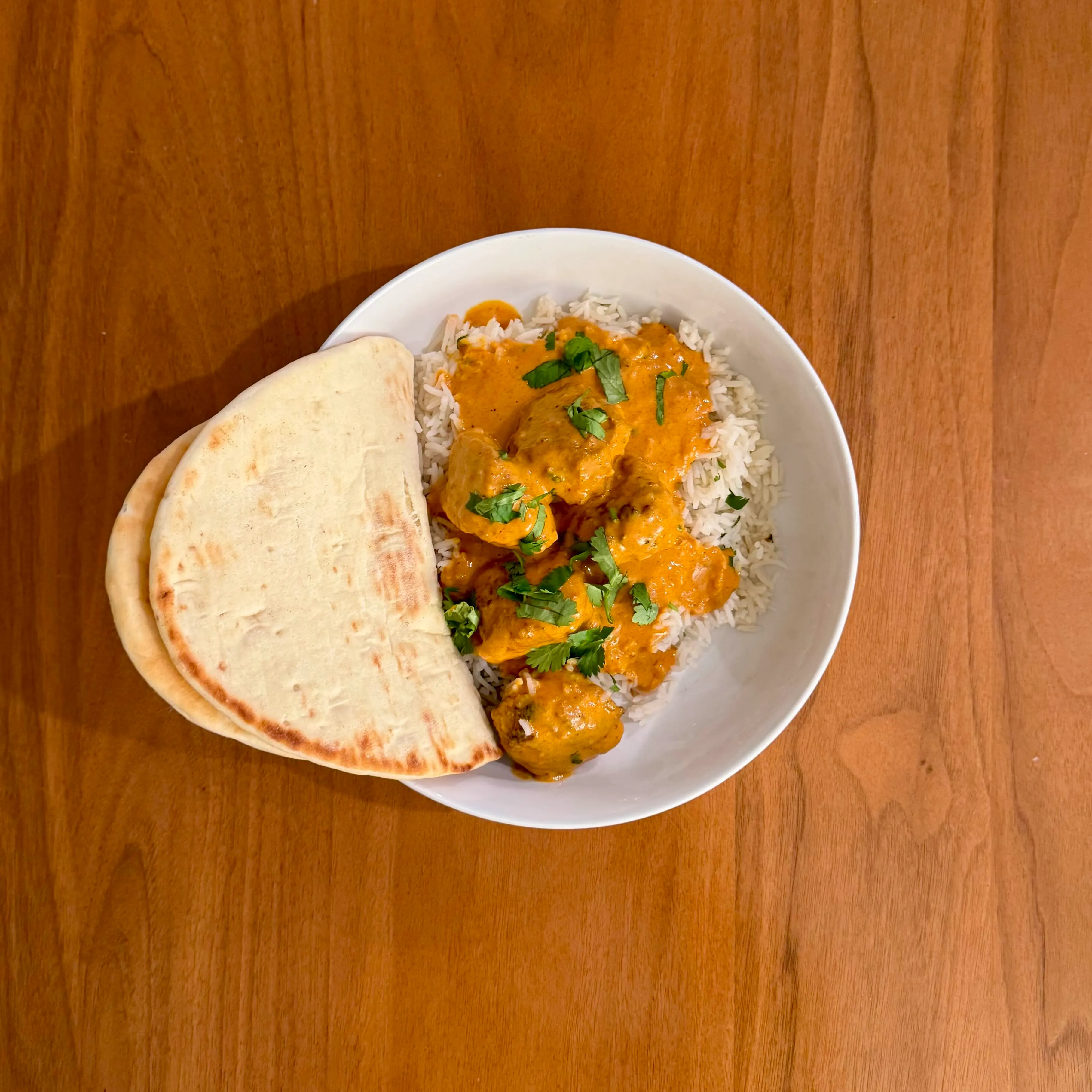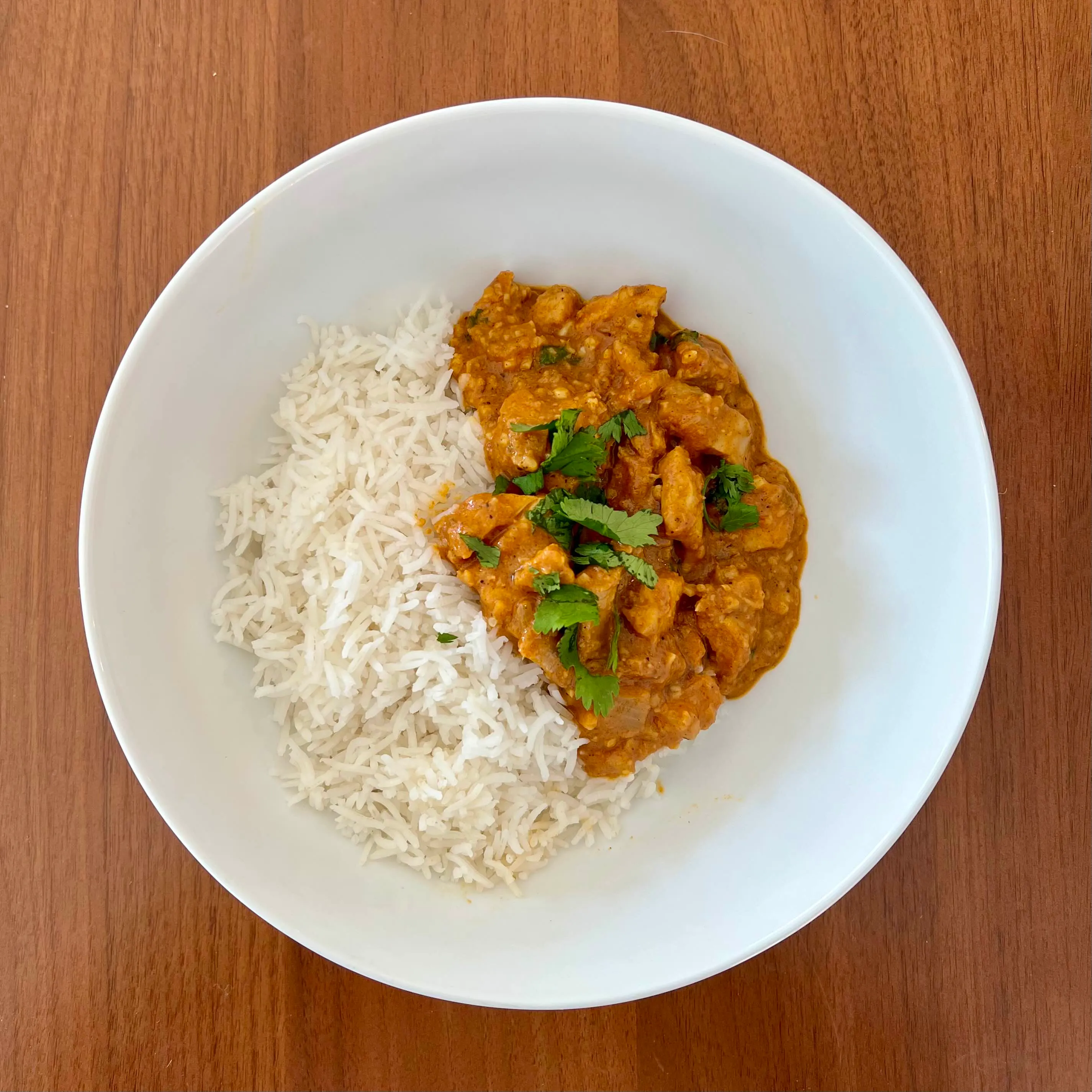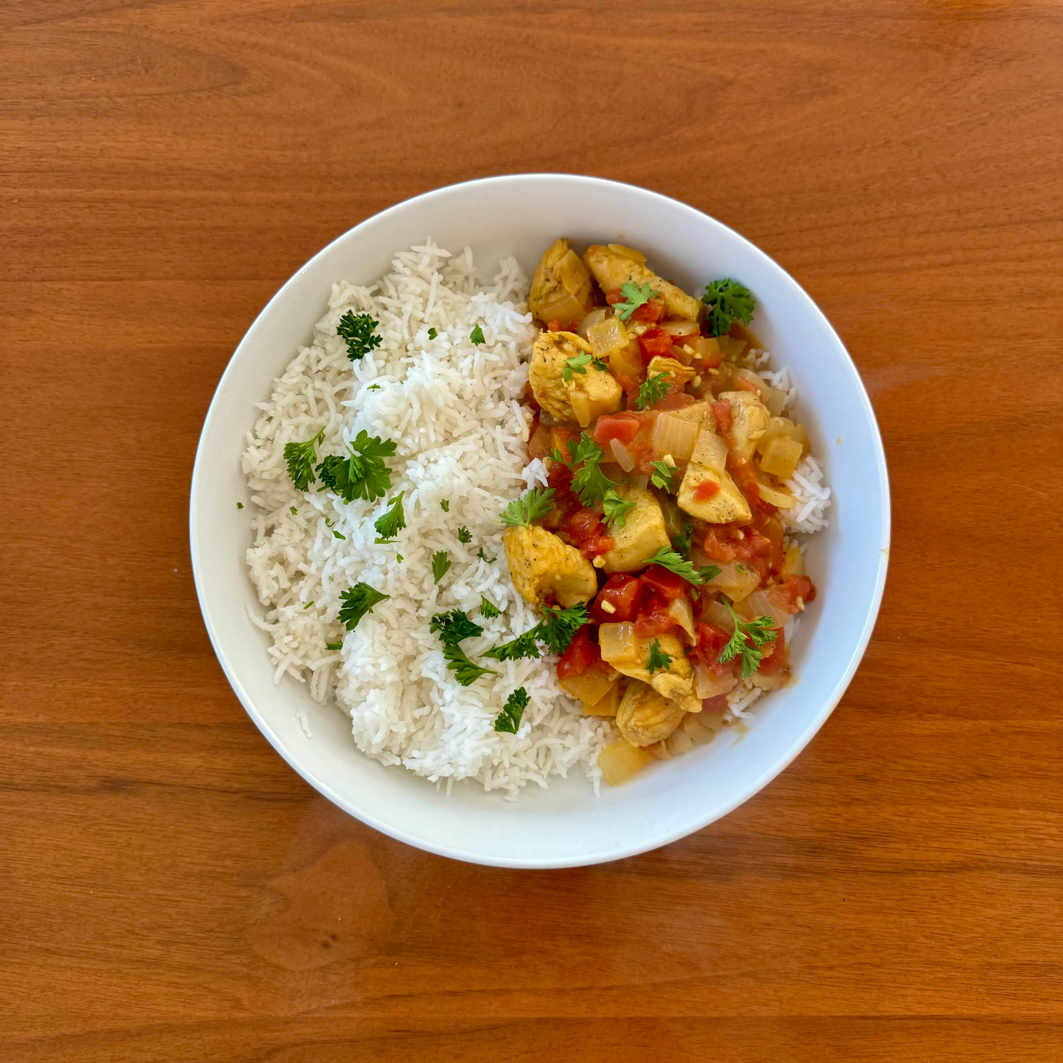 A bowl of basmati rice with a quick chicken-and-tomato curry, a scatter of parsley, eaten at the counter on a Sunday afternoon.
