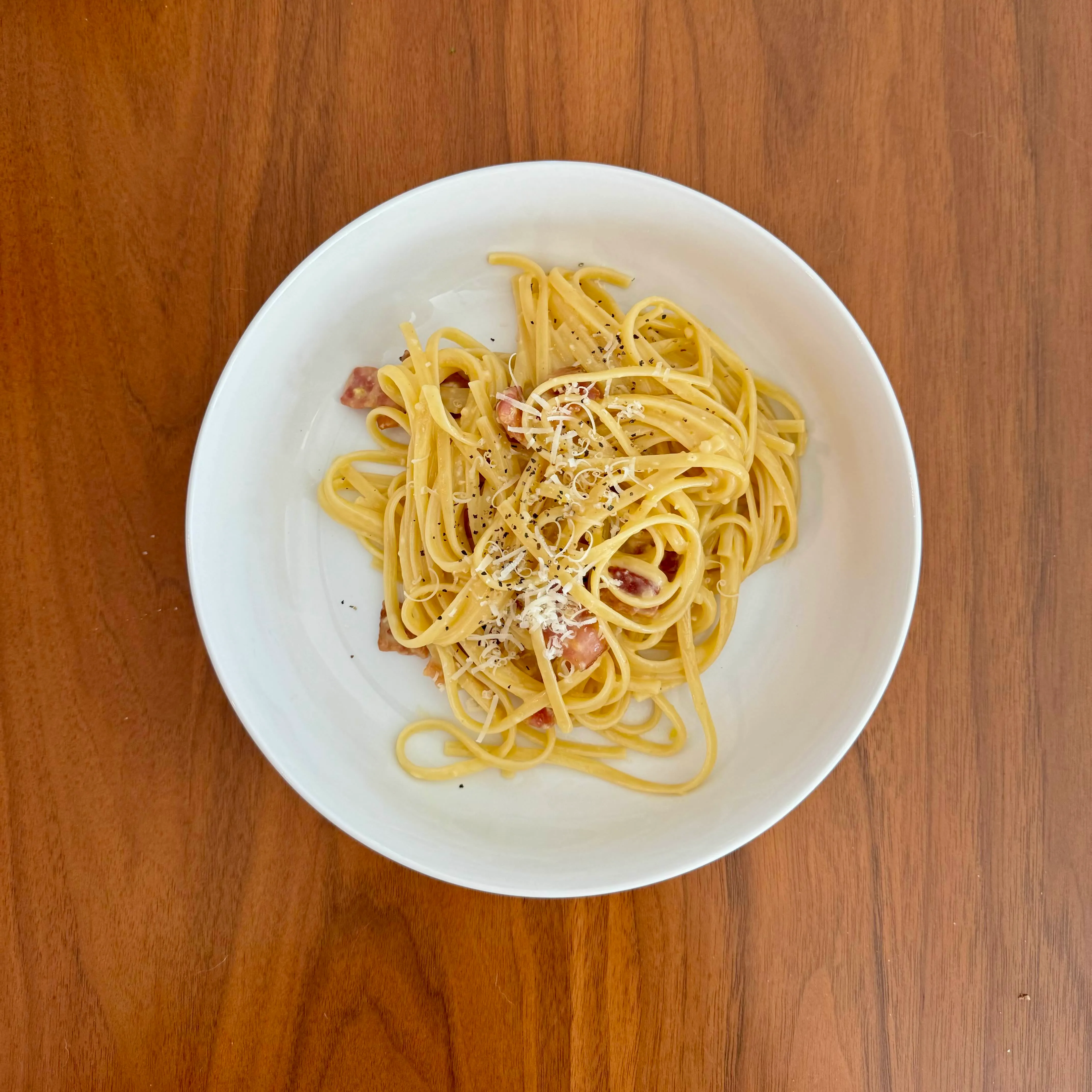A shallow bowl of linguine carbonara with crisped pancetta, parmesan, and too much pepper - a solo dinner made with intention.