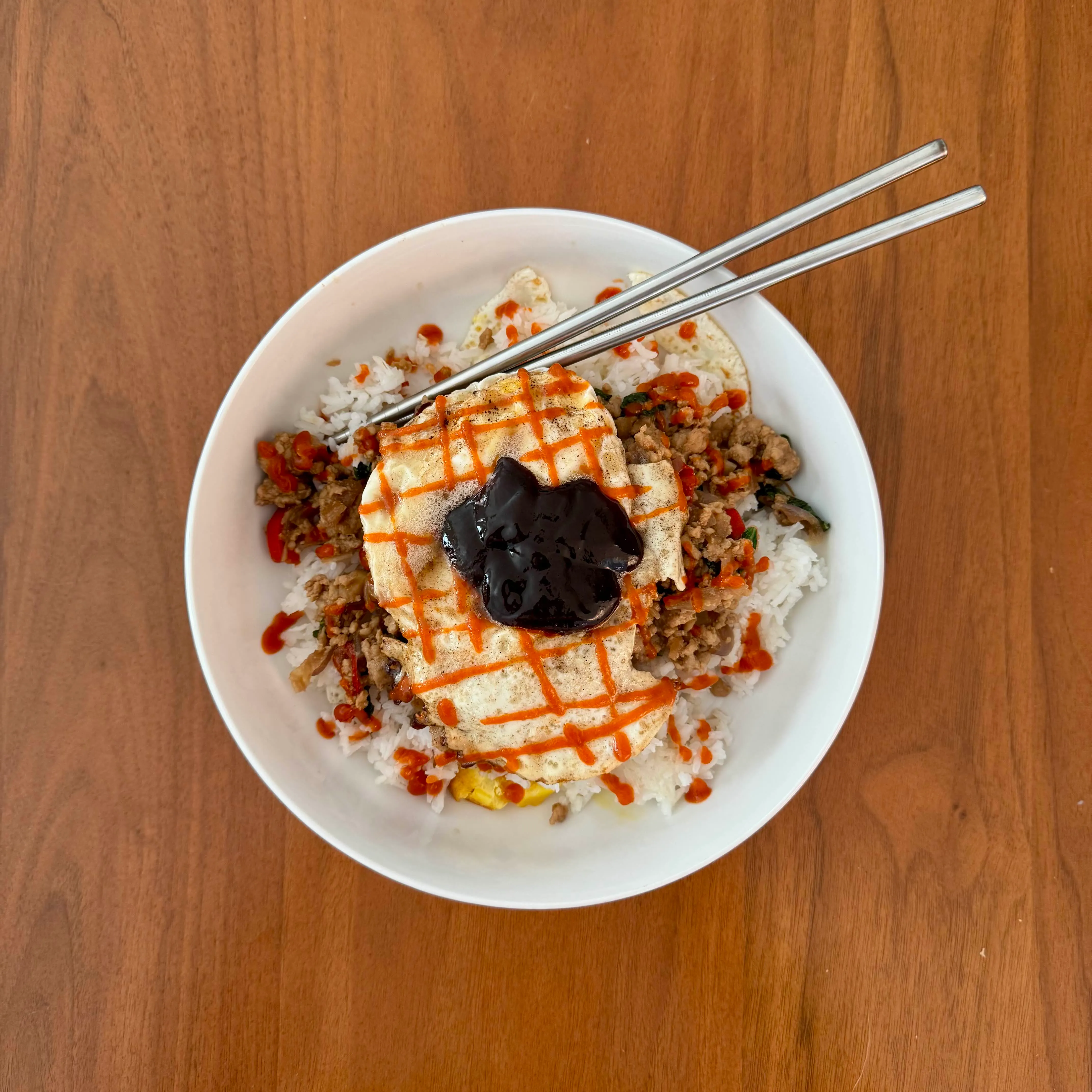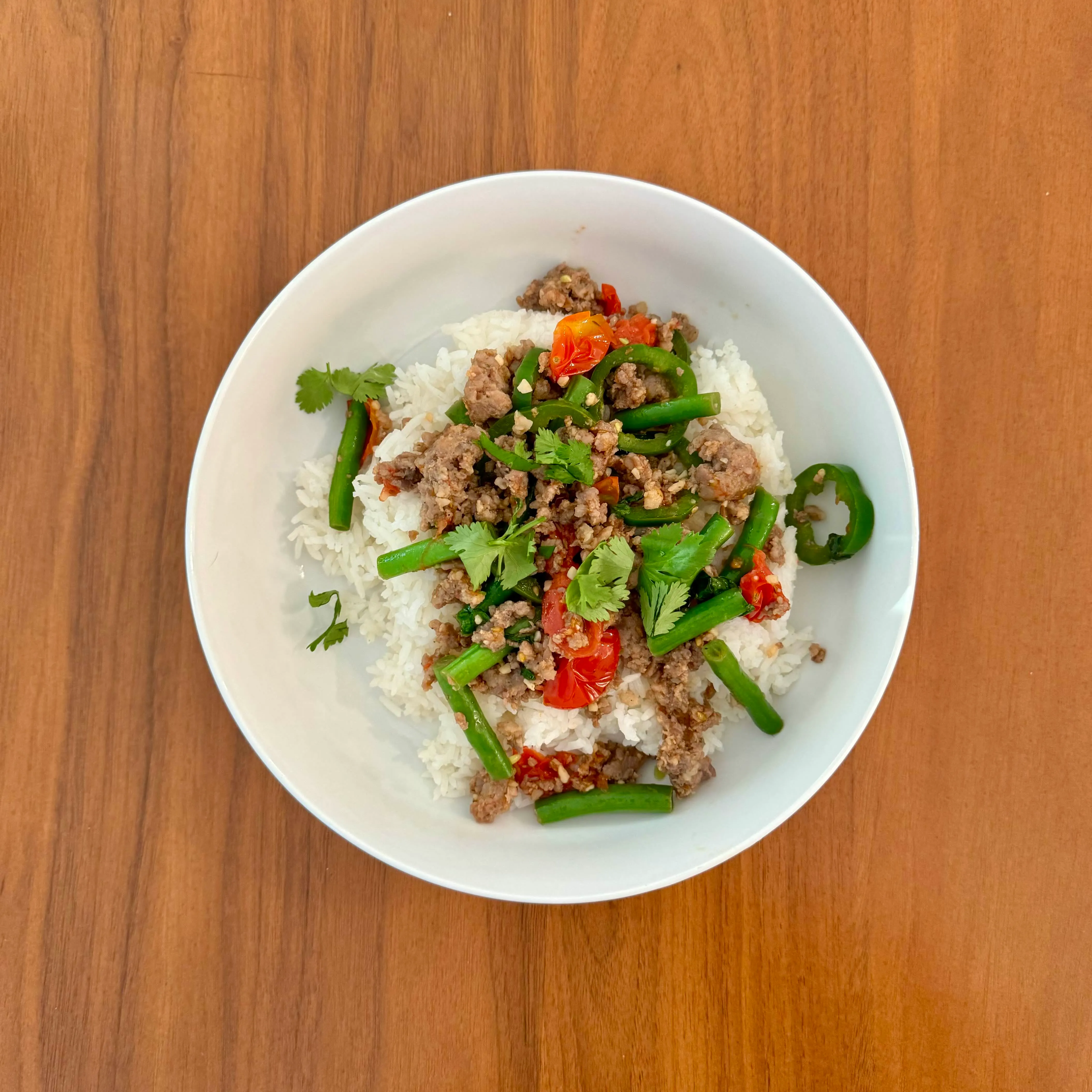A rice bowl with ground beef, long beans, tomato, chile, and cilantro - a Saturday-night dinner hotter than I meant it to be.