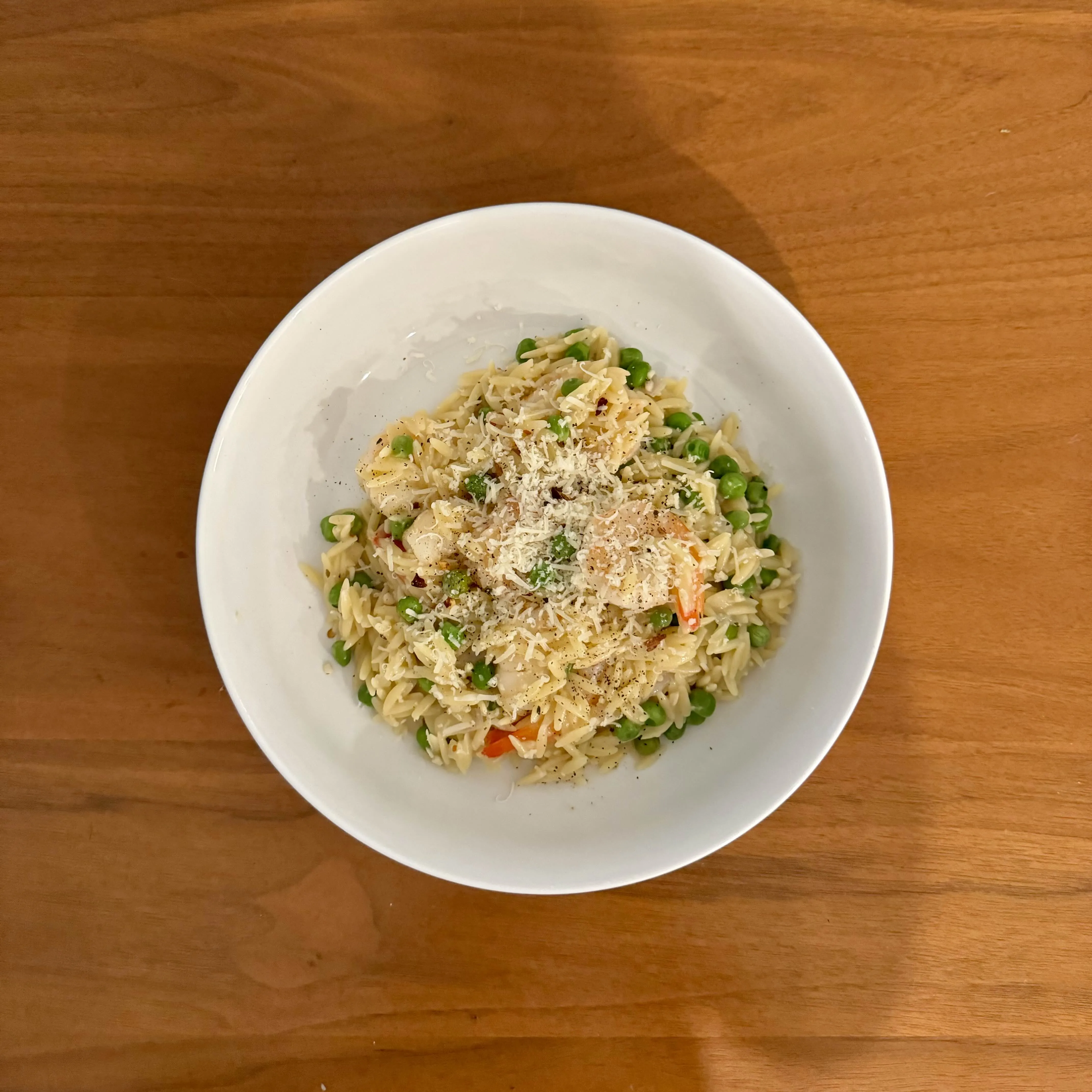 A small bowl of orzo with diced chicken, peas, carrot, and parmesan - a Saturday dinner that wanted to be a soup and stopped.