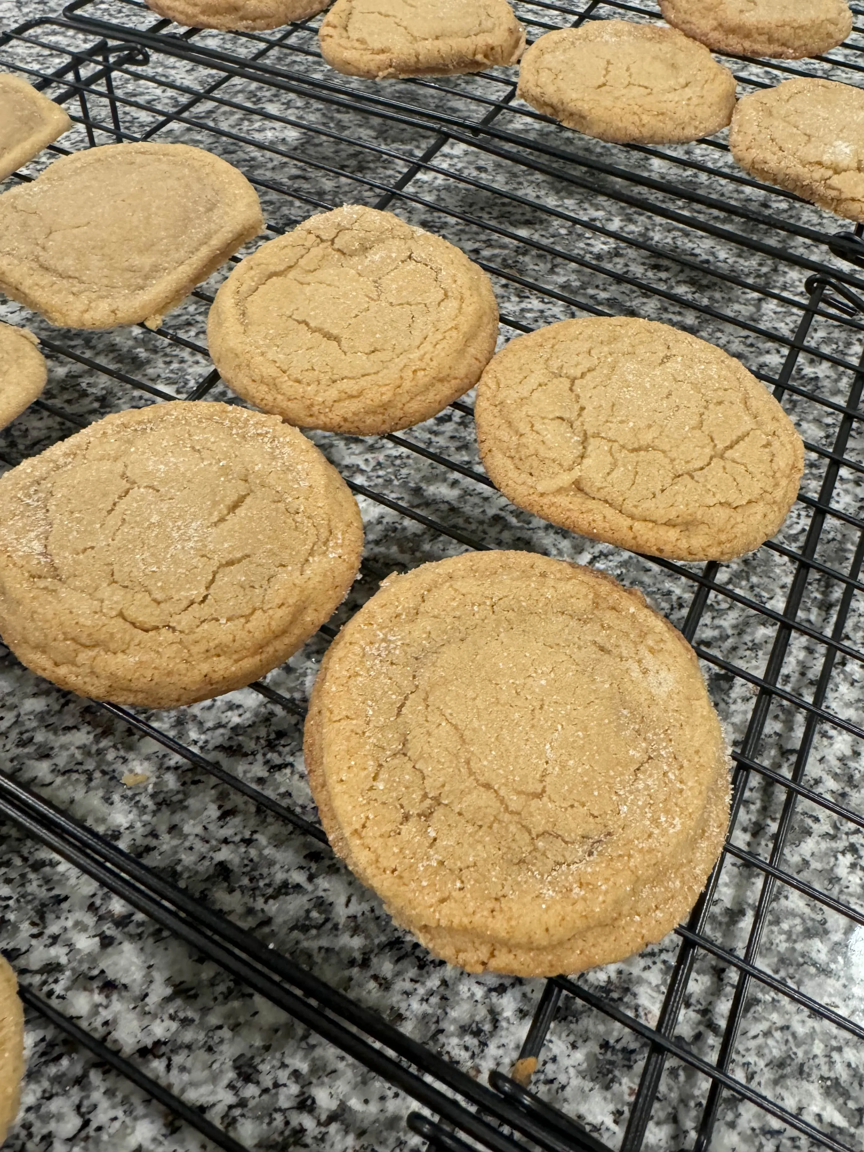 A wire rack on the counter with a dozen brown-sugar cookies cooling after the oven, the kitchen full of that warm caramel smell.