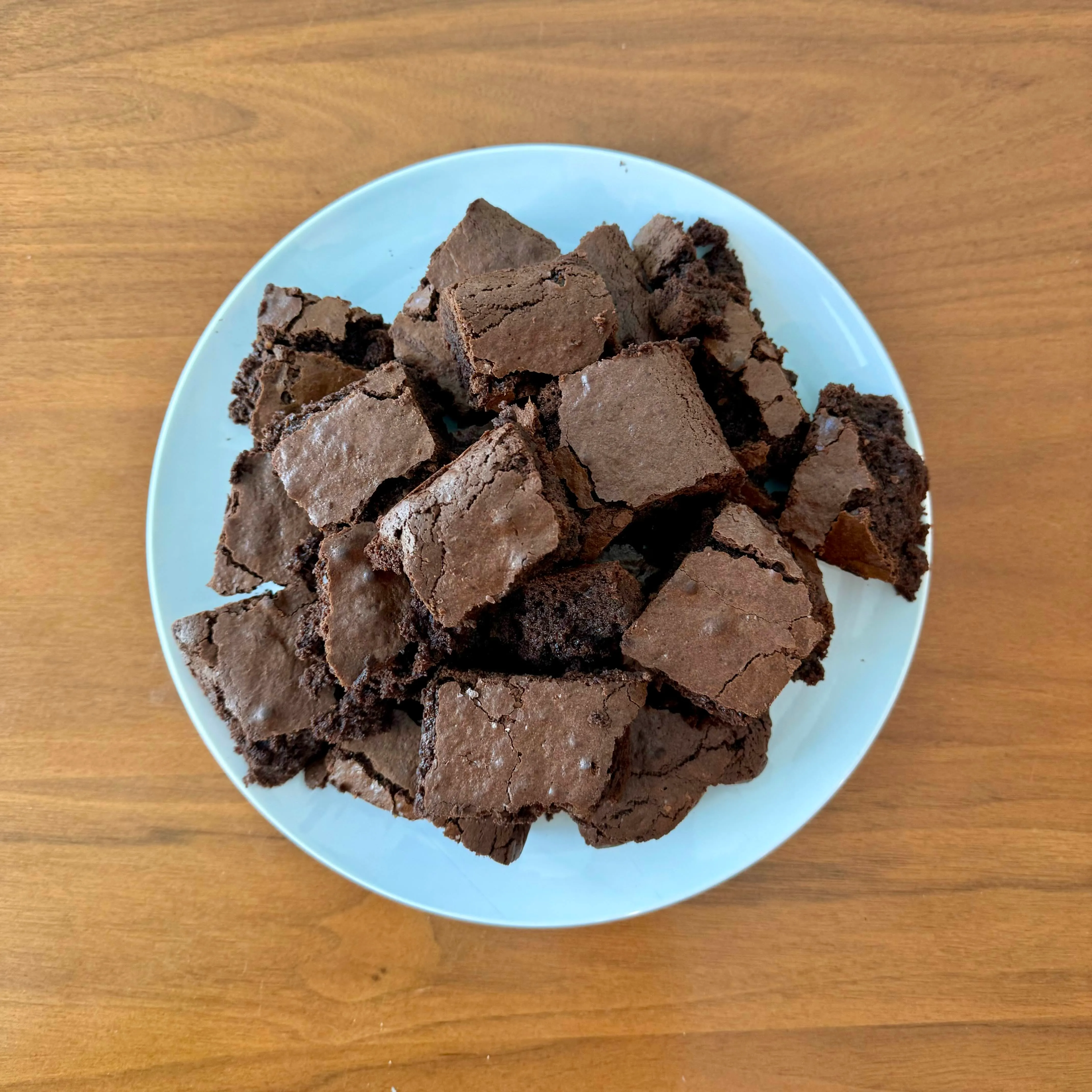A mound of crackle-topped fudgy brownies piled on a plate, cut uneven on purpose so the corner pieces got more edge.