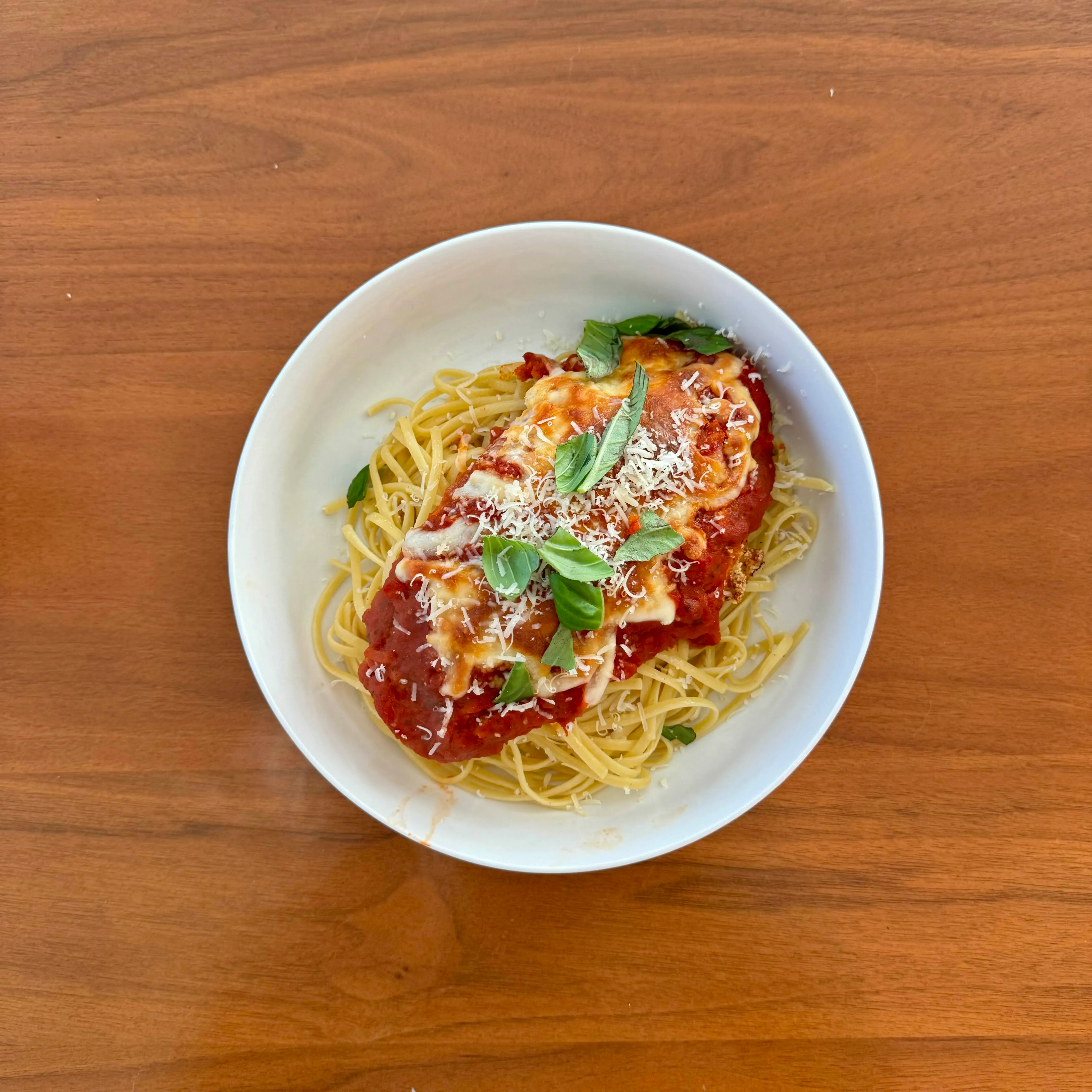 A bowl of spaghetti with red sauce, a breaded chicken breast with melted cheese, and a big handful of torn basil on top.