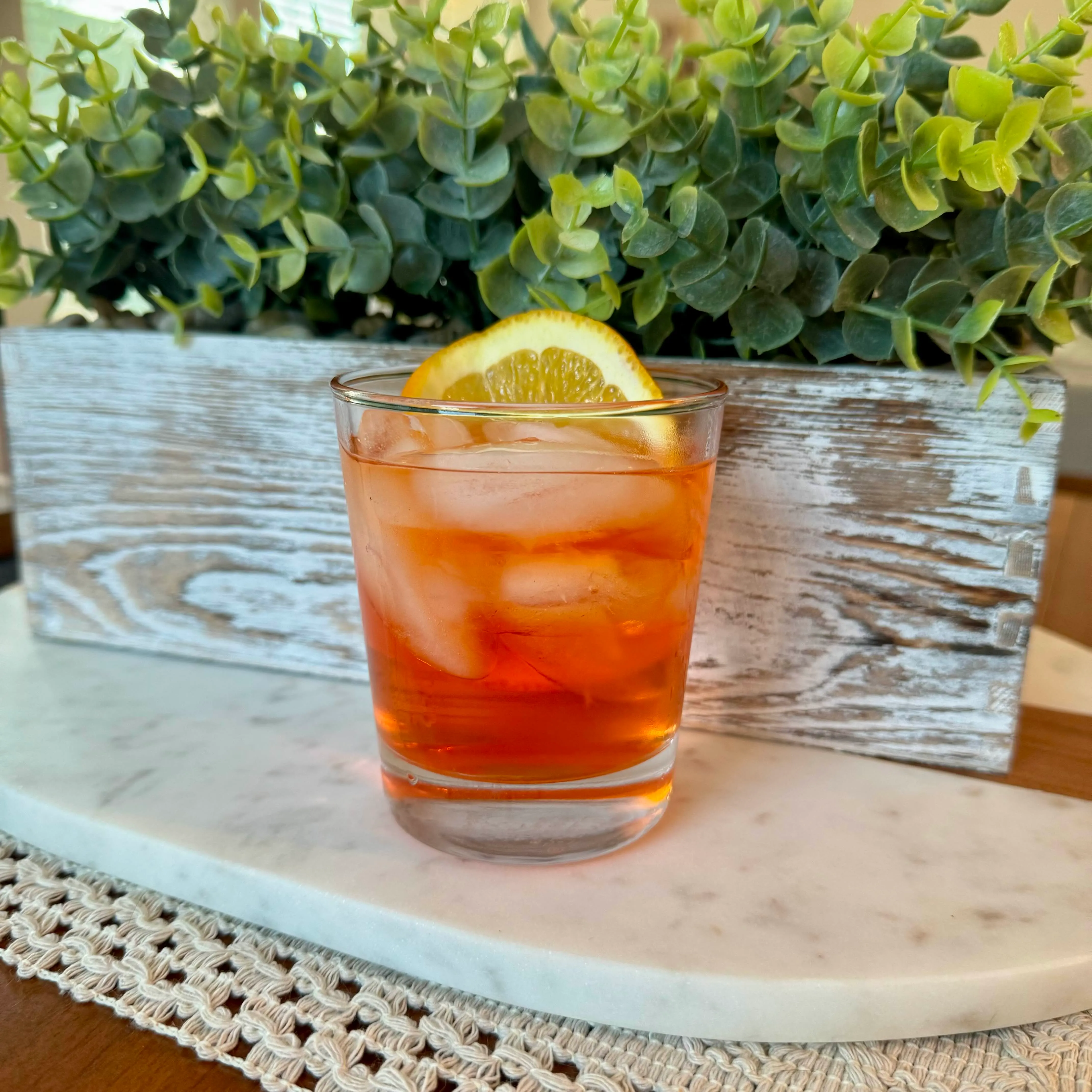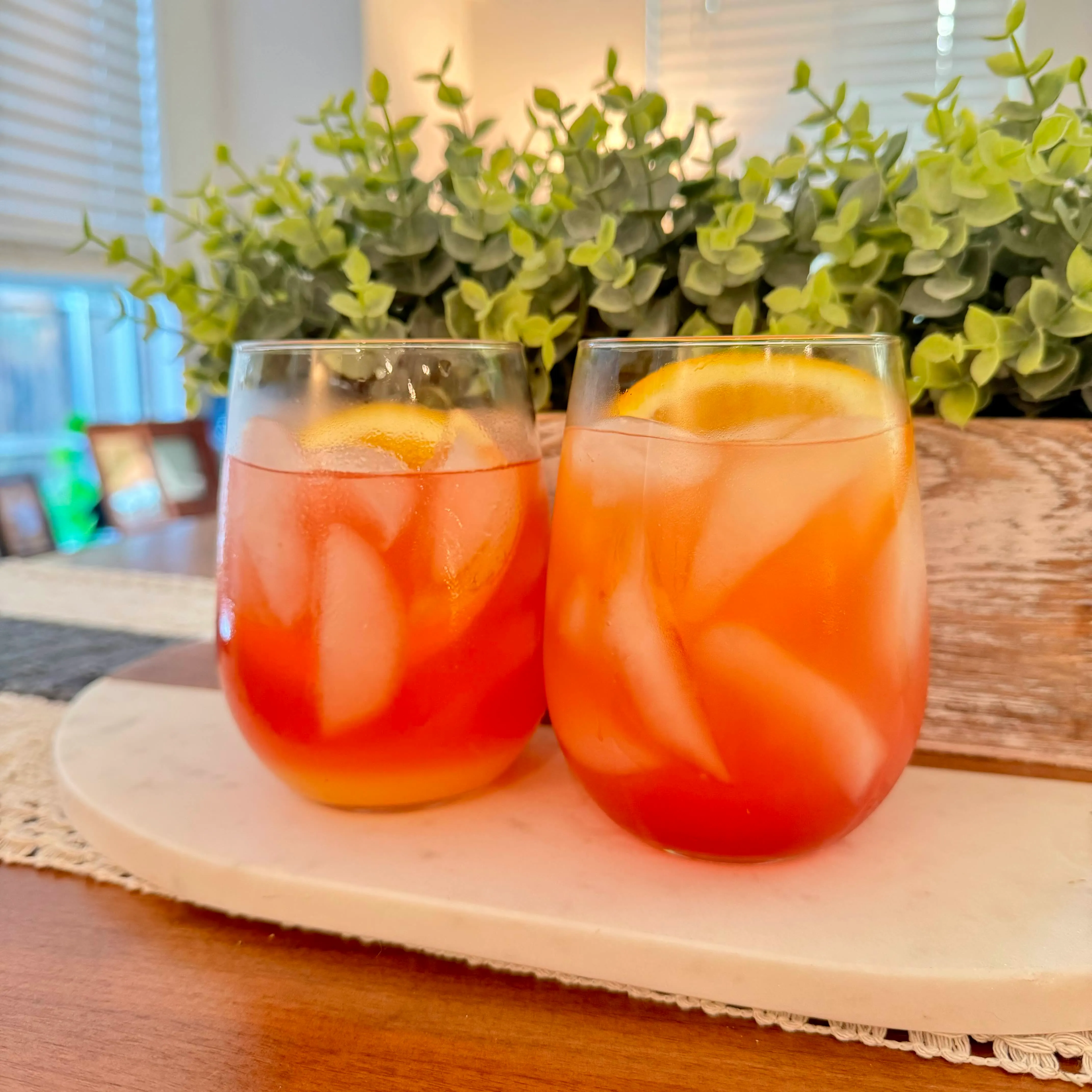 Two stemless glasses of a sunset-colored cocktail with orange slices, sitting on a marble tray in front of the kitchen greenery.