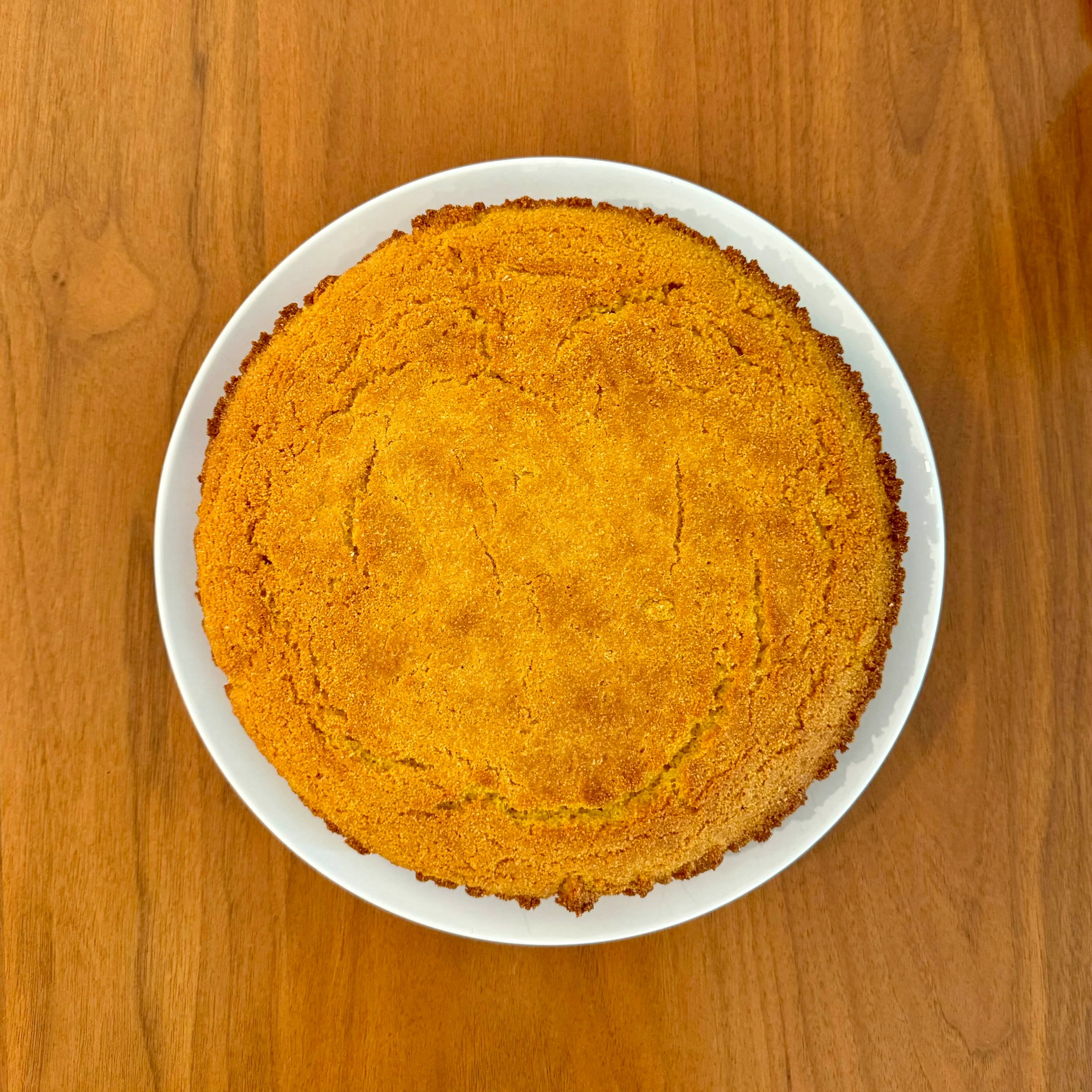 A round golden cake in a white baking dish, edges just starting to pull from the side - the base of a dessert that wasn't done yet.