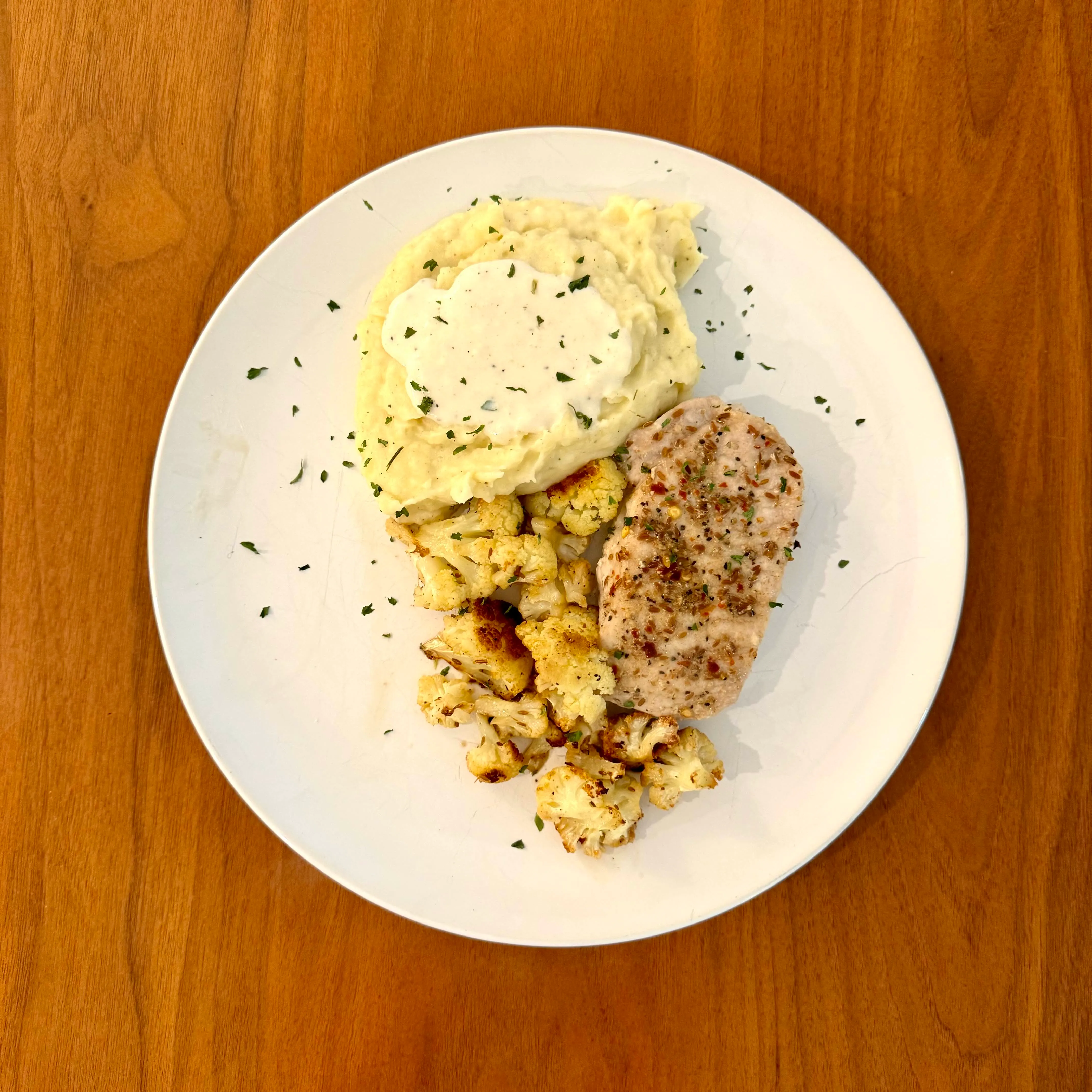 A pork chop with a peppery crust, a tall mound of mashed potatoes with a pool of cream on top, and a pile of roasted cauliflower.