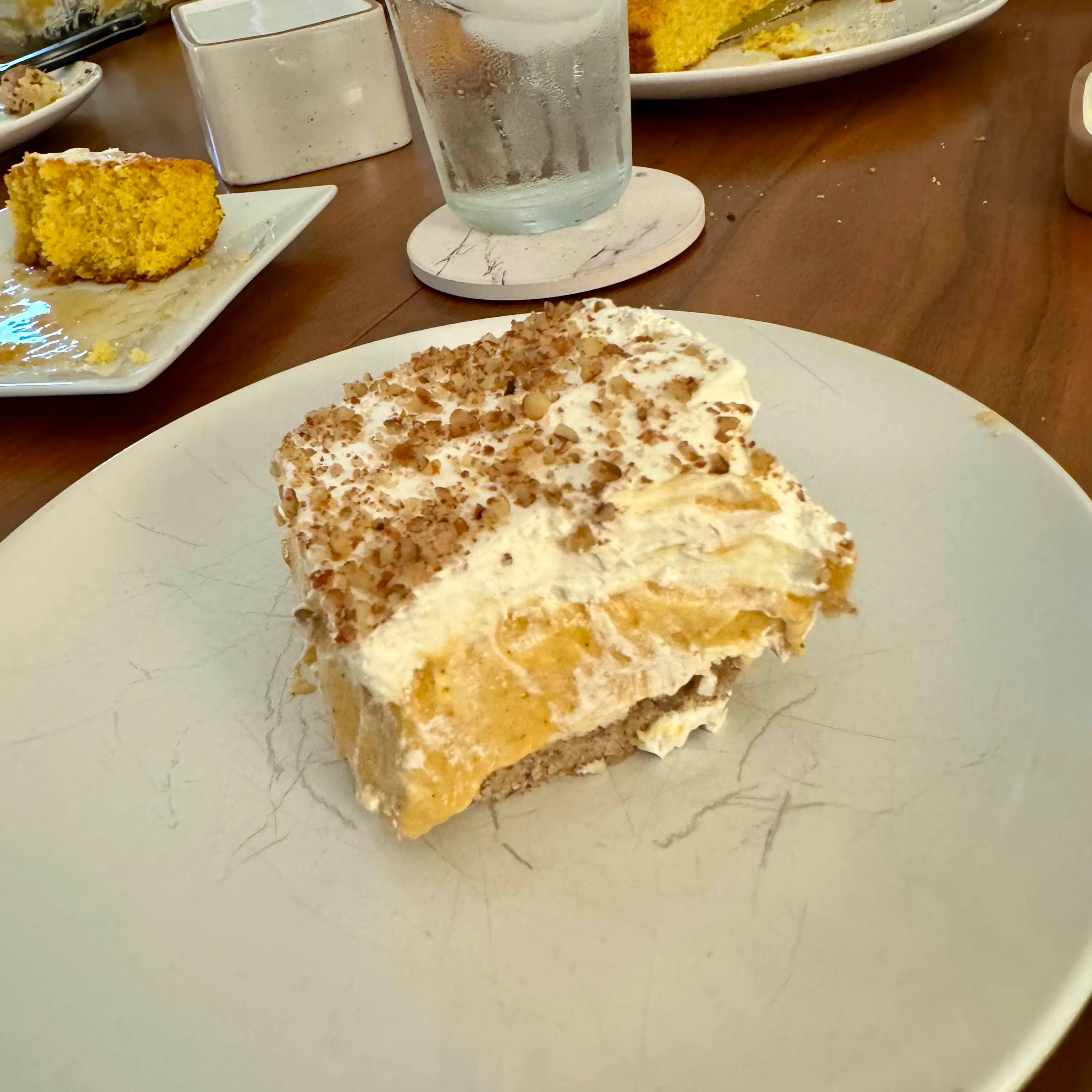 A slice of layered pumpkin-cream dessert with whipped cream and crushed nuts on top, cut from the cake I'd been cooling earlier.