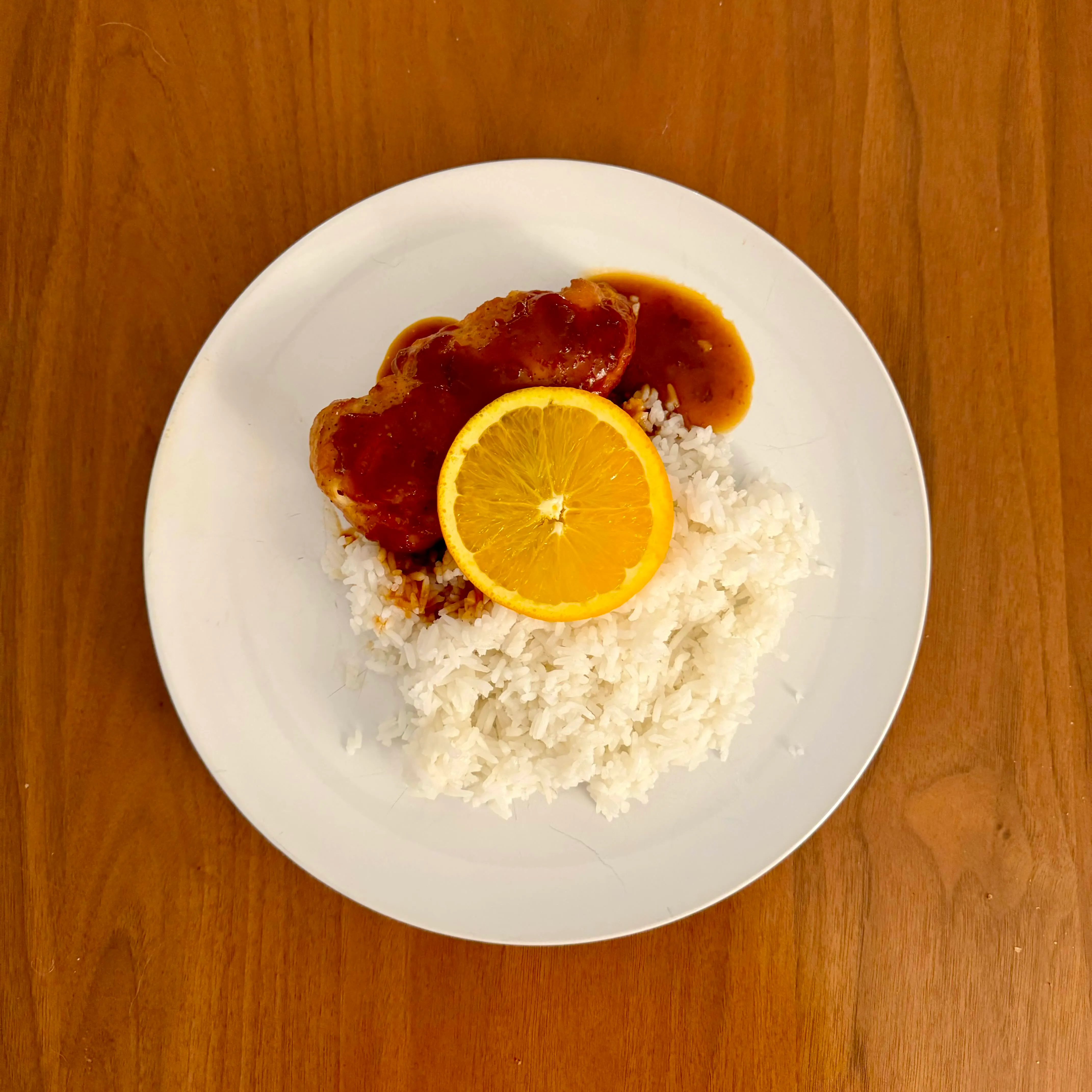 A pork chop with a sticky orange-bourbon glaze on a mound of jasmine rice, a fresh orange half tucked in for good measure.