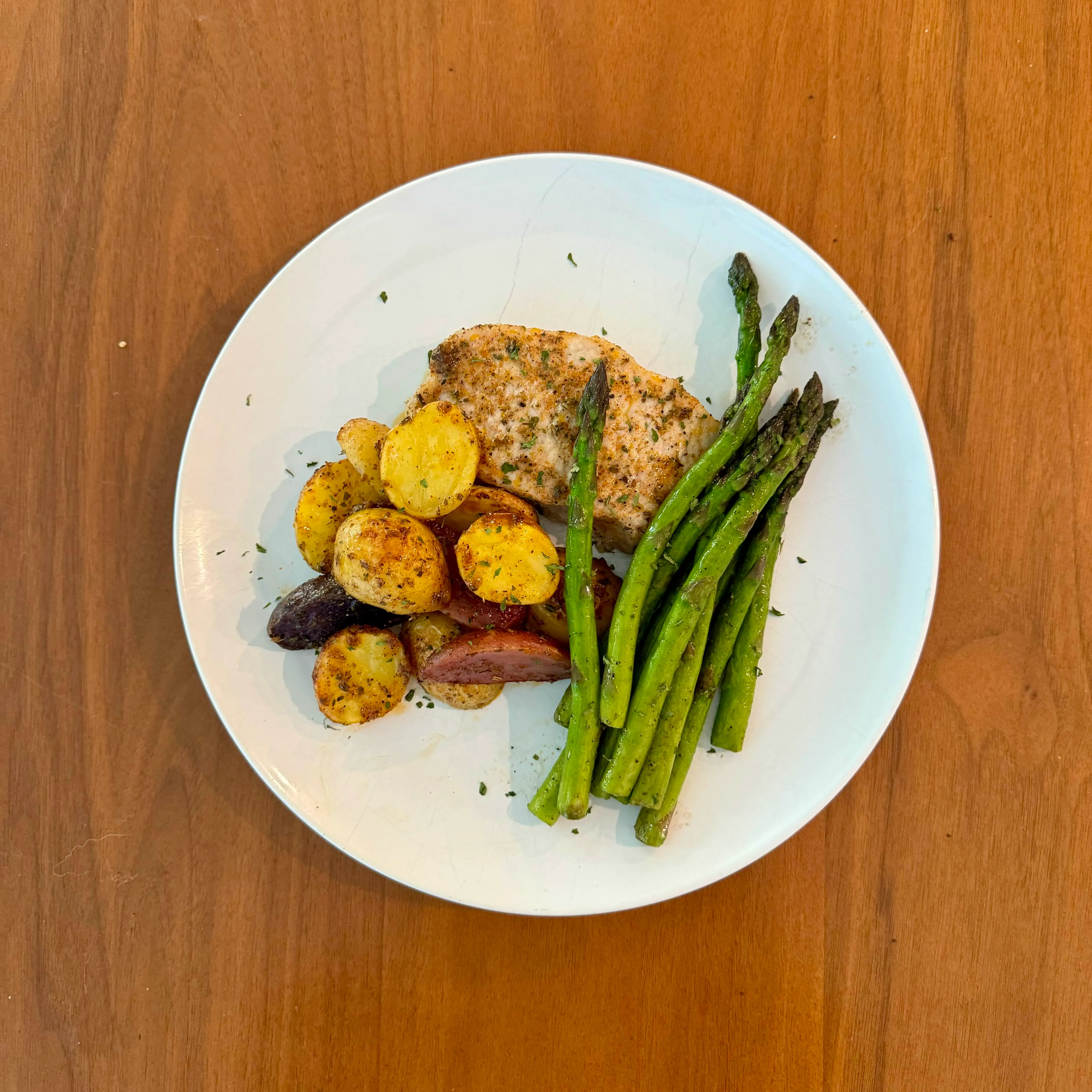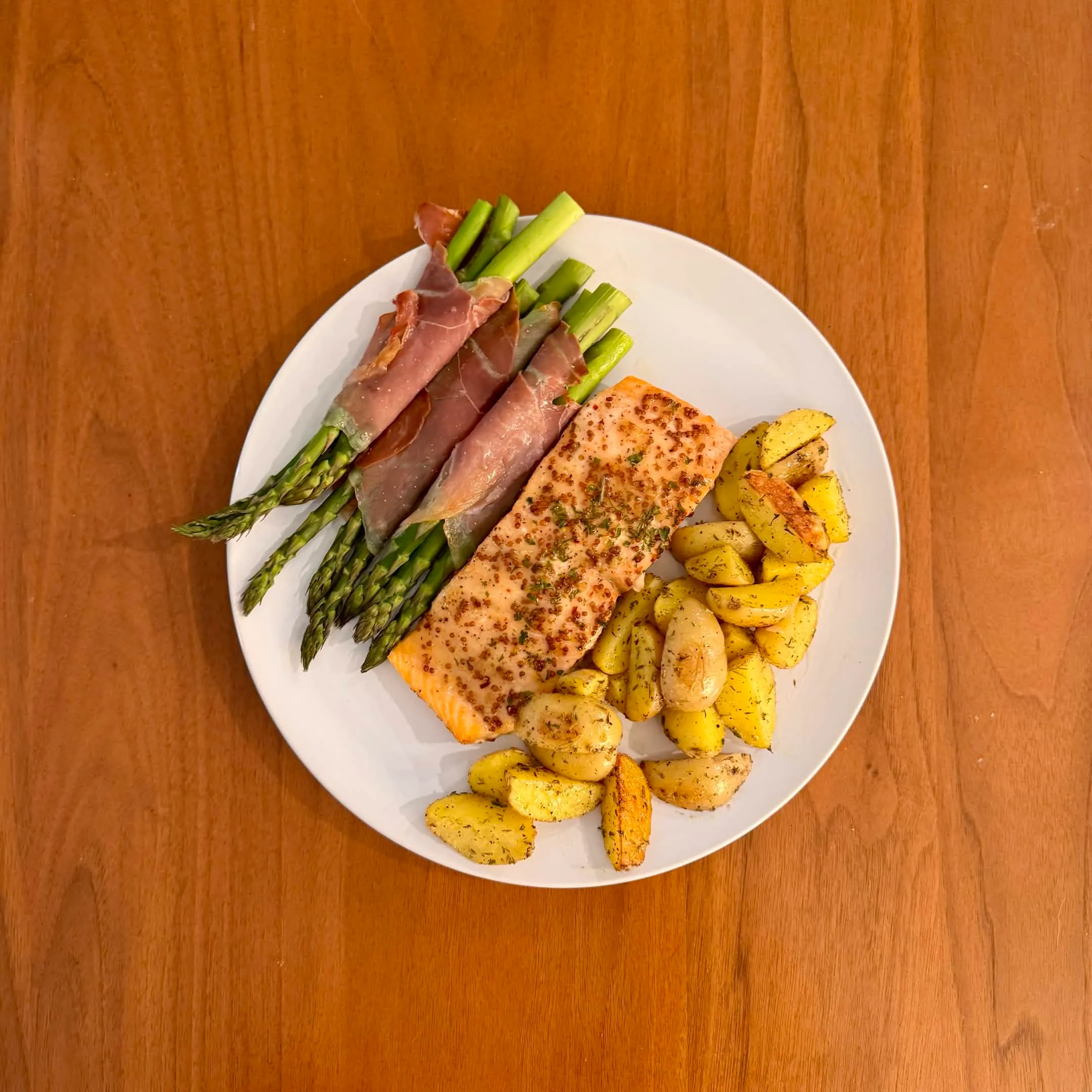 A salmon fillet with lemon-pepper crust, a pile of golden roasted fingerling potatoes, and a row of asparagus spears.