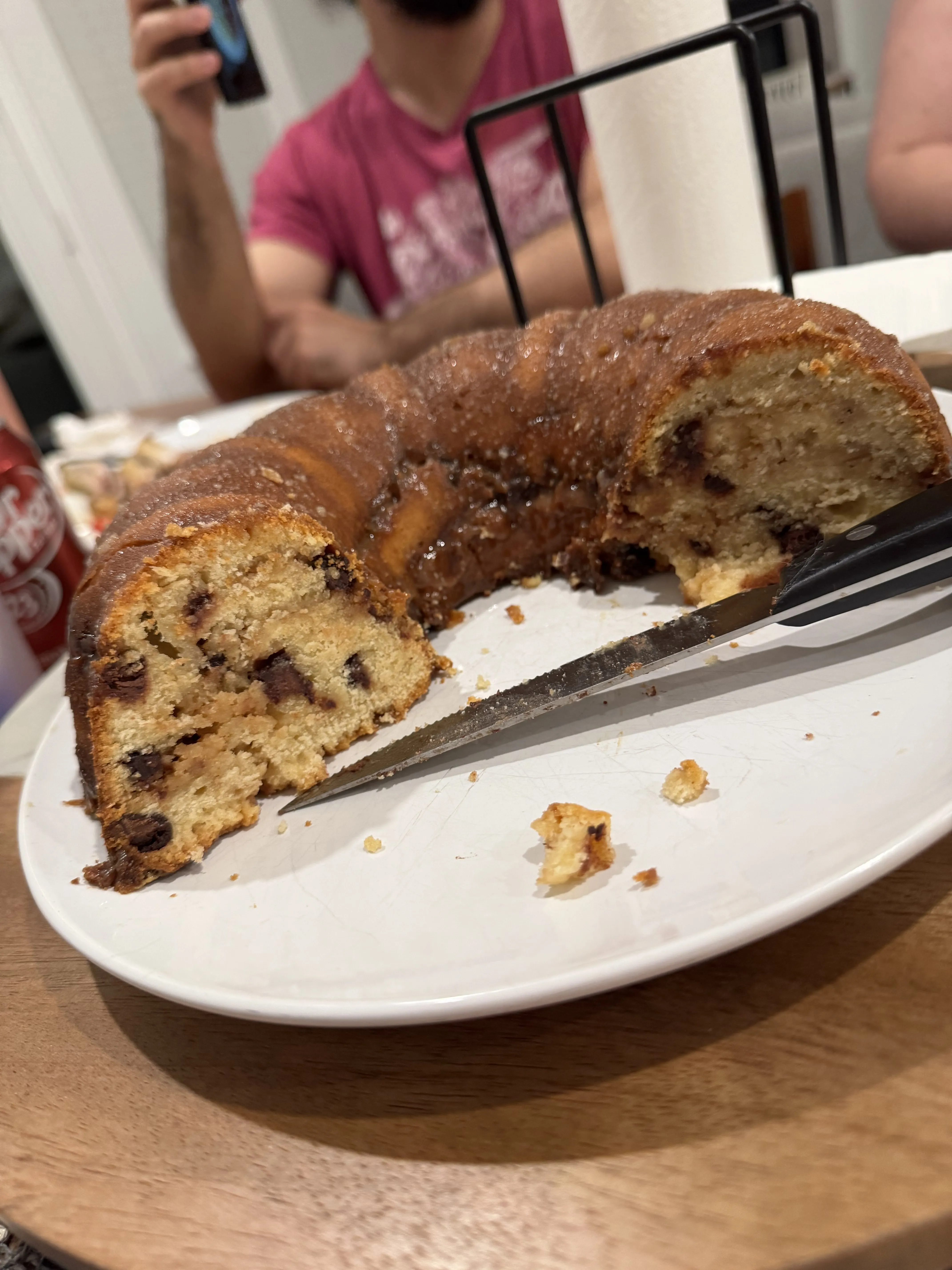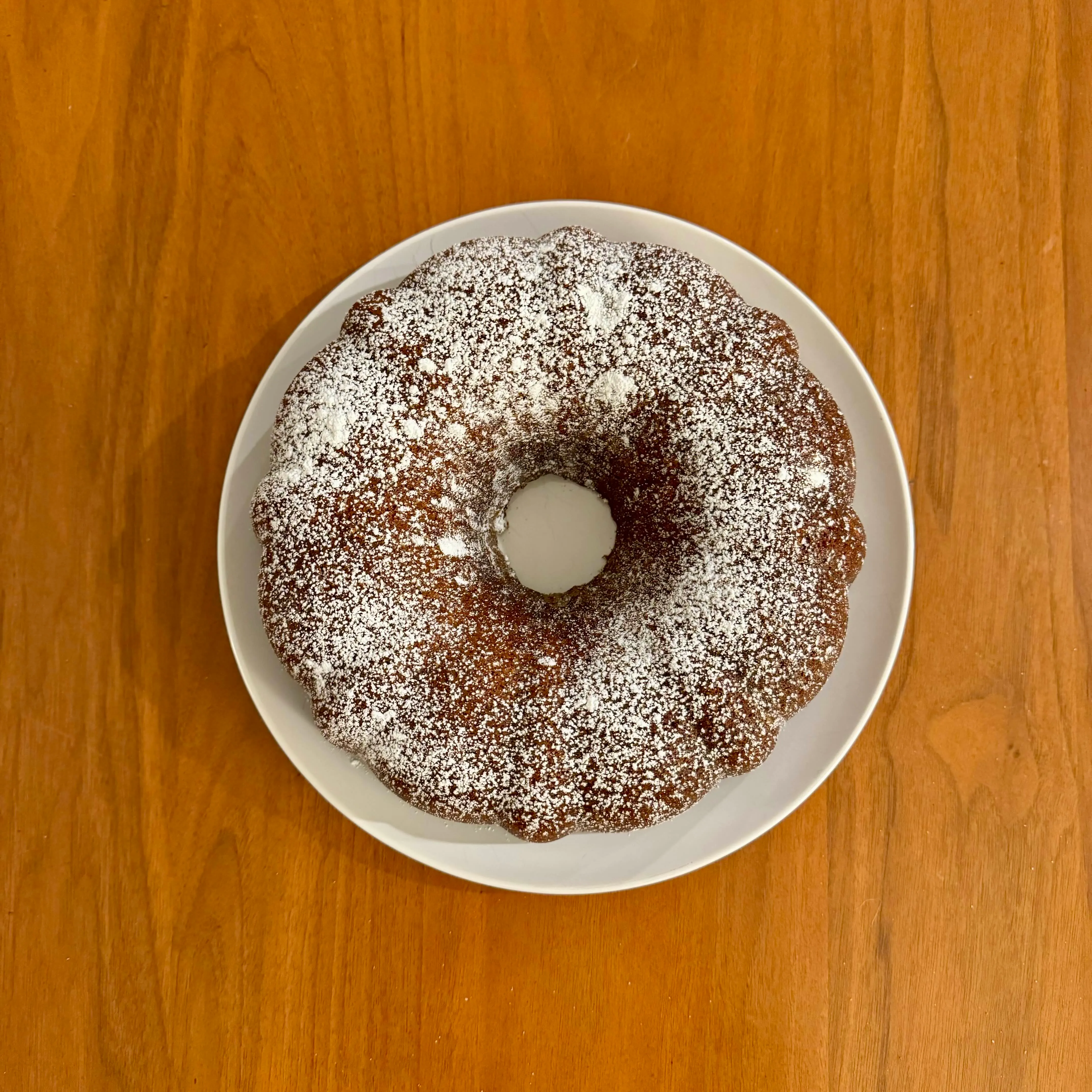 A plain brown bundt cake with a heavy dusting of powdered sugar across the ridges - Sunday baking for the week ahead.
