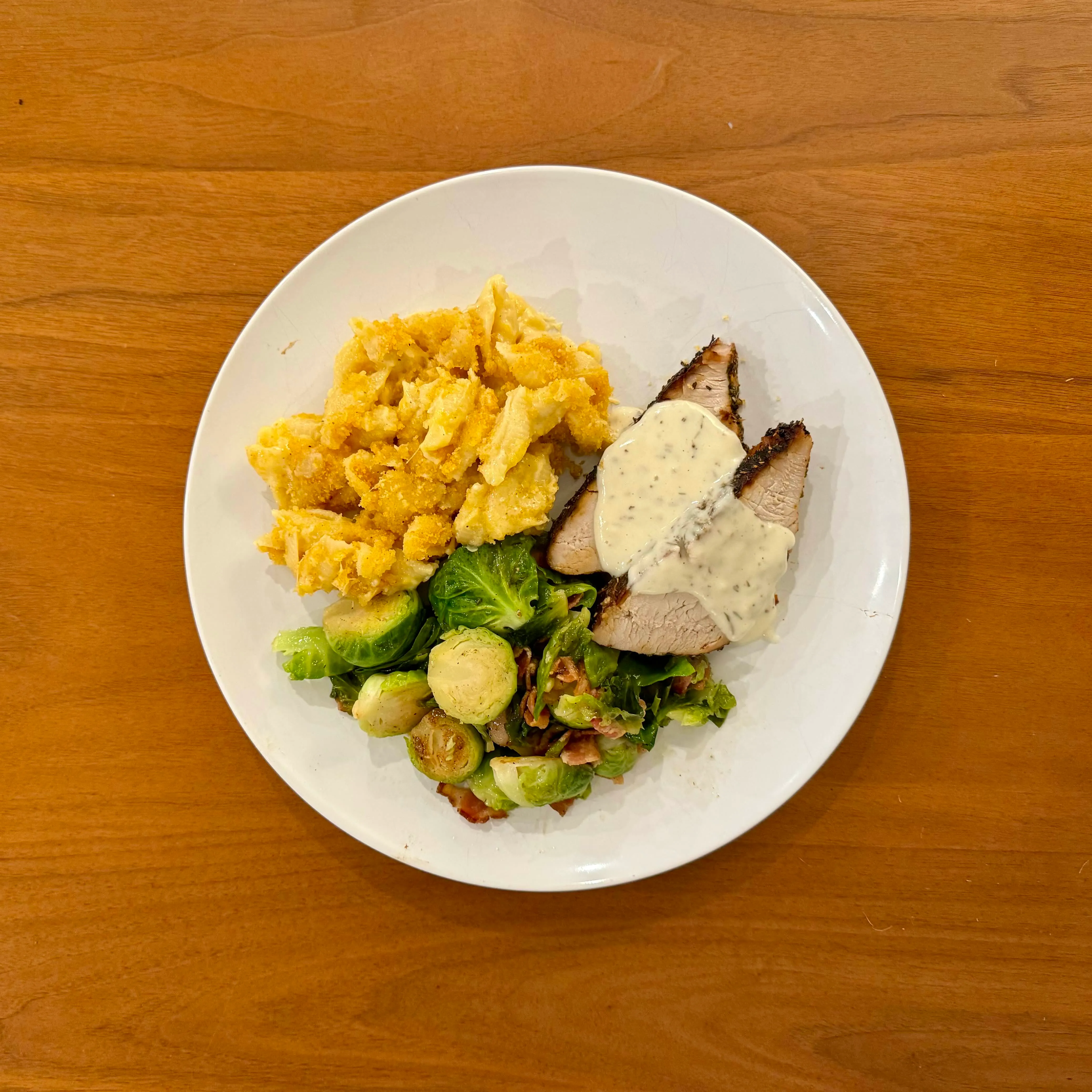 Sliced pork tenderloin with a pepper-cream sauce, a mound of cracker-topped cheesy potatoes, and a pile of shaved brussels with bacon.