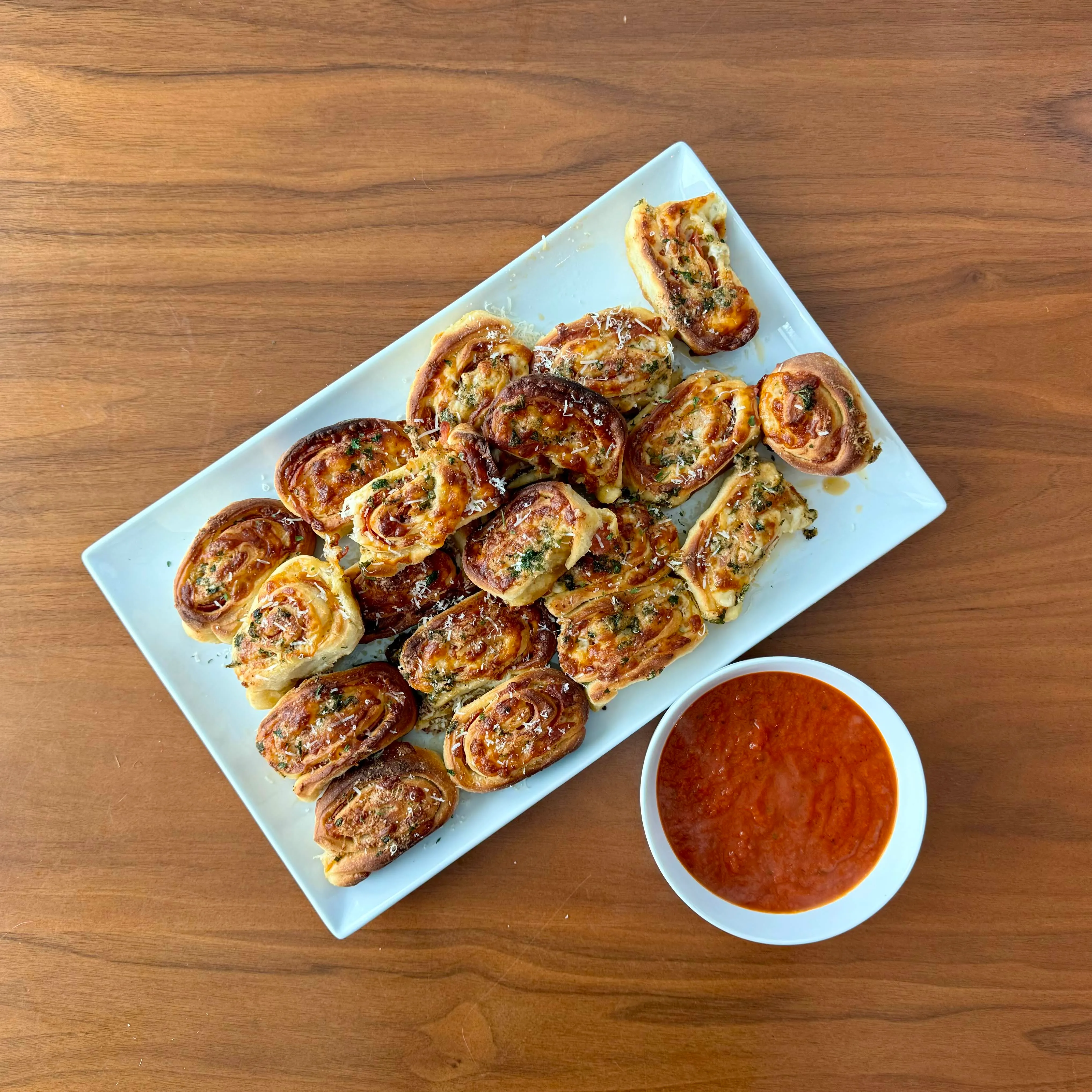 A platter of baked pizza pinwheels - spiraled dough, cheese, and herbs - next to a ramekin of warm marinara for dipping.
