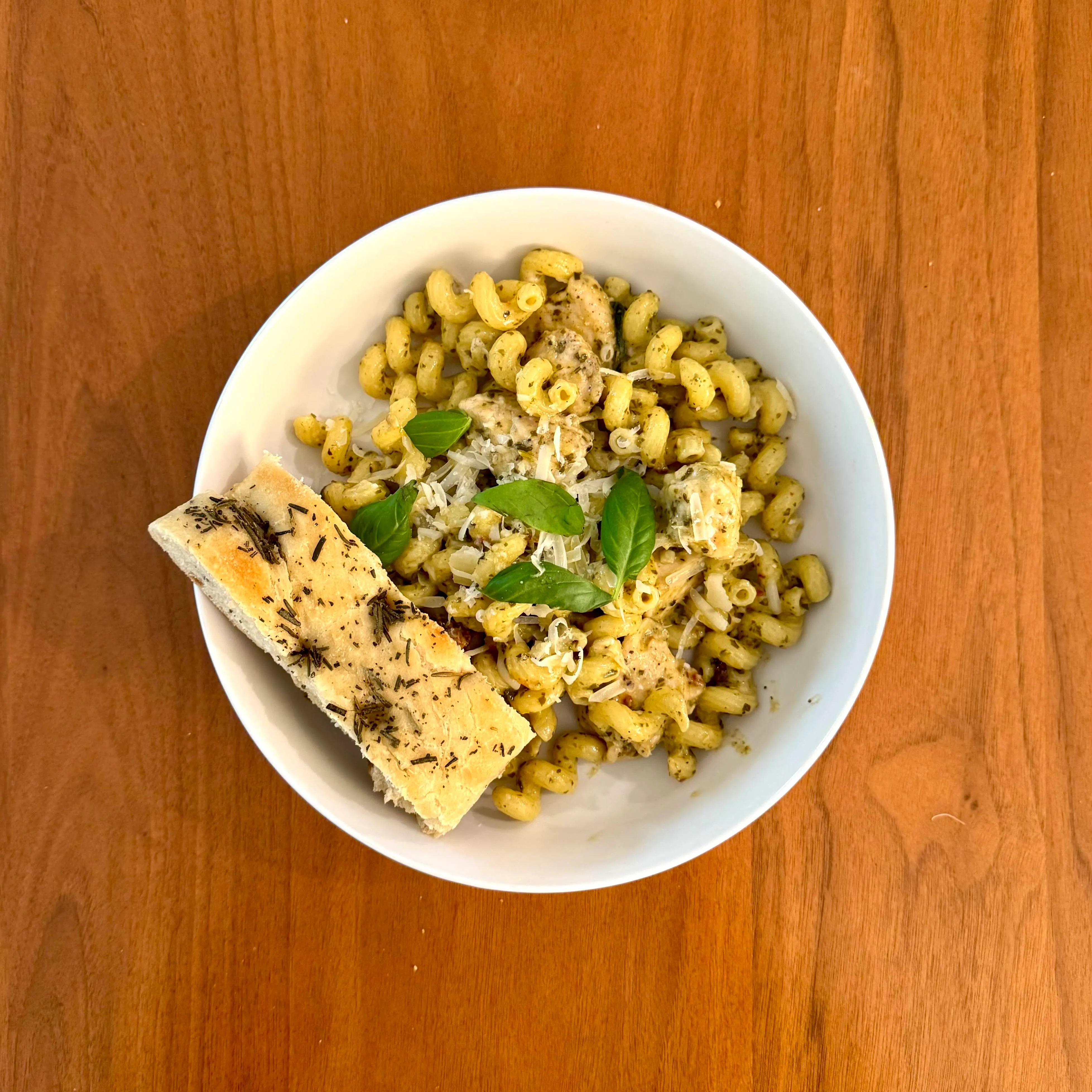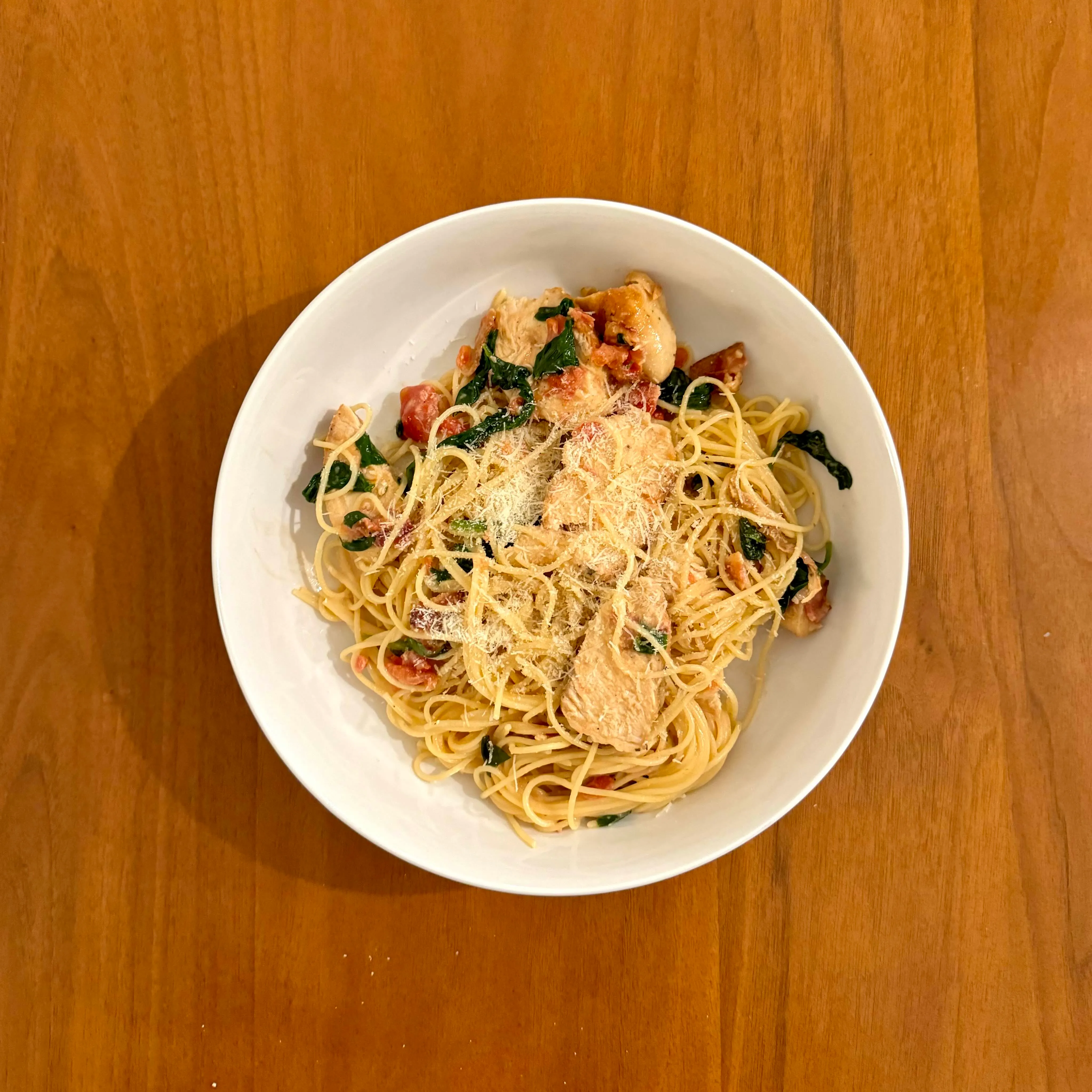 A shallow bowl of angel hair with chicken, bacon, spinach, and parmesan - a Monday dinner that refused to be complicated.