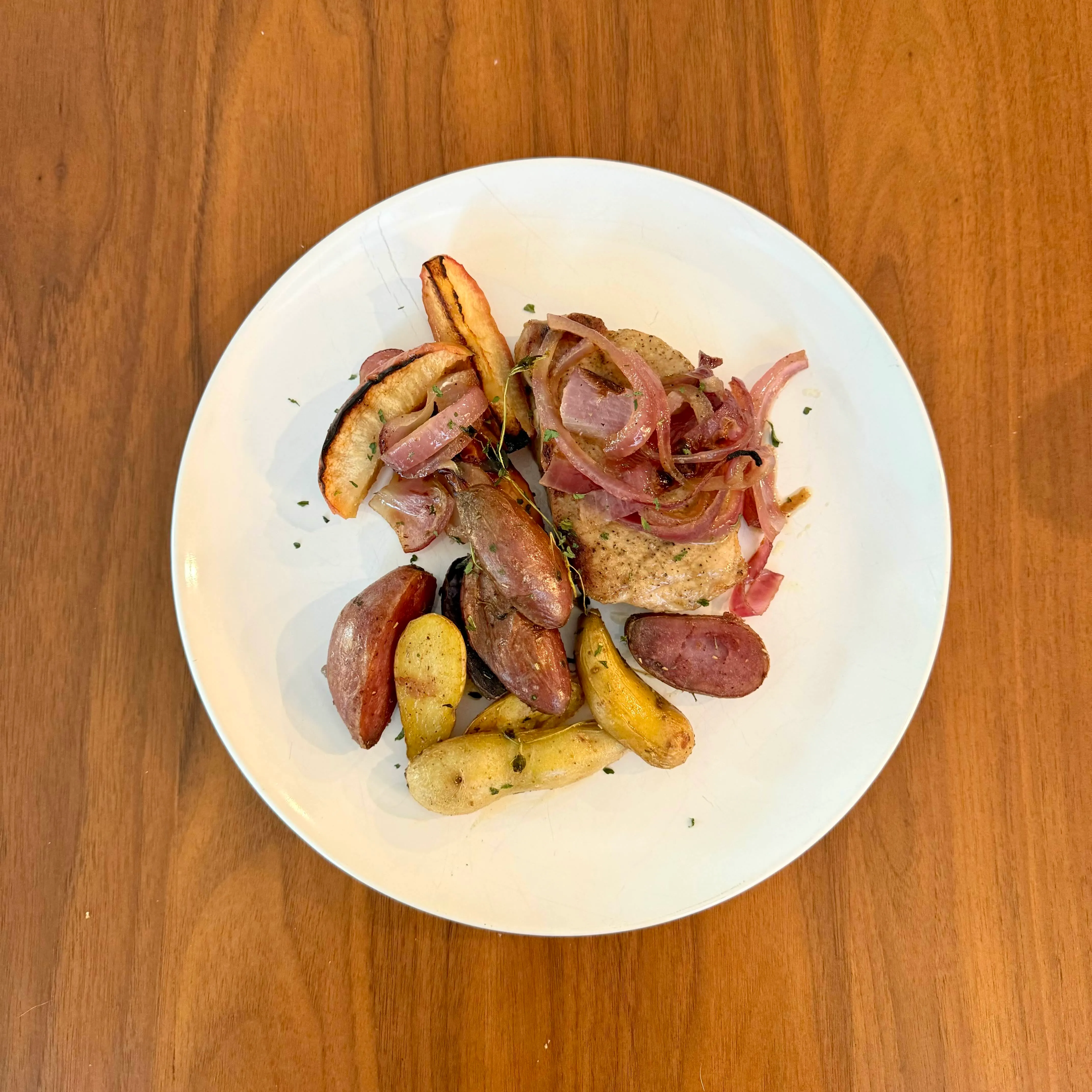 A pork tenderloin medallion under caramelized red onions and thyme, with a pile of tri-color fingerling potatoes roasted just dark enough.