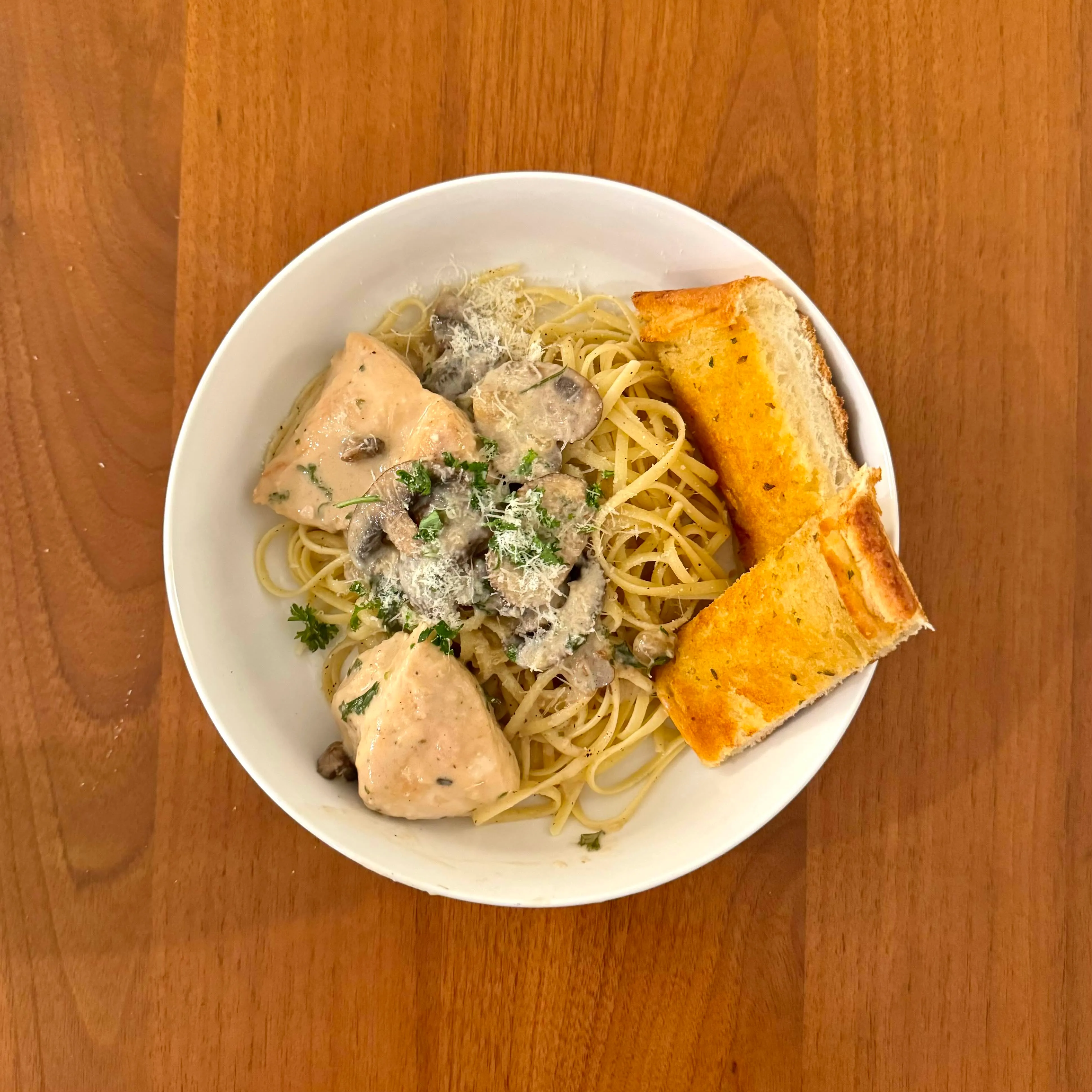 Chicken in a mushroom-cream marsala sauce over spaghetti with two thick pieces of garlic bread tucked into the bowl.