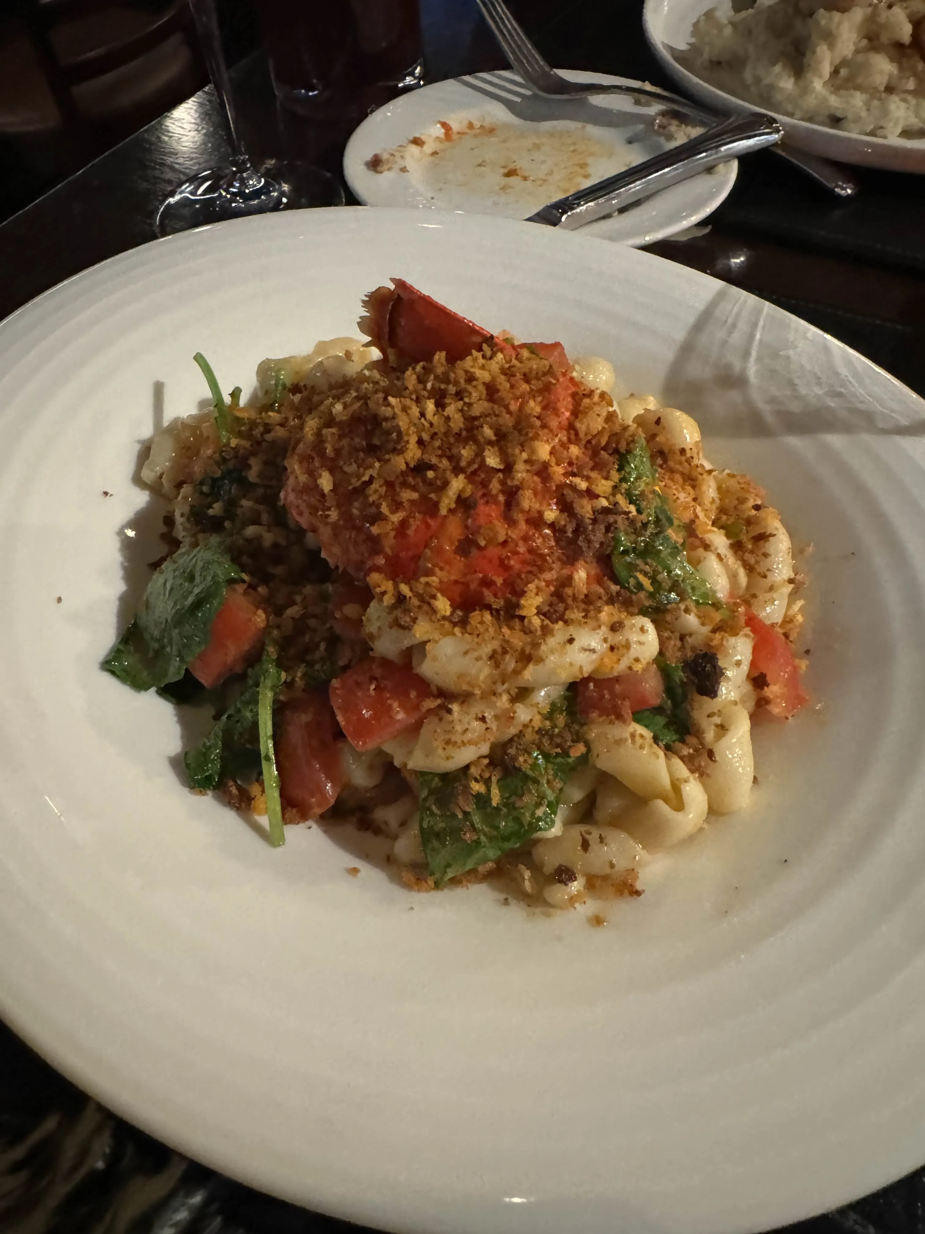 A rose-petal cocktail, crab cakes, fried potatoes with a pile of parmesan, lobster pasta, steak and scallops, a warm bread-pudding situation, and an espresso martini to close.