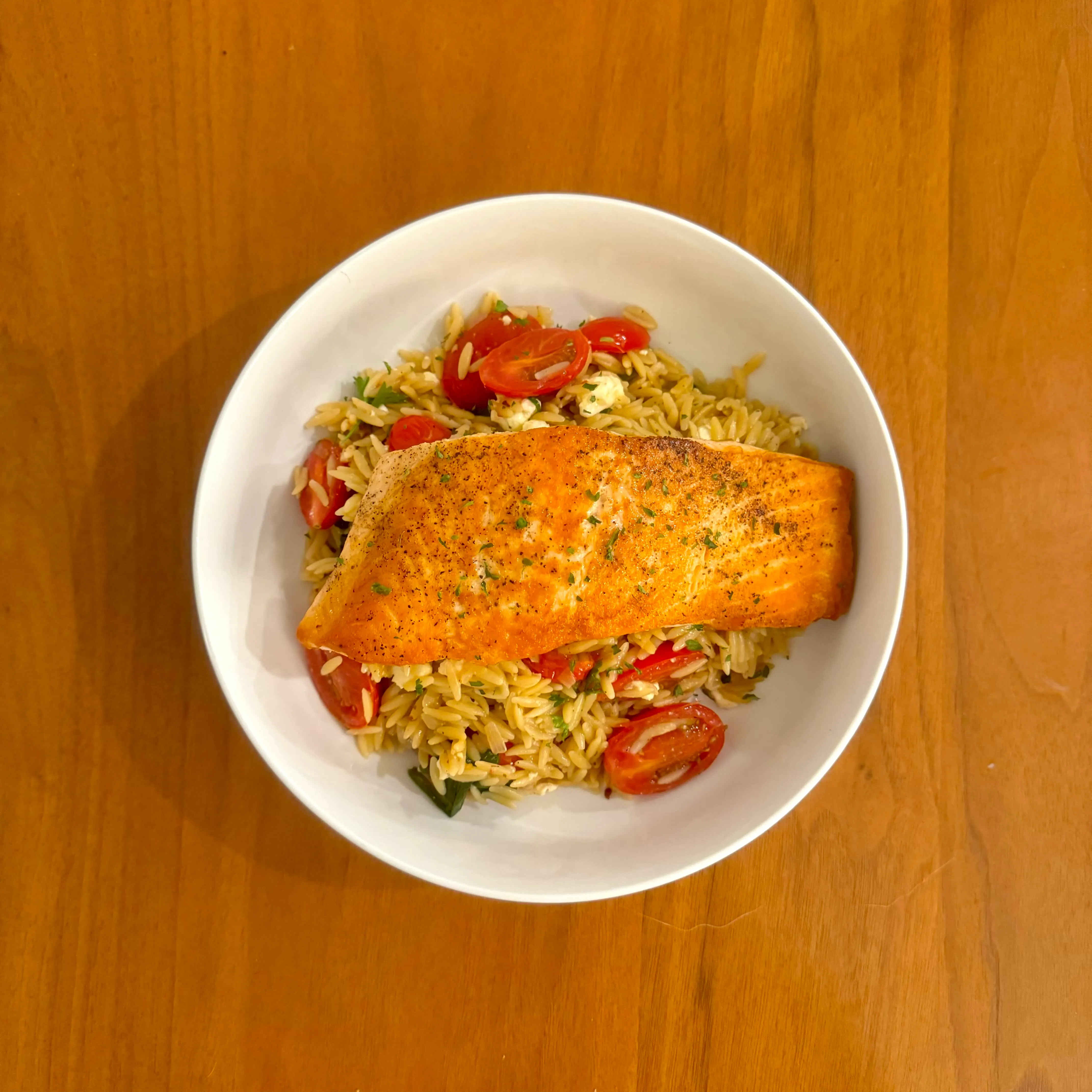 A pan-seared salmon fillet on a bed of orzo with halved cherry tomatoes, feta, and parsley - a dinner that tastes like August in November.