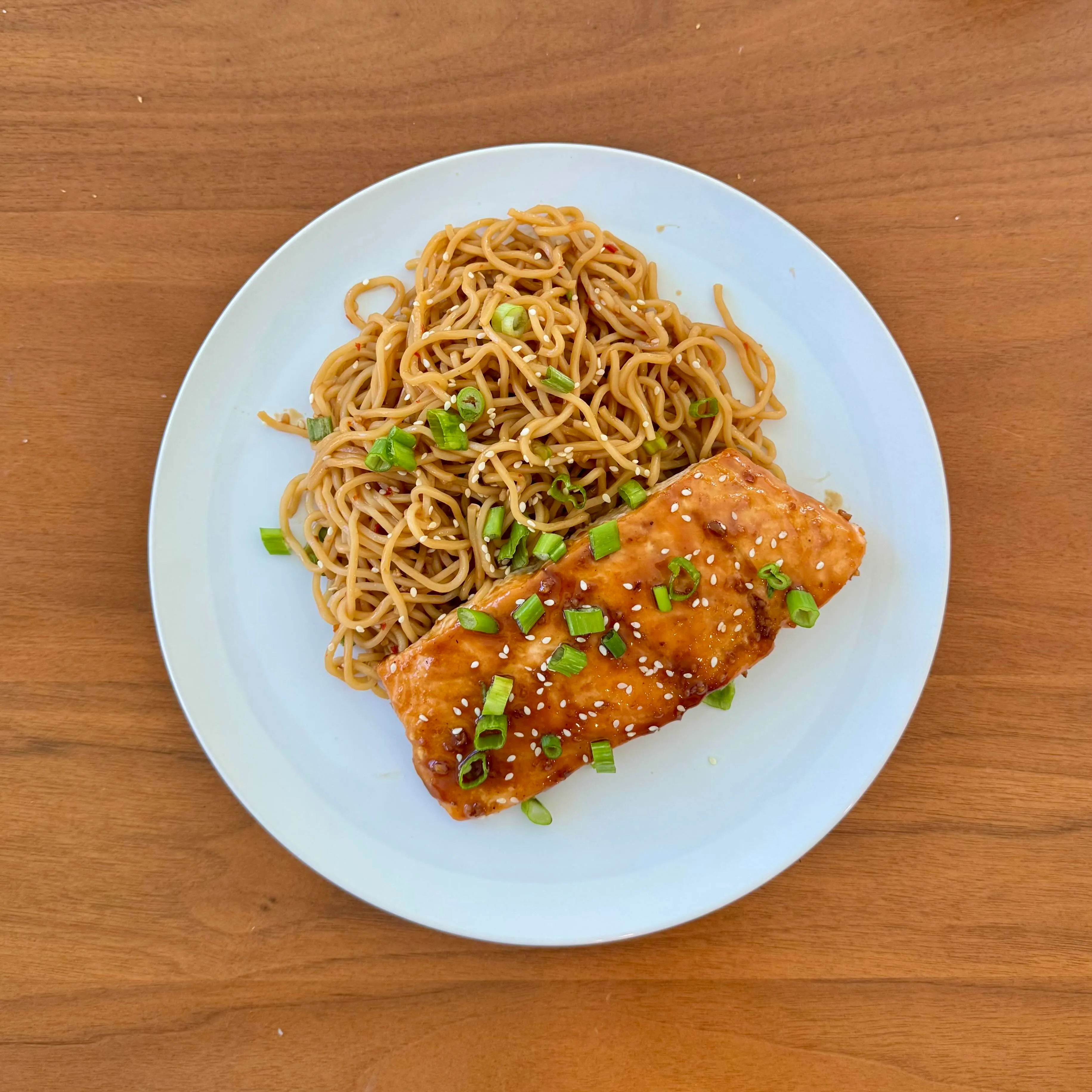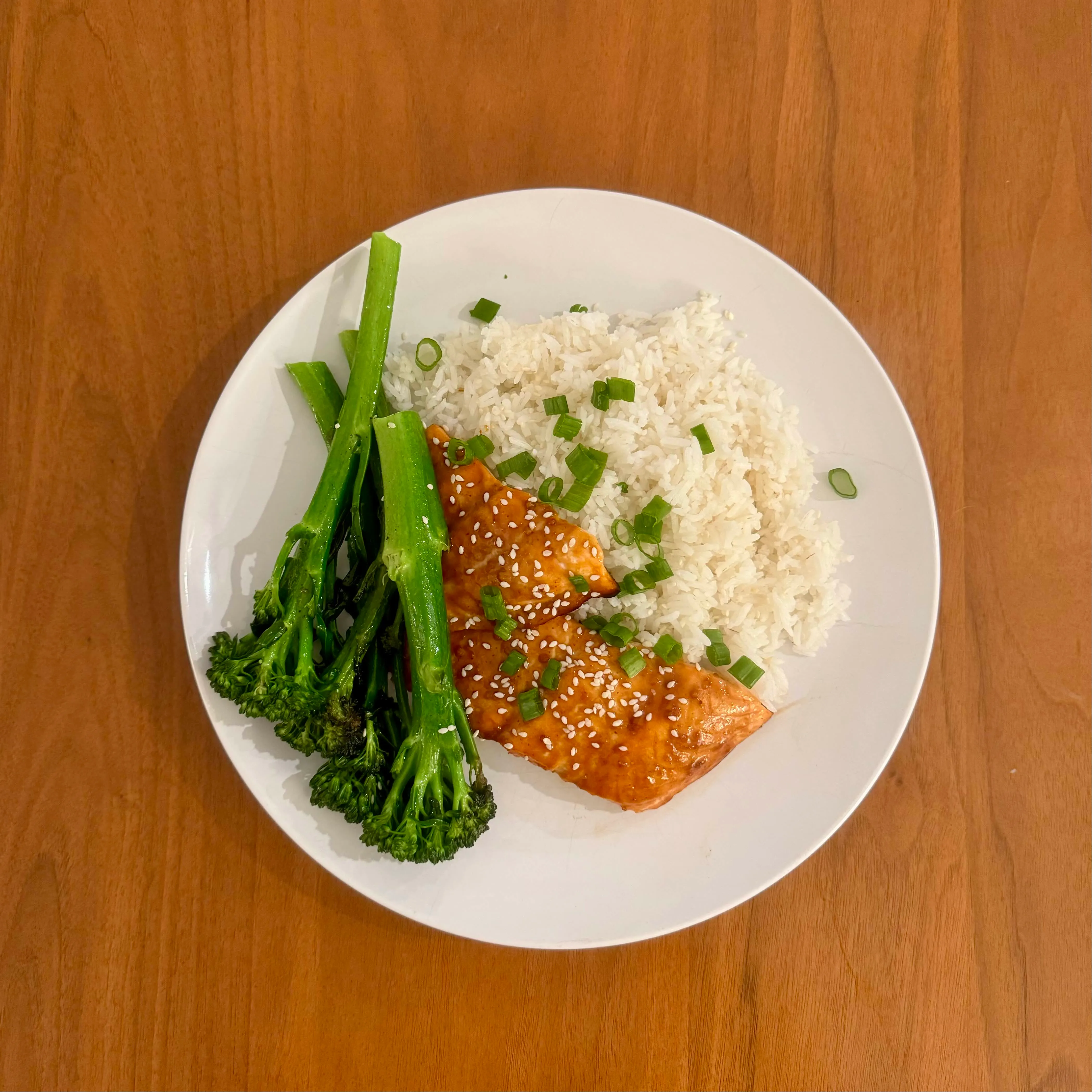A teriyaki-glazed salmon fillet with a pile of jasmine rice, steamed broccolini, and sesame seeds across everything.