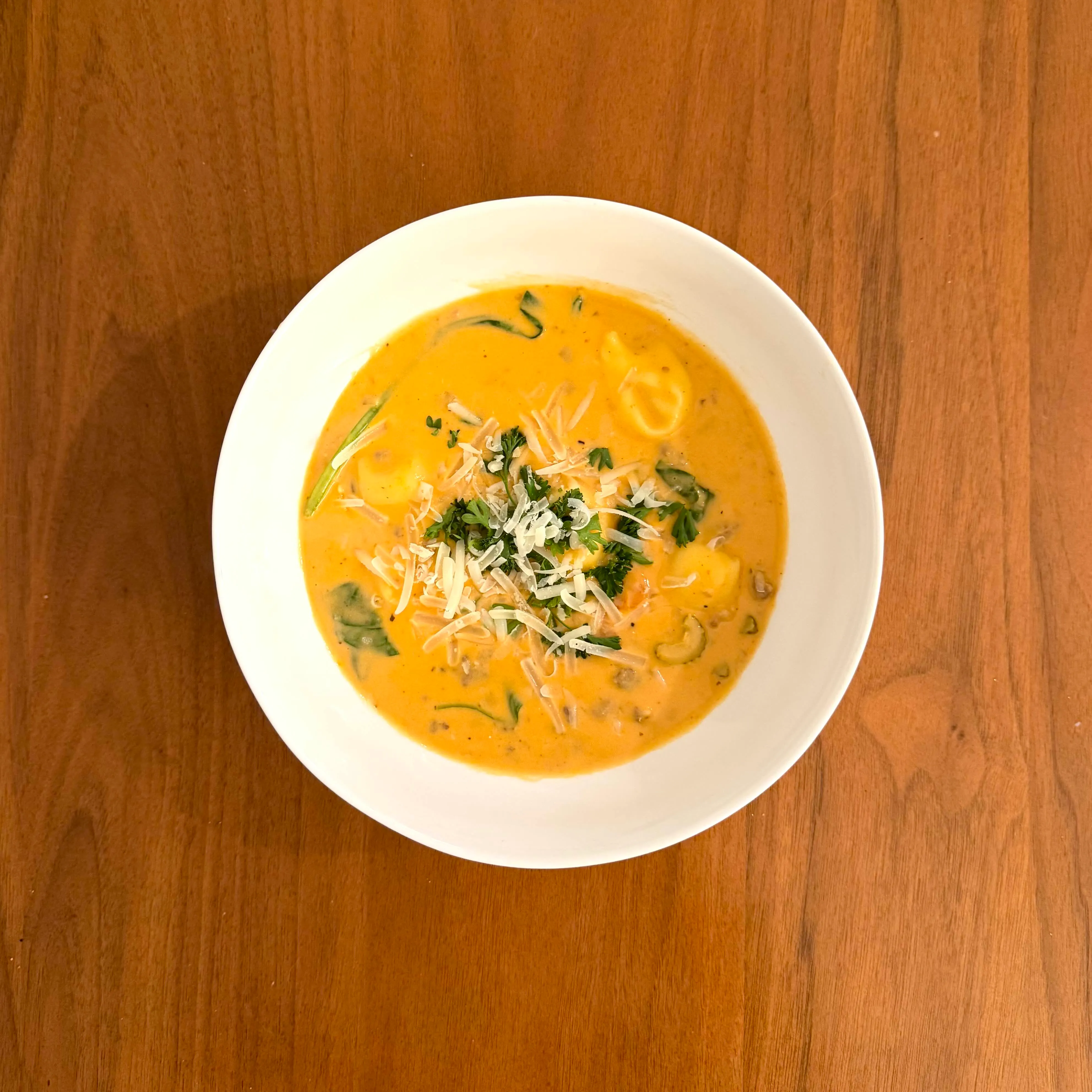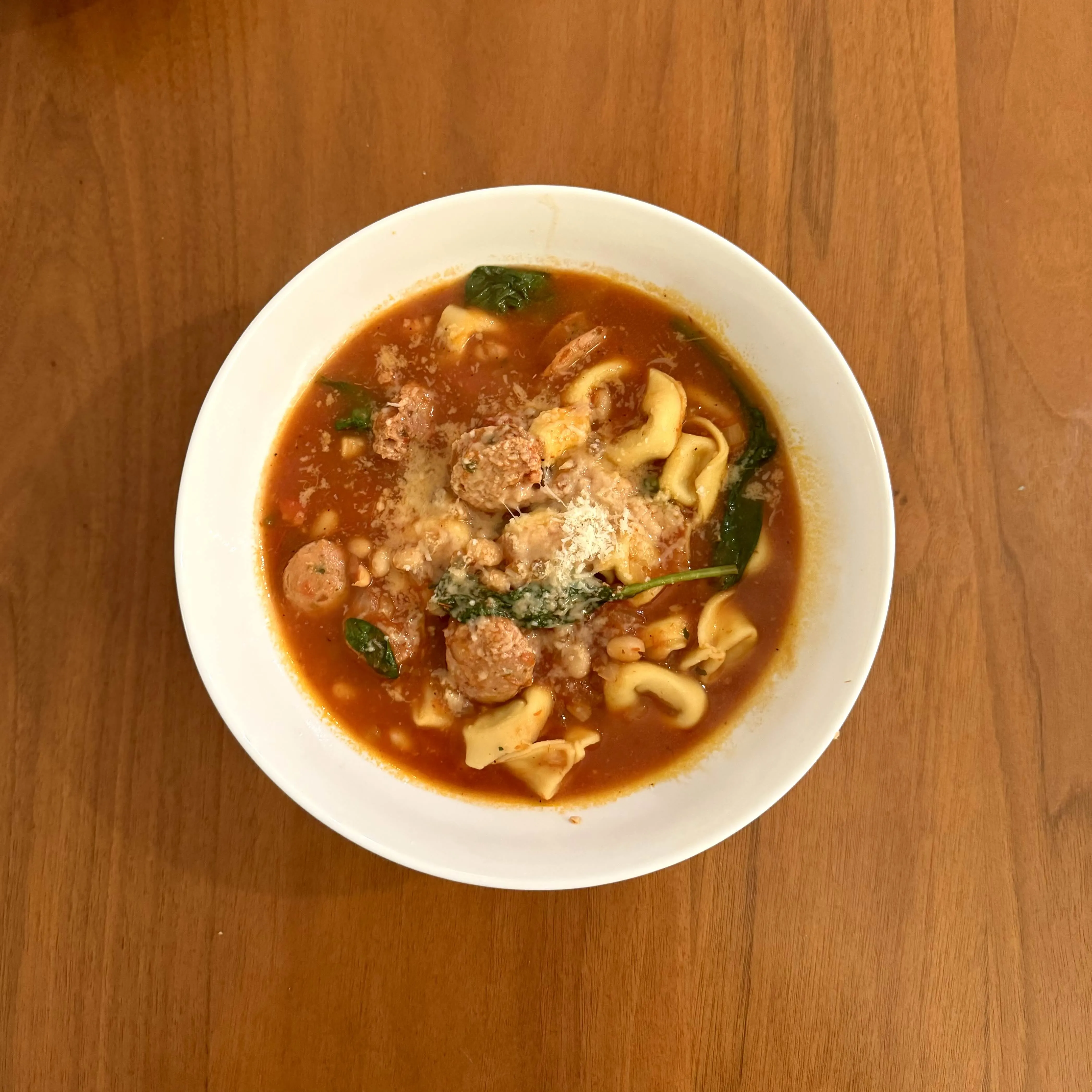 A bowl of tomato-broth soup with cheese tortellini, slices of Italian sausage, white beans, and a lot of spinach wilted in at the end.