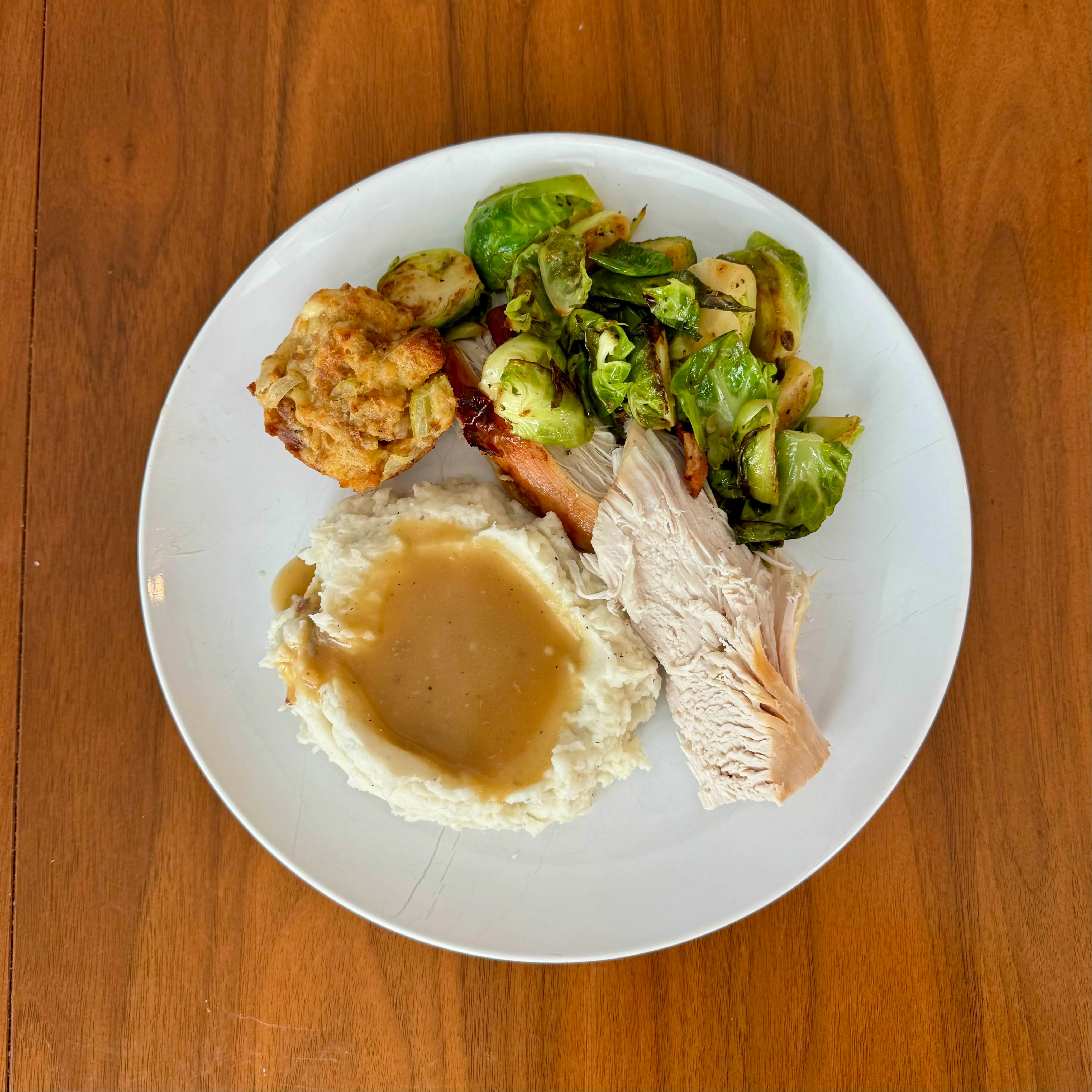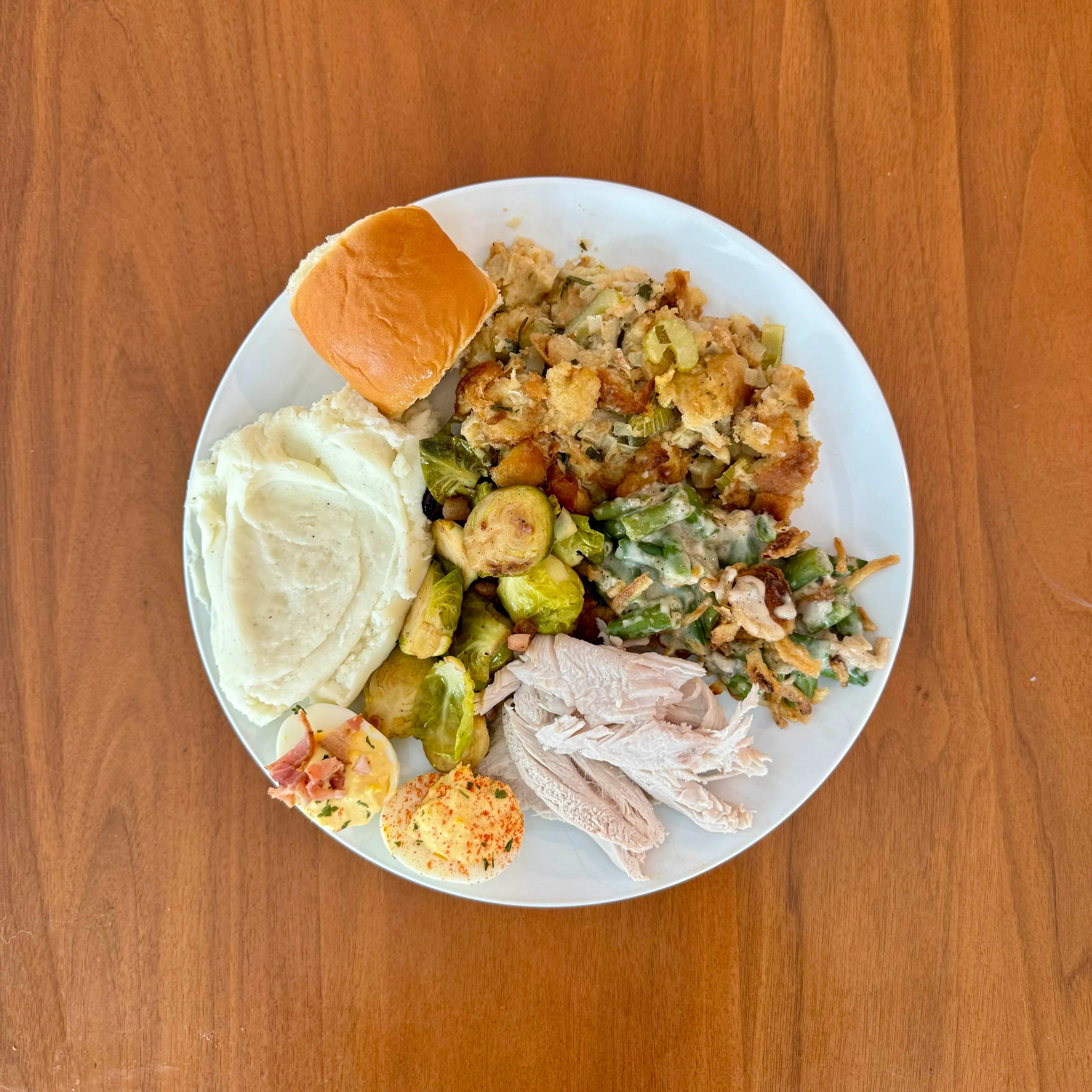 One loaded plate of turkey, stuffing, mashed potatoes, brussels, green bean casserole, a roll, and a deviled egg - the whole table on a single dish.