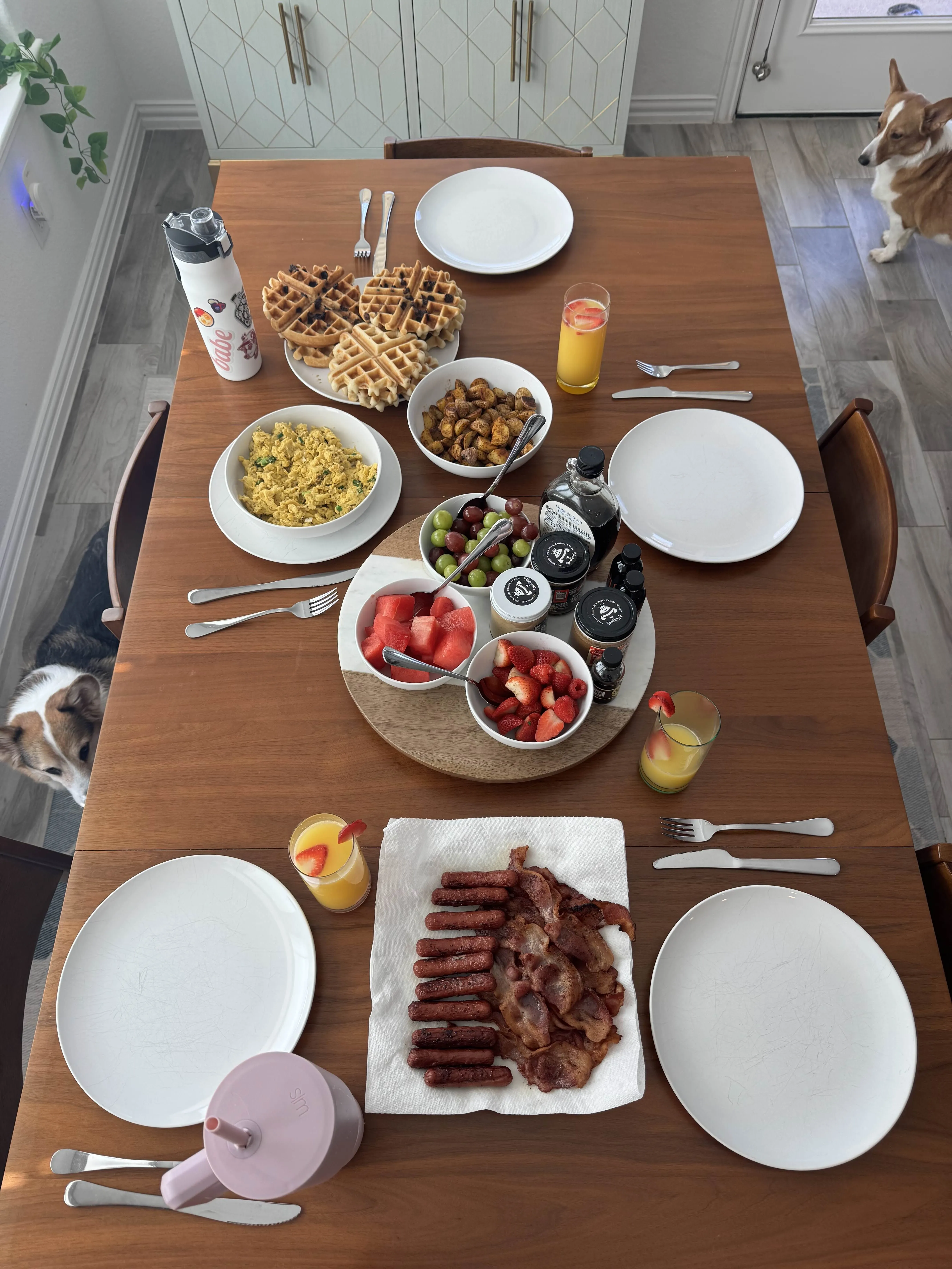 A long wood table set for late breakfast - waffles, bacon, sausage, eggs, roast potatoes, fruit, orange juice - with a corgi peering in from each side.