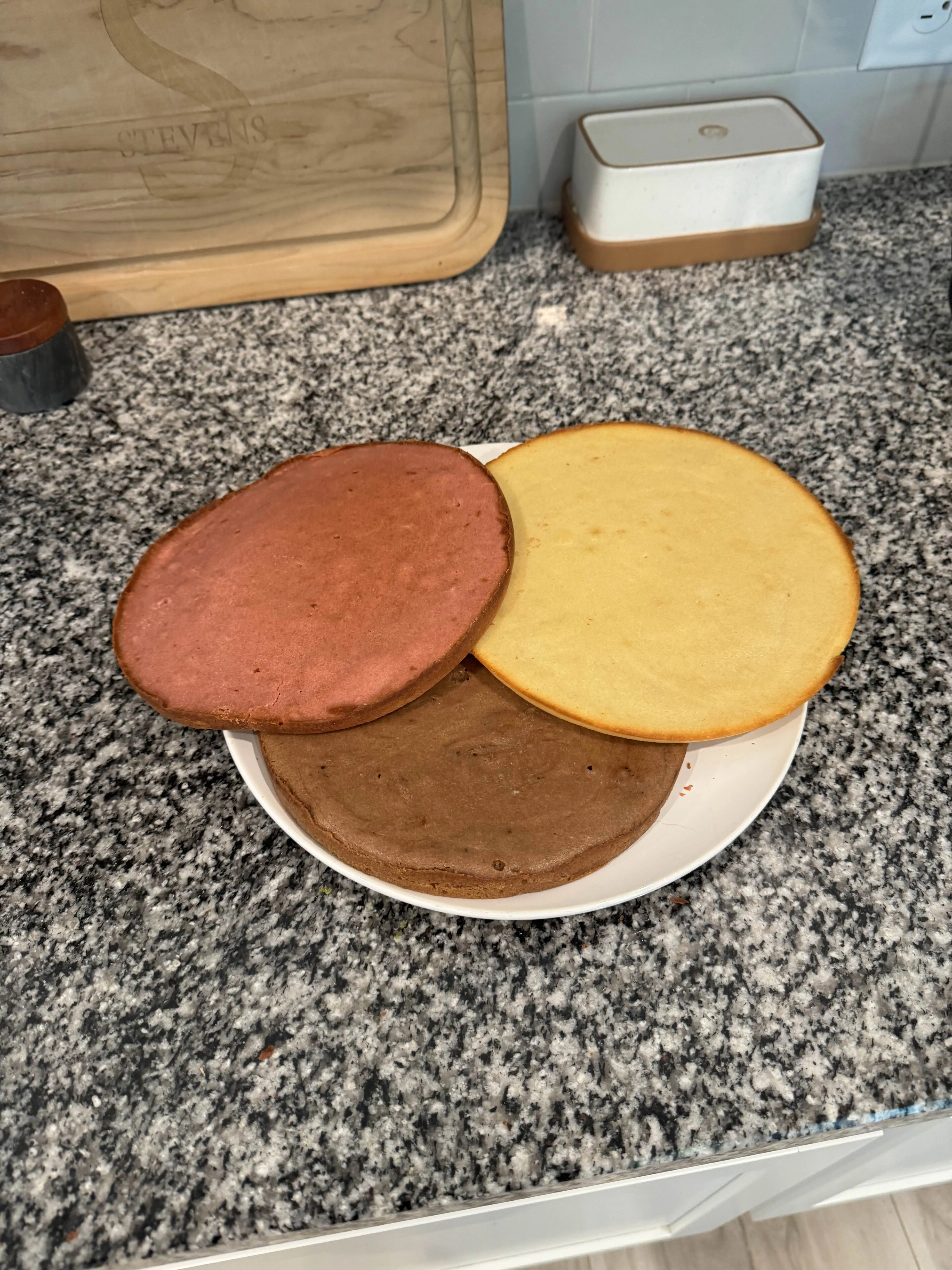 Chocolate, strawberry, vanilla. Before frosting, before assembly - just the three layers resting on a plate, waiting.