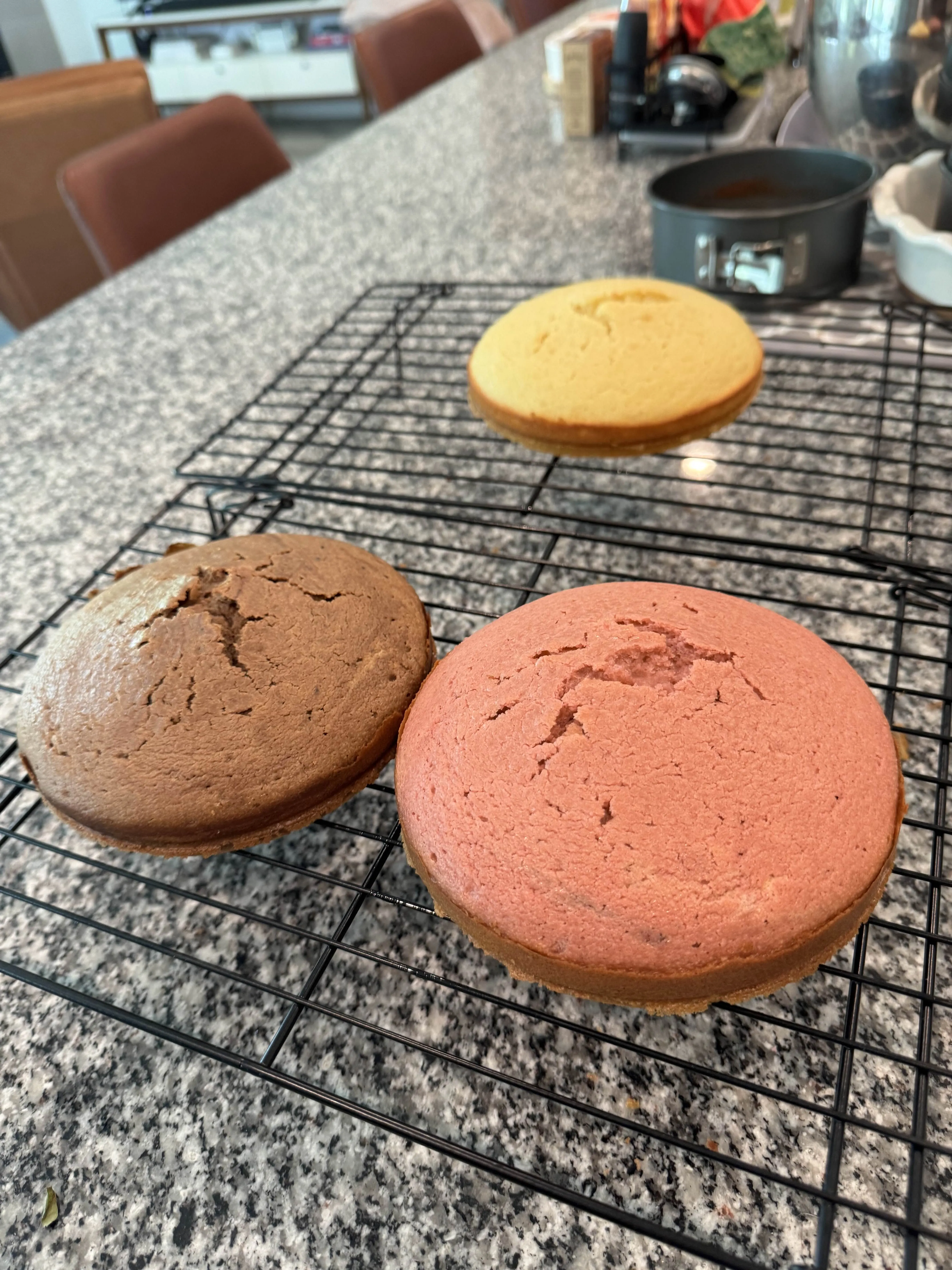 A second photo of the three neapolitan cake rounds cooling on the rack - vanilla up top, strawberry and chocolate in front, all naked and waiting.