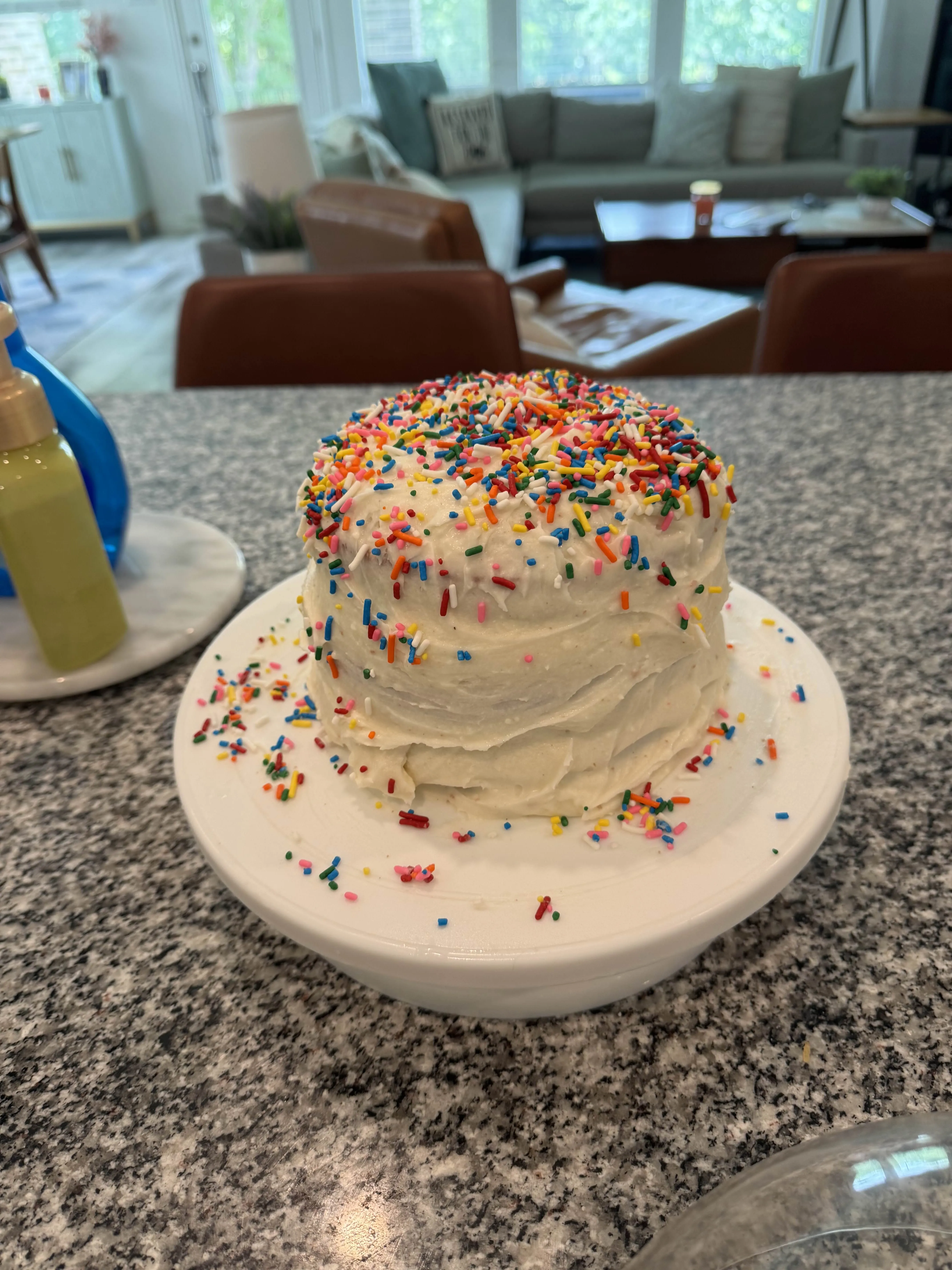 A small frosted vanilla cake covered in rainbow sprinkles - a practice run before I tackled a bigger birthday cake later in the week.