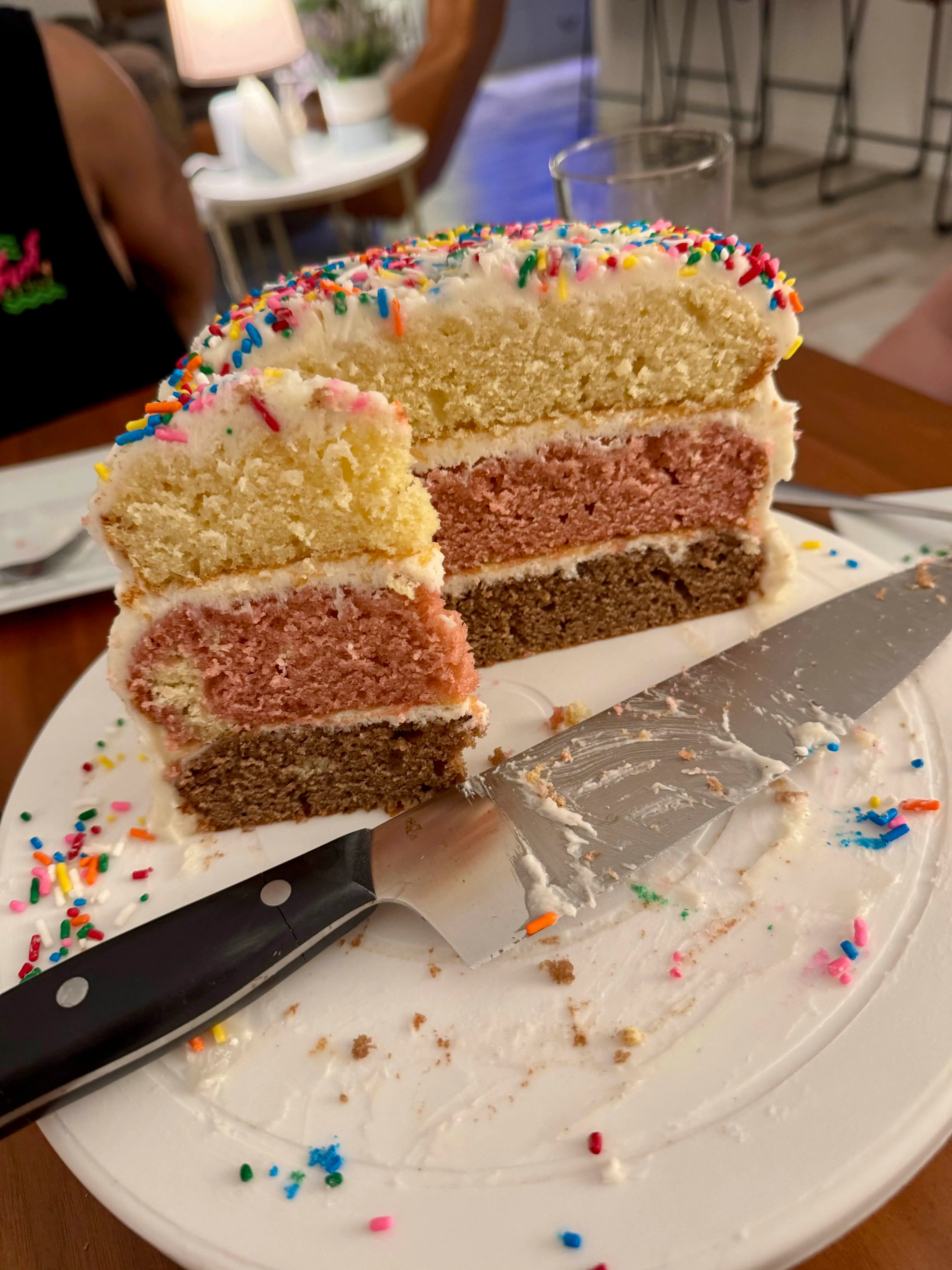 Three layers stacked, vanilla buttercream over everything, rainbow sprinkles because it was a birthday. Also: a bowl of lo mein, because people have to eat before cake.