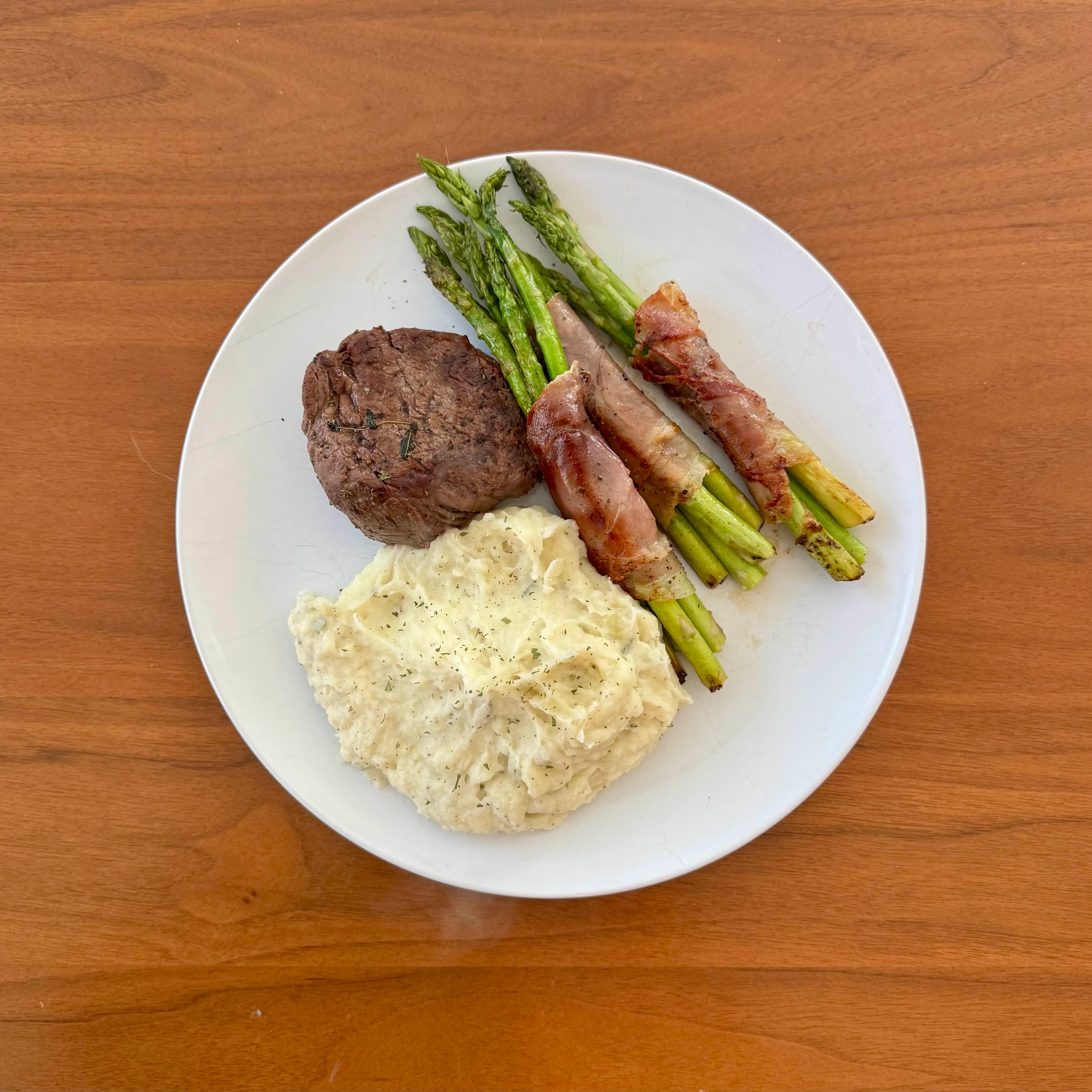 A small filet with garlic mashed potatoes and a little pile of prosciutto-wrapped asparagus - a Tuesday that felt like a holiday.