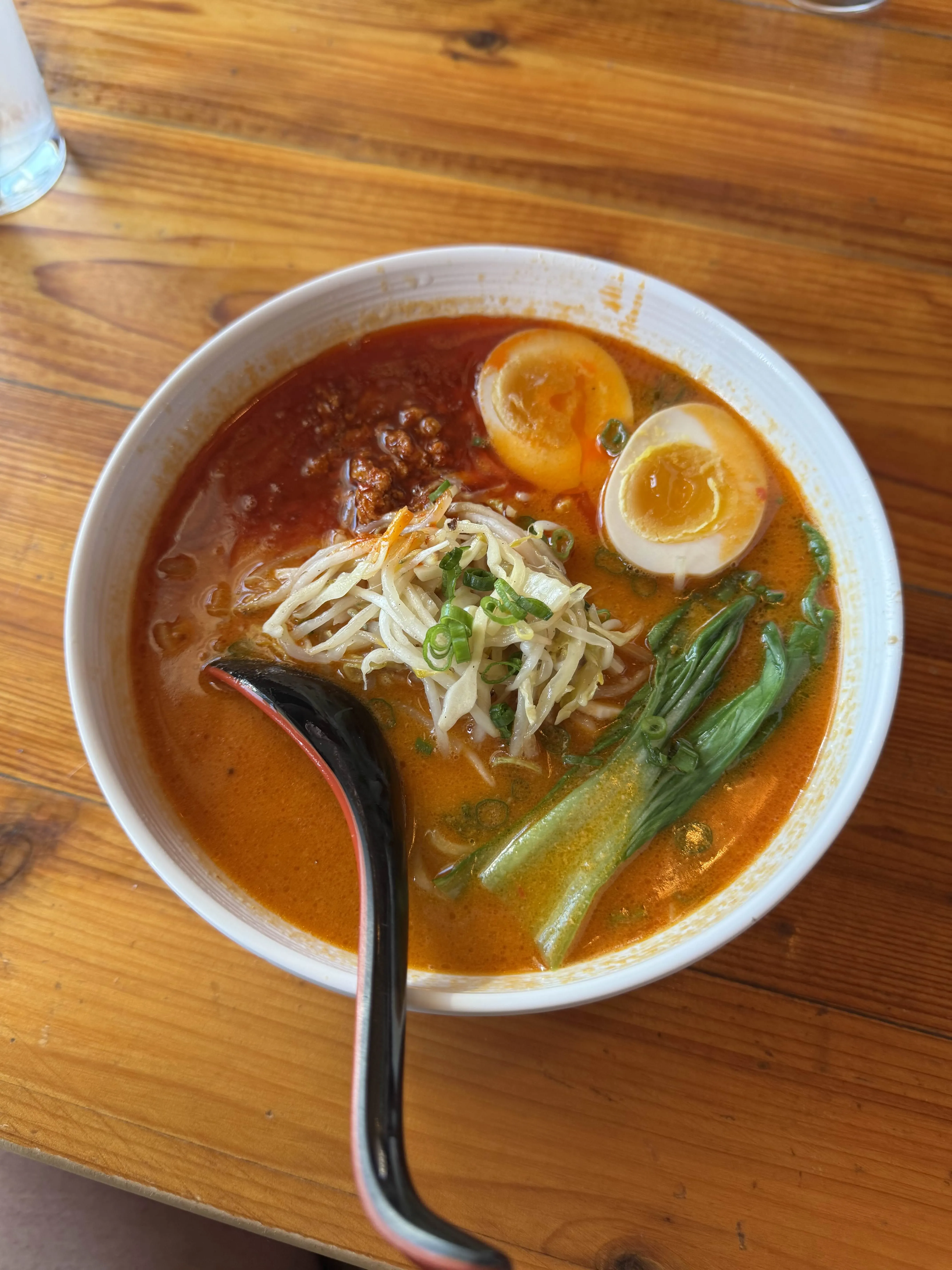A bowl of spicy tantan-style ramen with a jammy egg half, bean sprouts, bok choy, and a black ceramic spoon - a Friday lunch at the place we keep going back to.