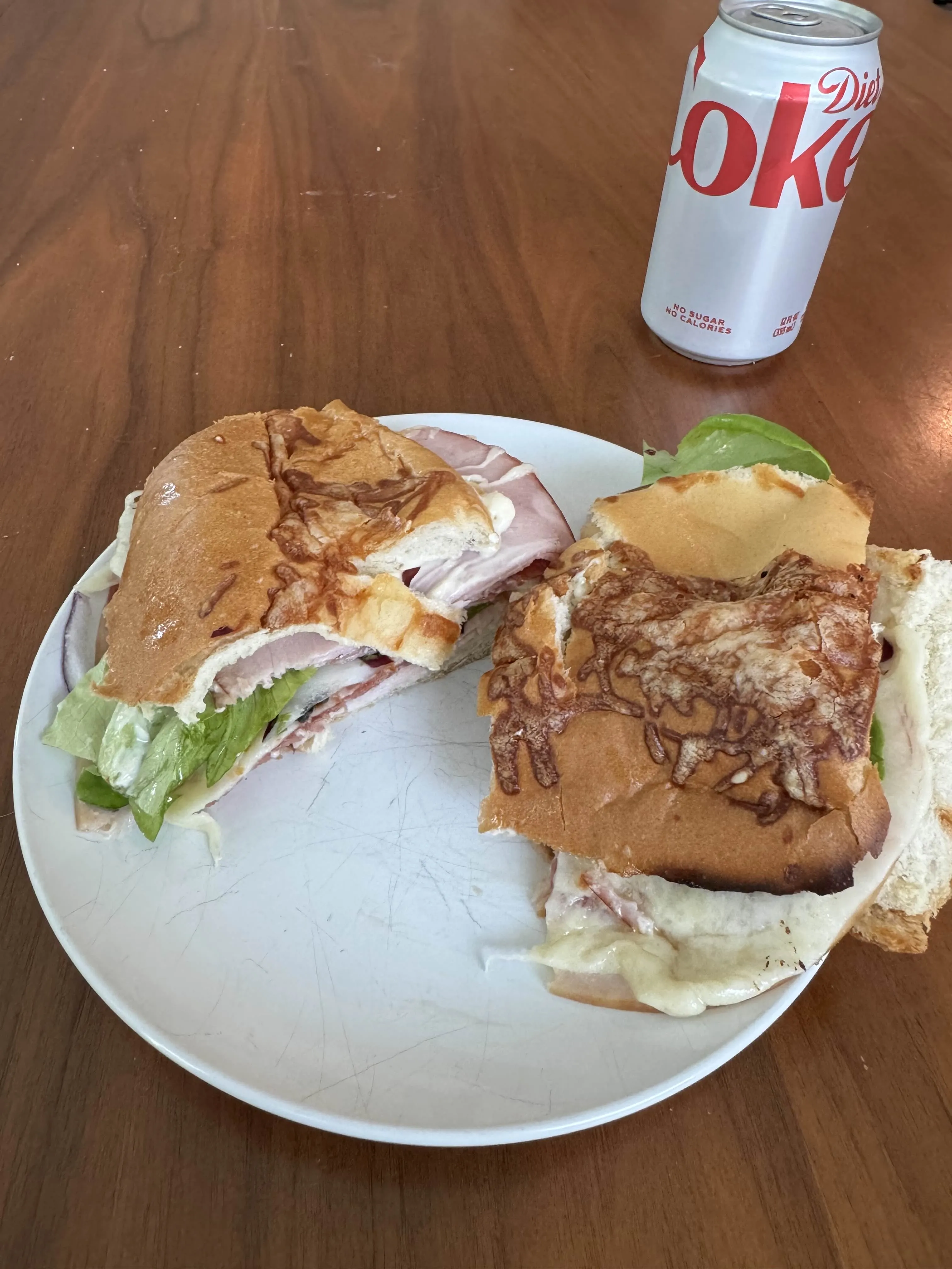 Two halves of a crusty-cheese-topped sub stuffed with ham, salami, lettuce, onions, and melting cheese, with a cold Diet Coke on the side.