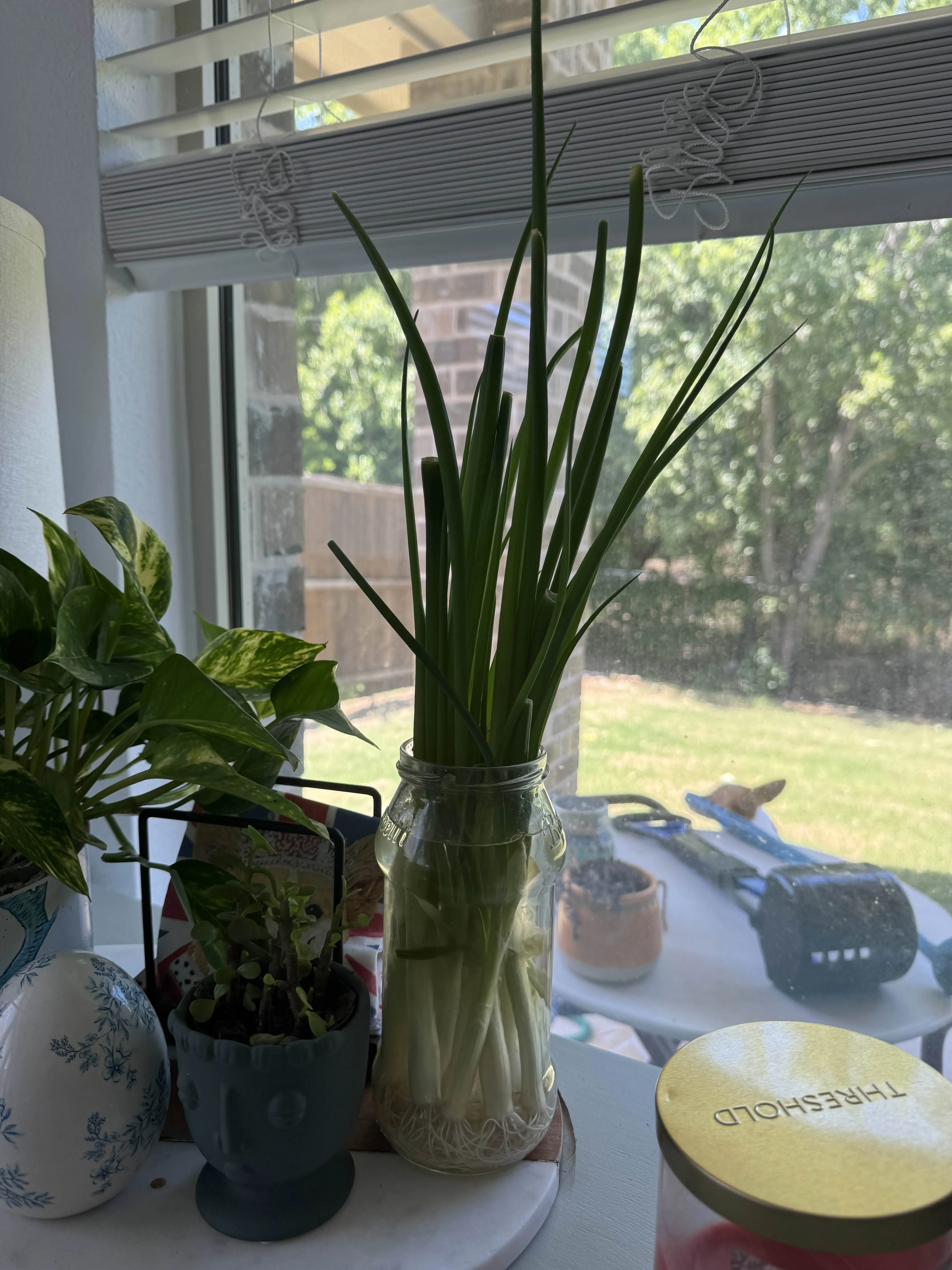 A small jar on the windowsill holding the white ends of a scallion bunch, already sending up new green - the cheapest kitchen trick there is.