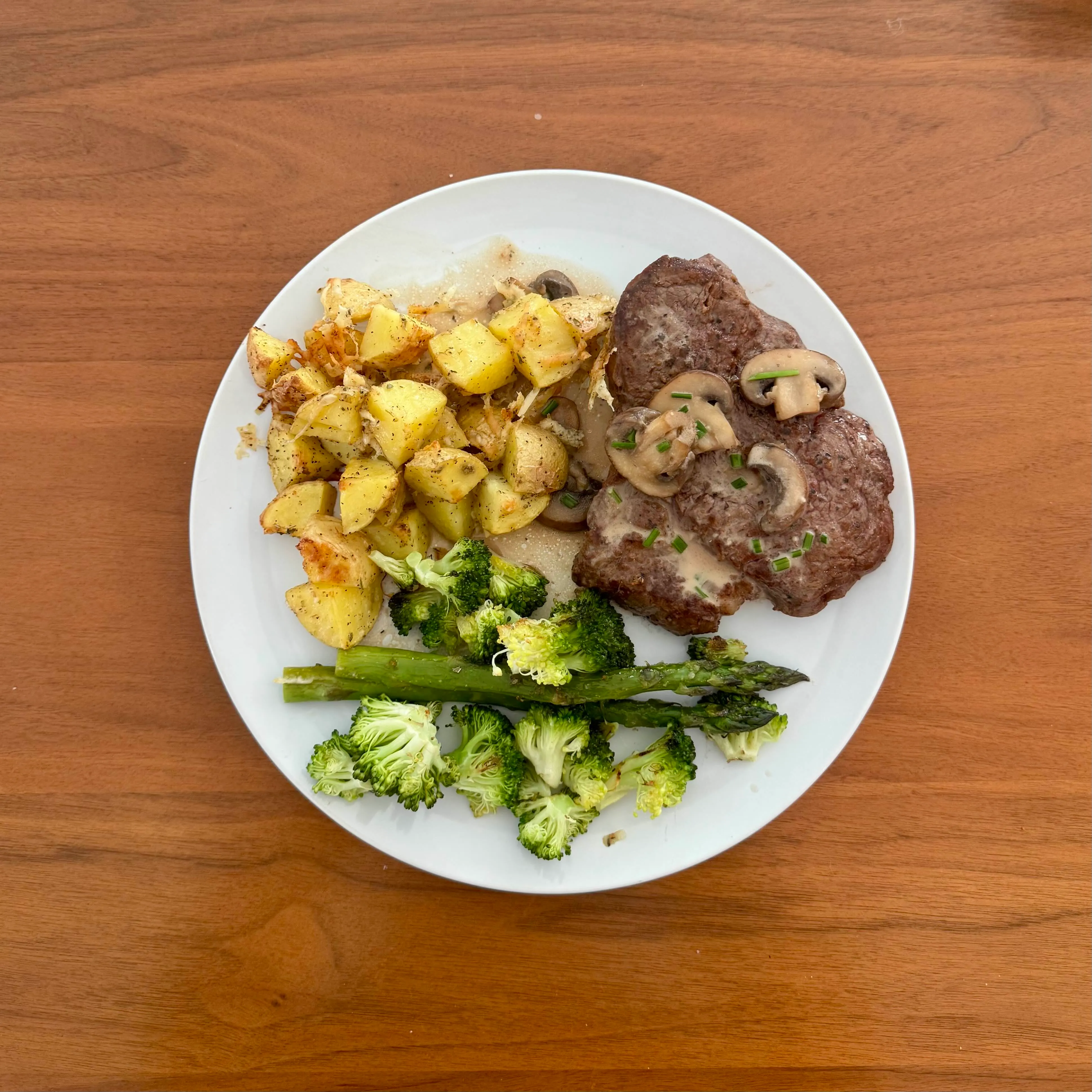 A salisbury steak under a mushroom-gravy with chive, a pile of roasted potato cubes, and a tangle of broccoli and asparagus - a Monday that wanted an old-fashioned plate.
