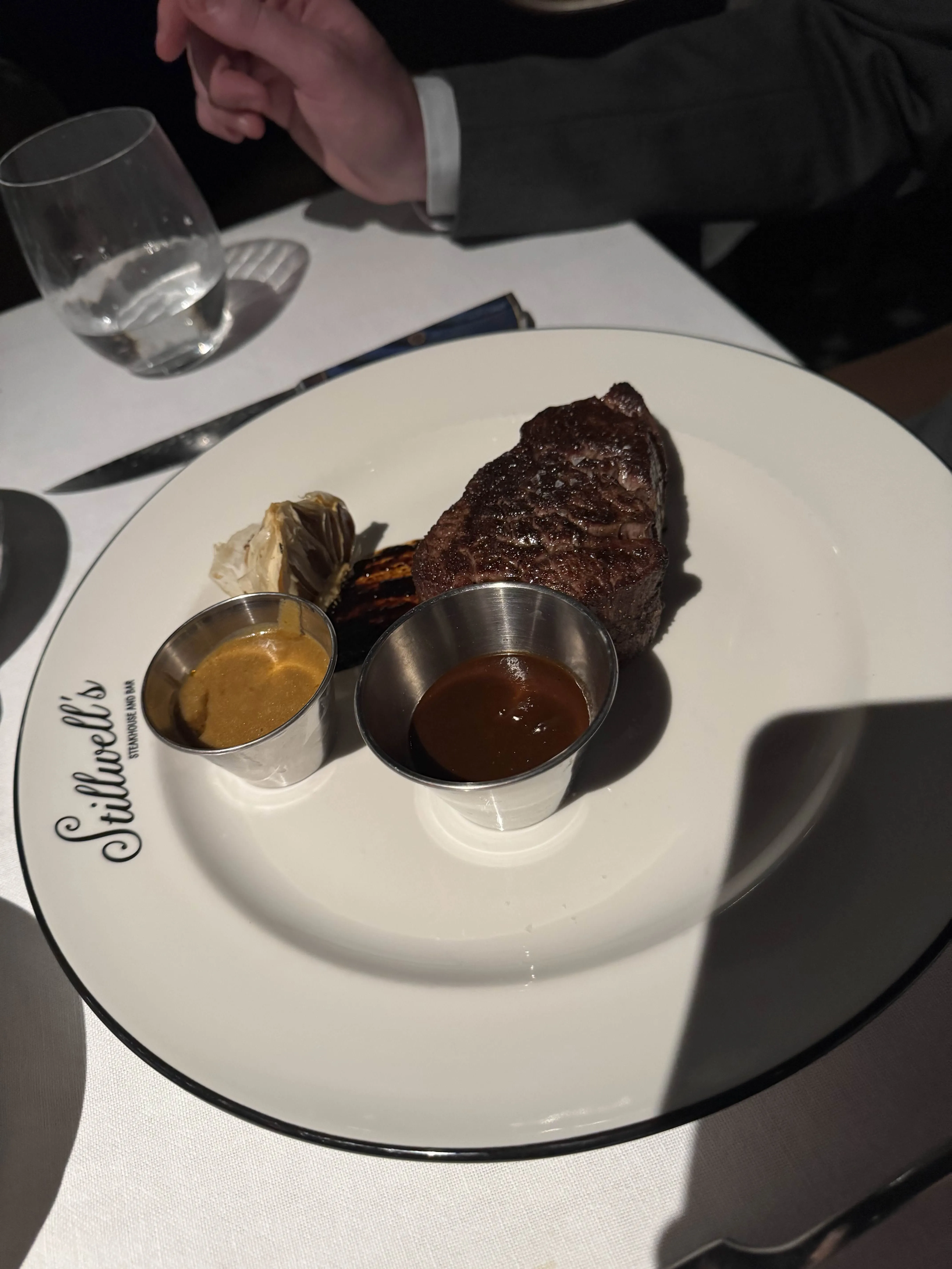 A long dinner at a steakhouse - pull-apart bread, deviled eggs with piped yolk, a soft cocktail with a tuile, bisque under a charcoal crisp, a crab-topped filet, a bone-in ribeye, three sides, and the walk home.