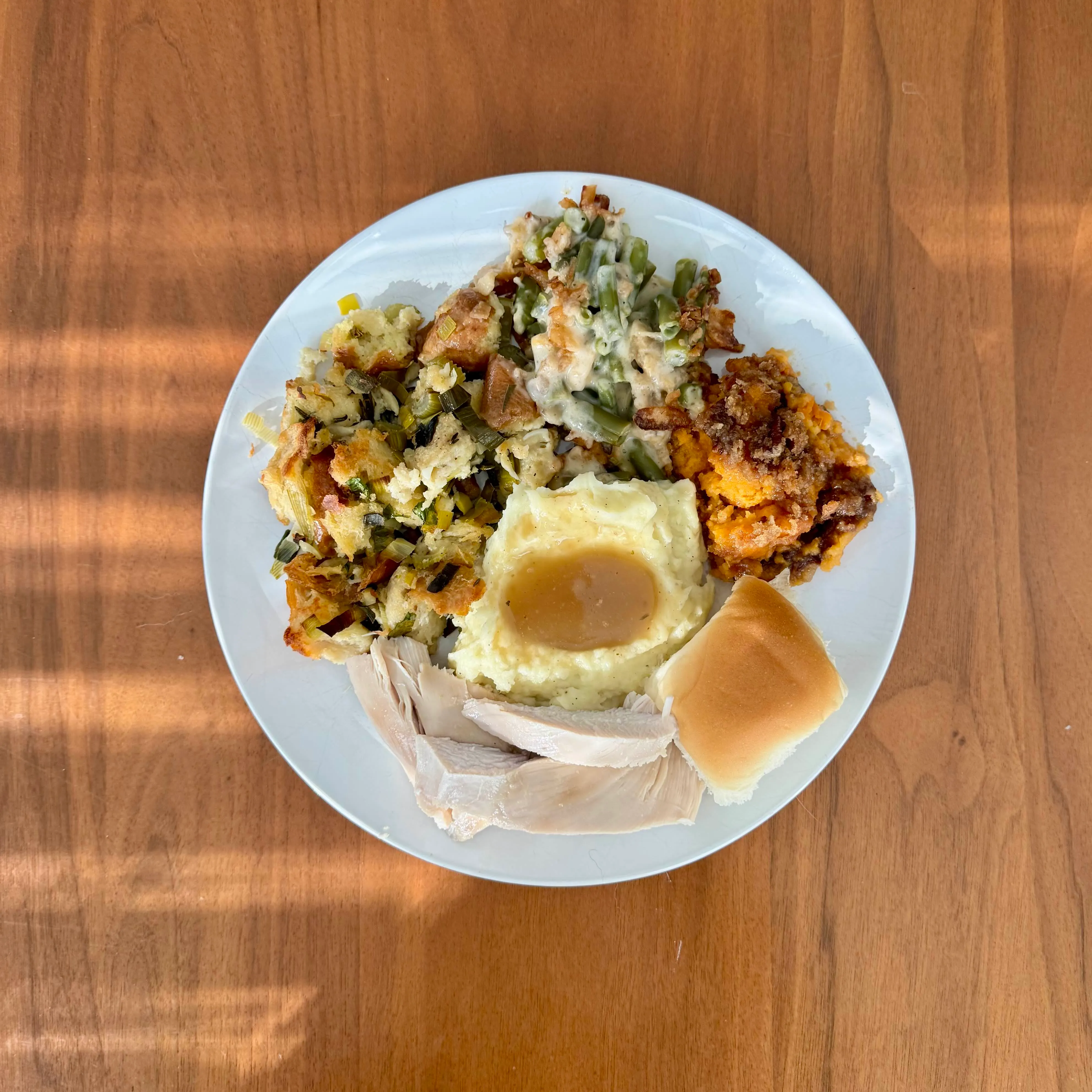 A leftover Thanksgiving plate - stuffing, mashed potatoes with a puddle of gravy, sweet-potato casserole, green bean casserole, and sliced turkey underneath.