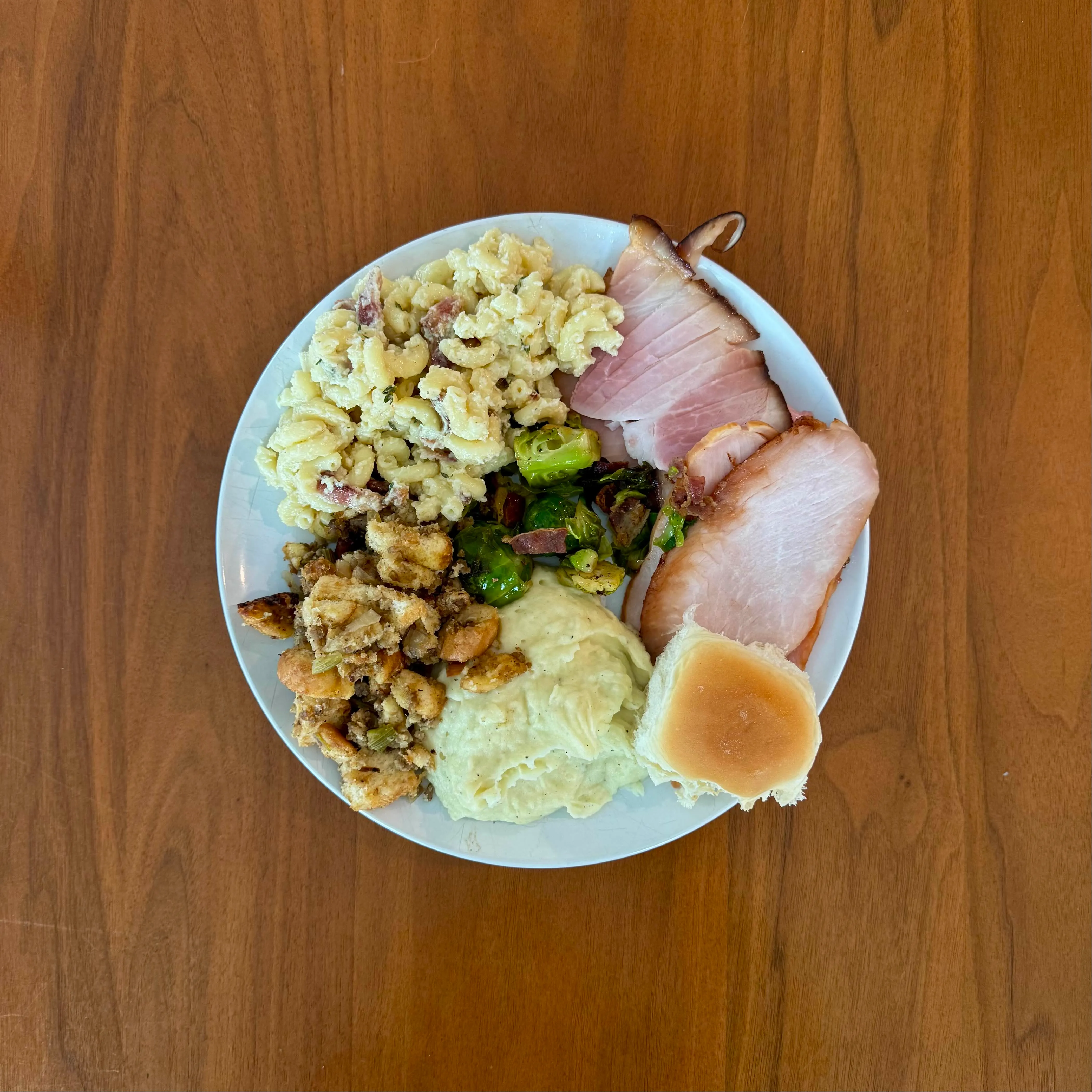 Day-three leftovers - slices of pit ham, cavatappi mac and cheese, a scoop of stuffing, mashed with gravy, and a roll - because there was still a fridge full of it.