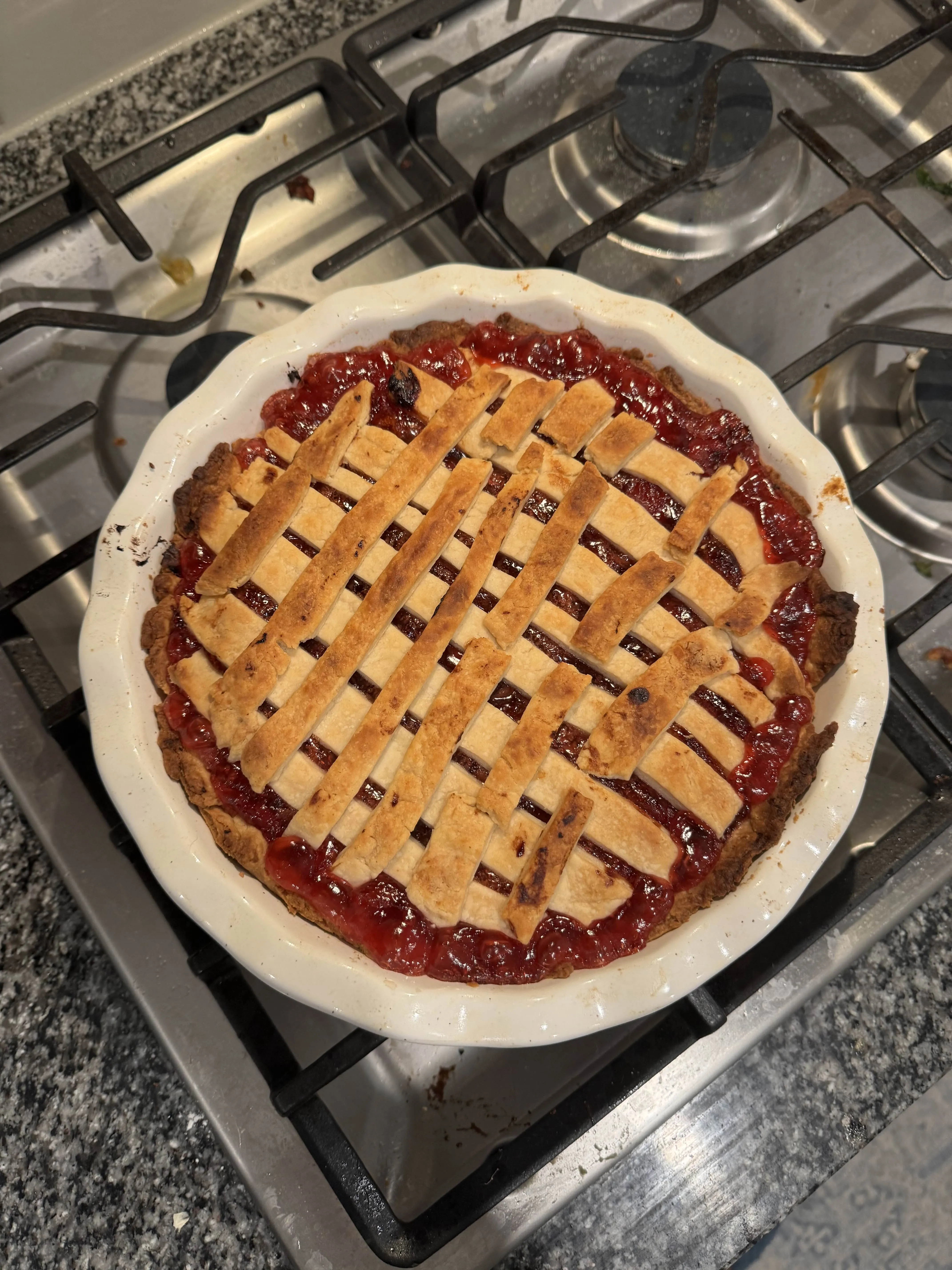 A lattice-top cherry pie cooling on the stove, the crust golden-brown and the red filling bubbling through the gaps.