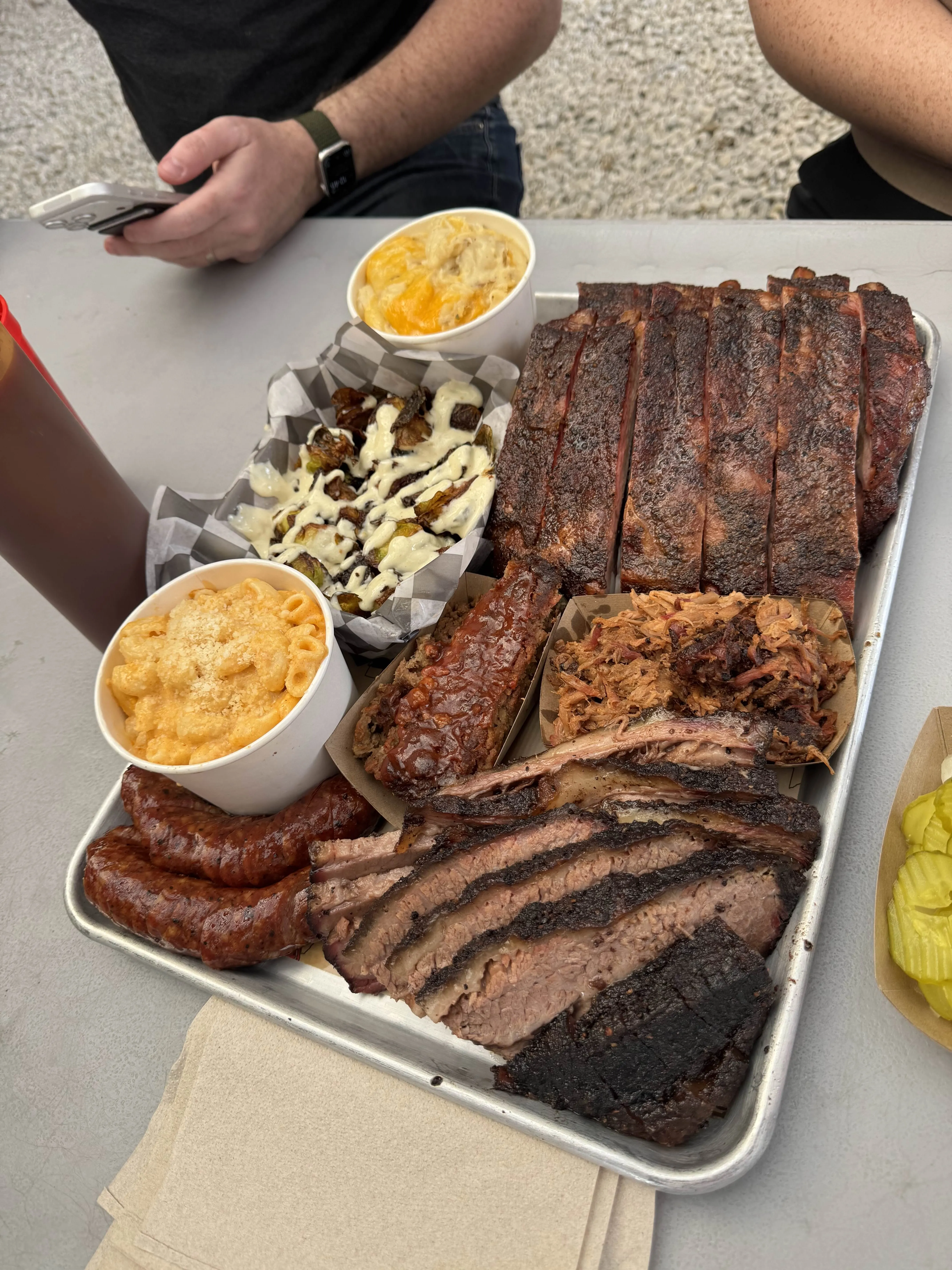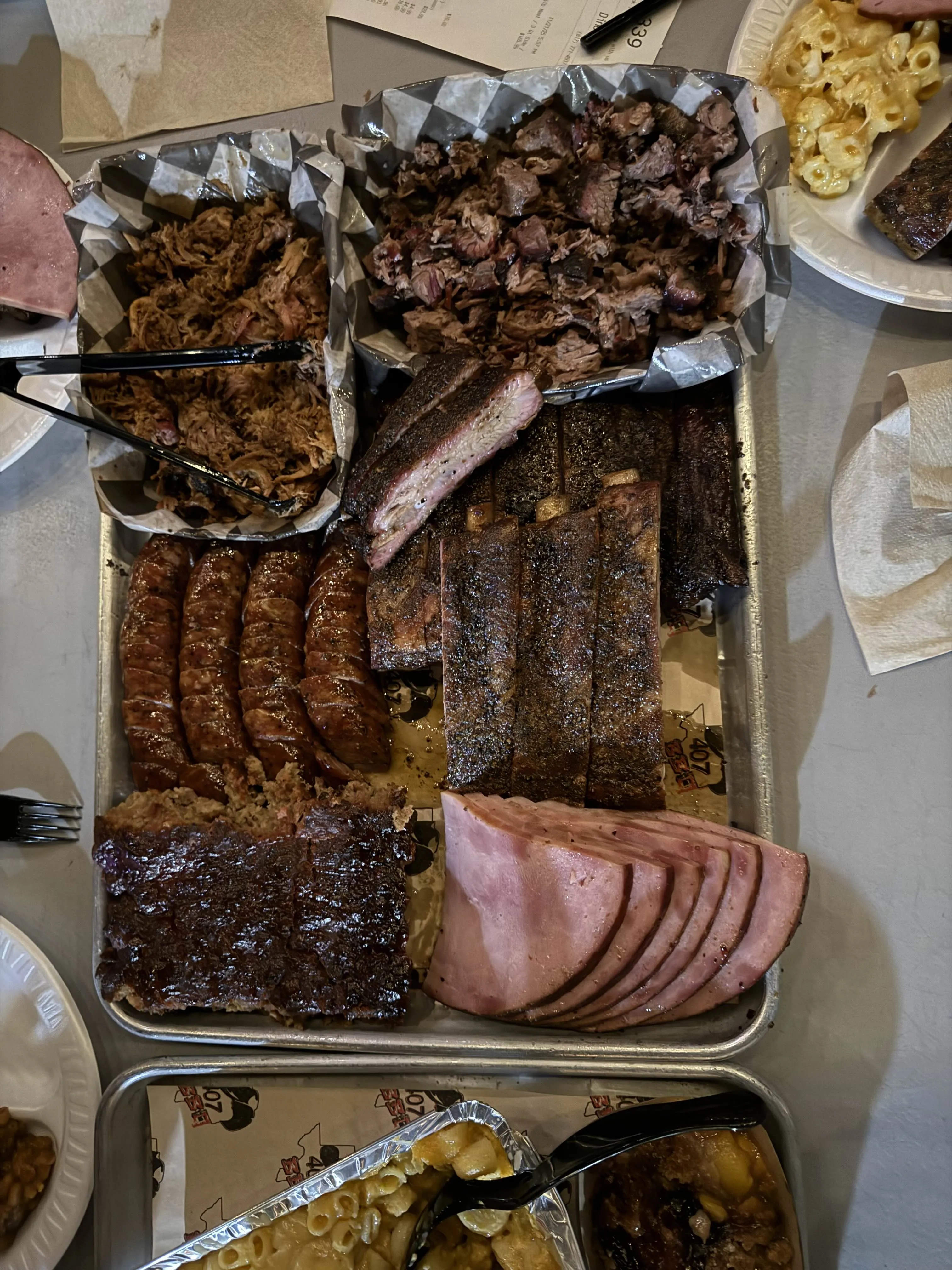 A metal tray heaped with brisket, pulled pork, smoked sausage, ribs, and thick-cut ham, with mac and cheese on the side - a Saturday road-trip stop.
