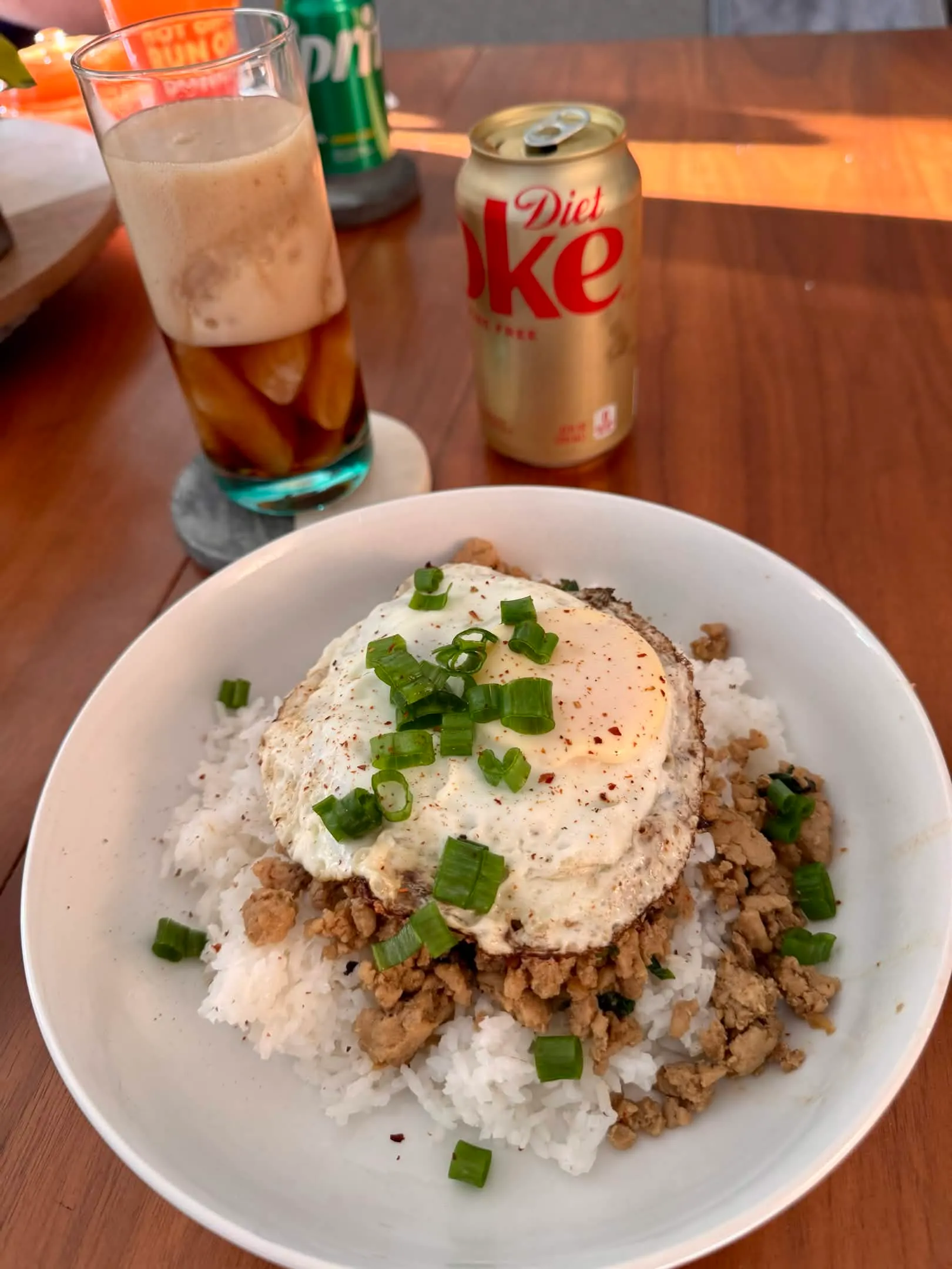 A ground-chicken rice bowl with a fried egg, a pile of scallions, and a tall glass of coke float to wash the whole thing down.